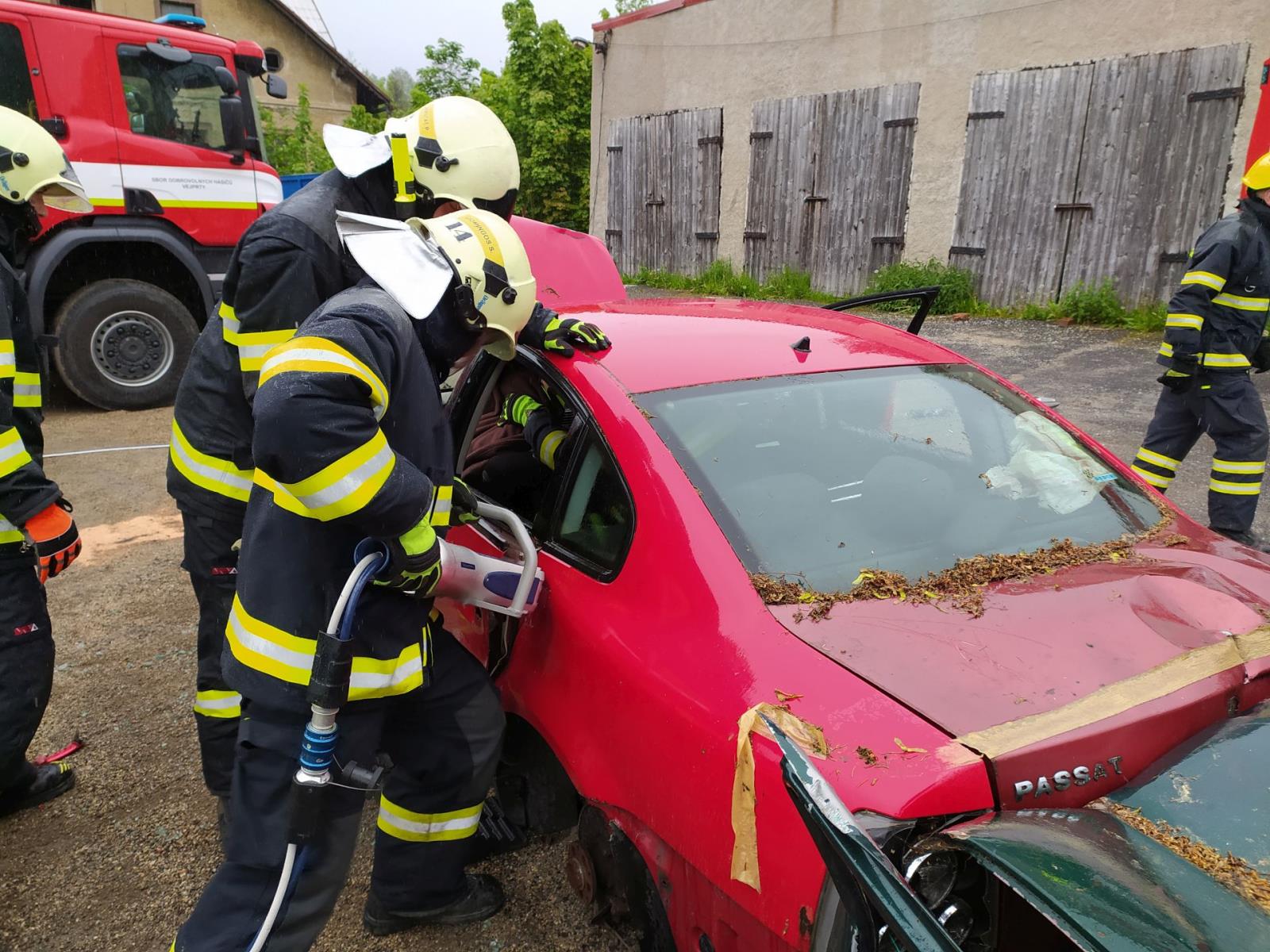 Profesionální hasiči s dobrovolnými cvičili vyprošťování z havarovaných aut.