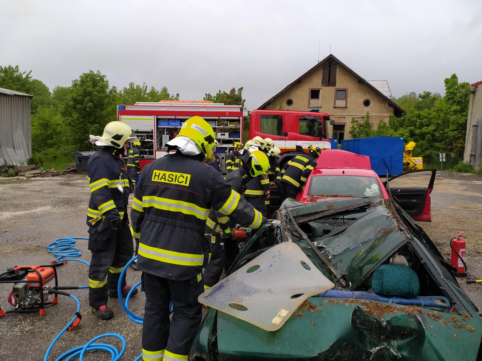 Profesionální hasiči s dobrovolnými cvičili vyprošťování z havarovaných aut. Hasiči ve Vejprtech, okres Chomutov, společně cvičili...
