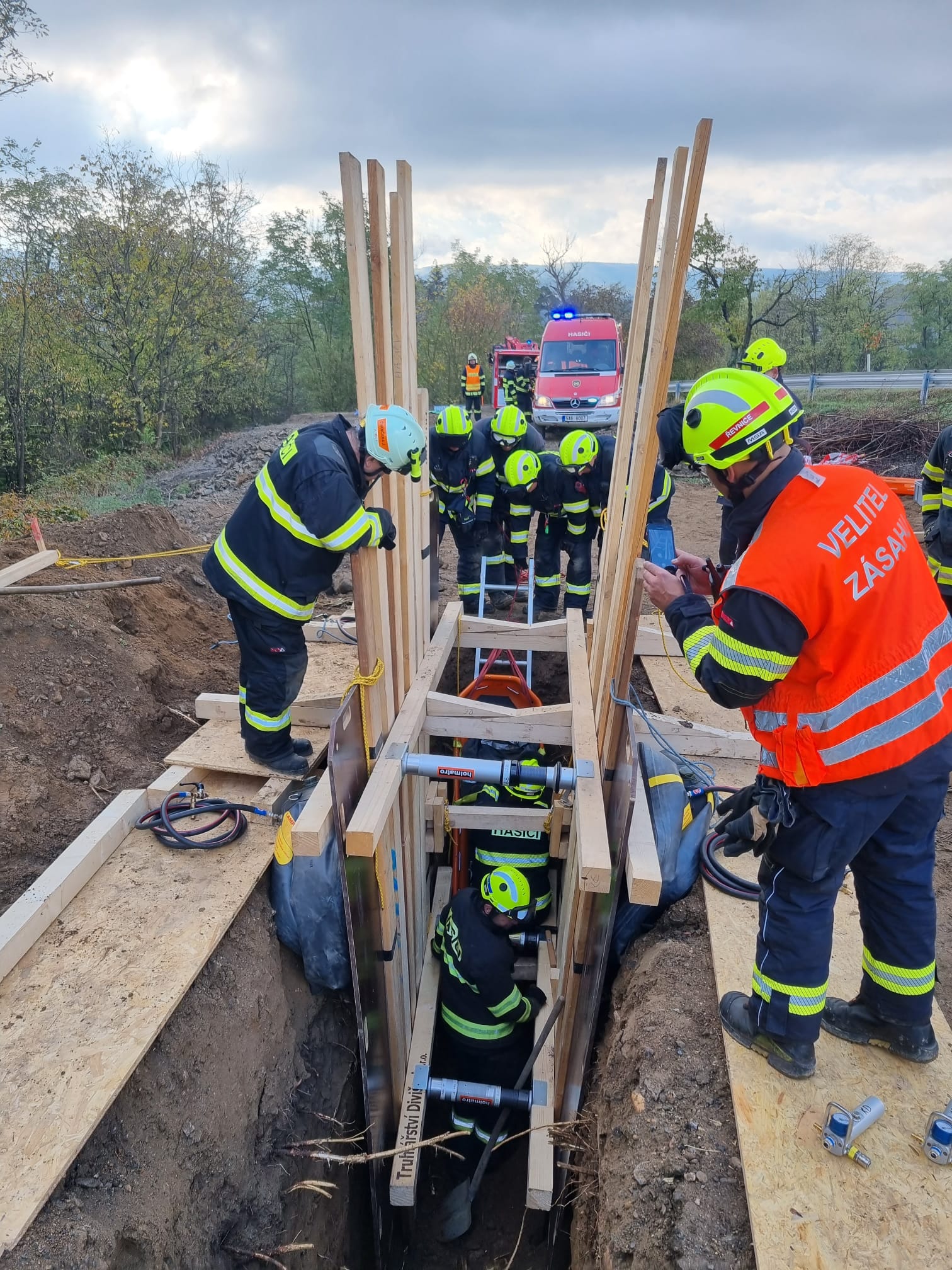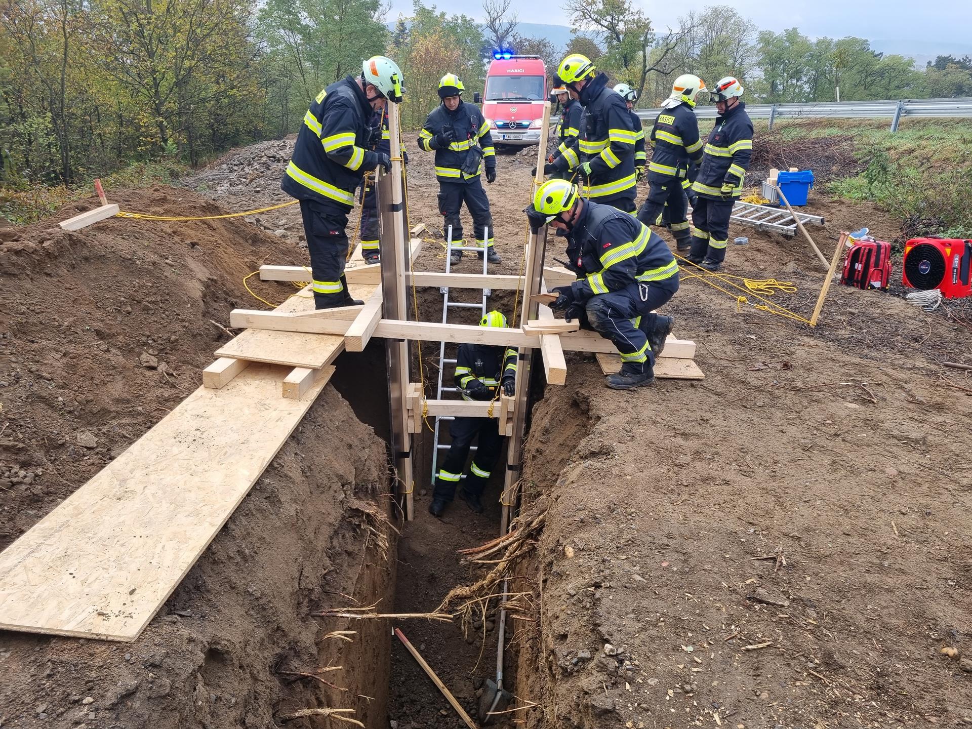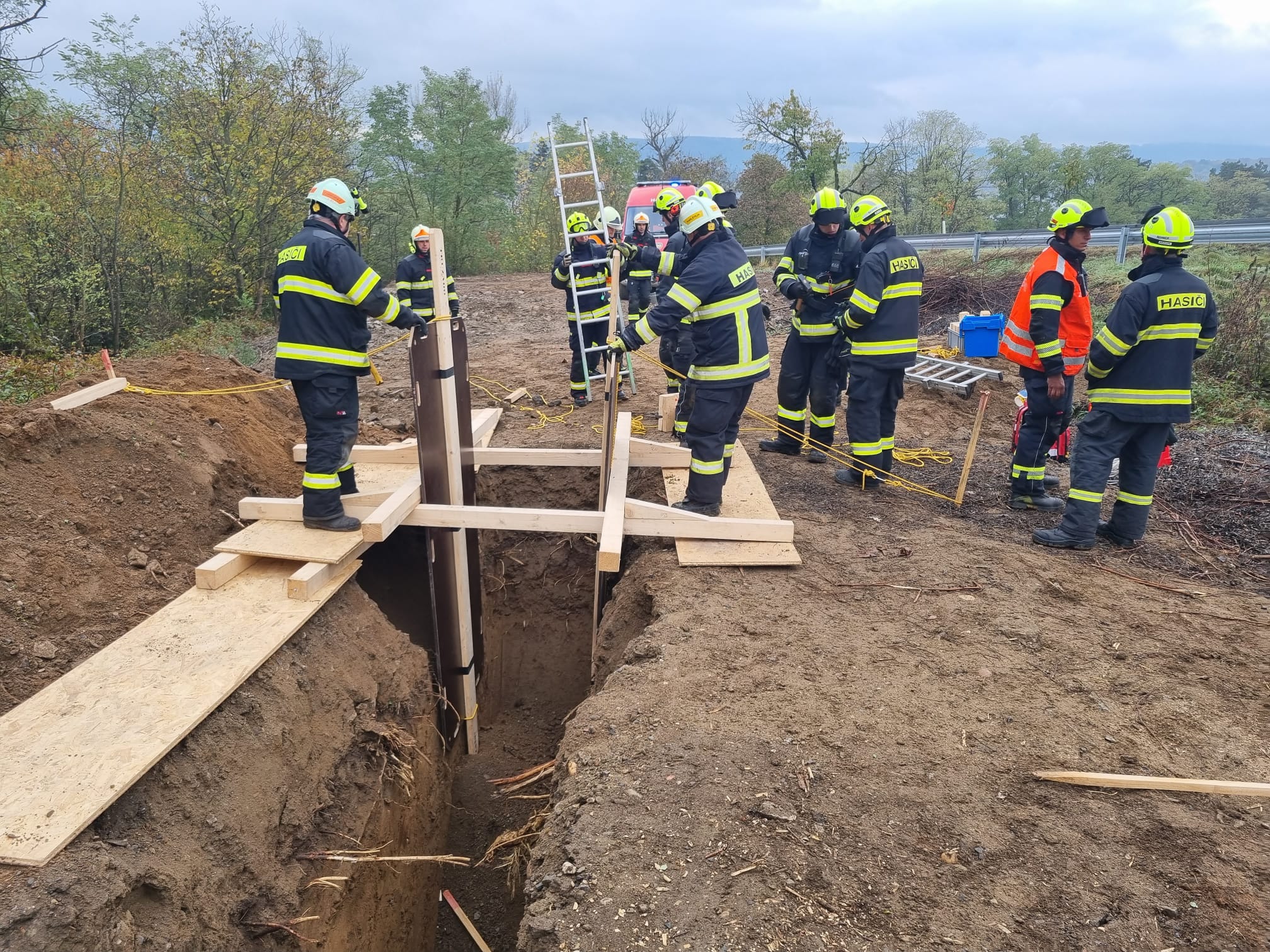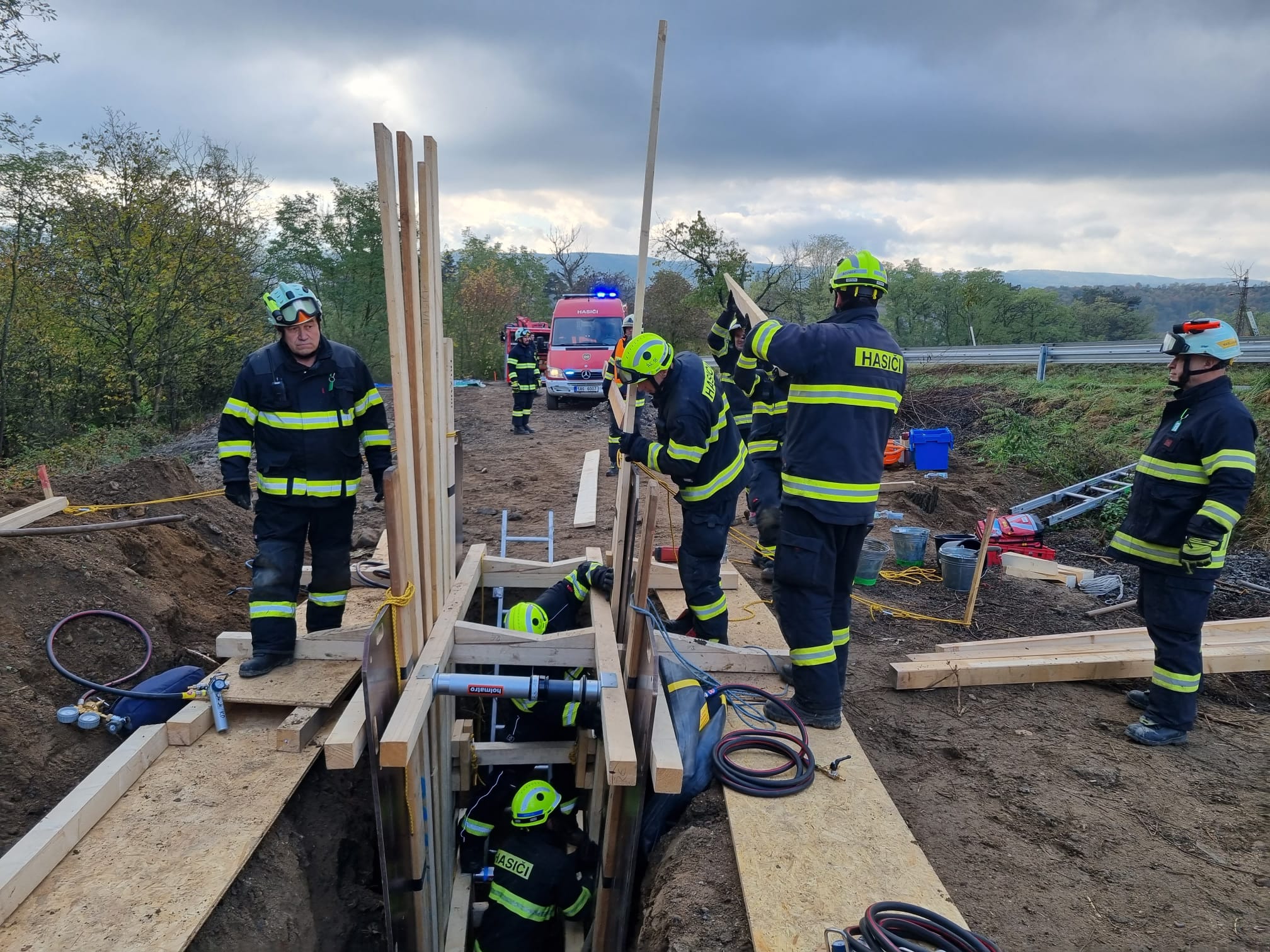 Po příjezdu na místo bylo zjištěno, že osoba se nachází v hloubce přes tři metry a nejeví známky života. Řevničtí hasiči nejprve zapažili výkop pomocí výdřevy z malé stabilizační sady, na kterou navázalo zajištění pomocí prostředků ze speciálního technického kontejneru z centrální hasičské stanice Kladno.
