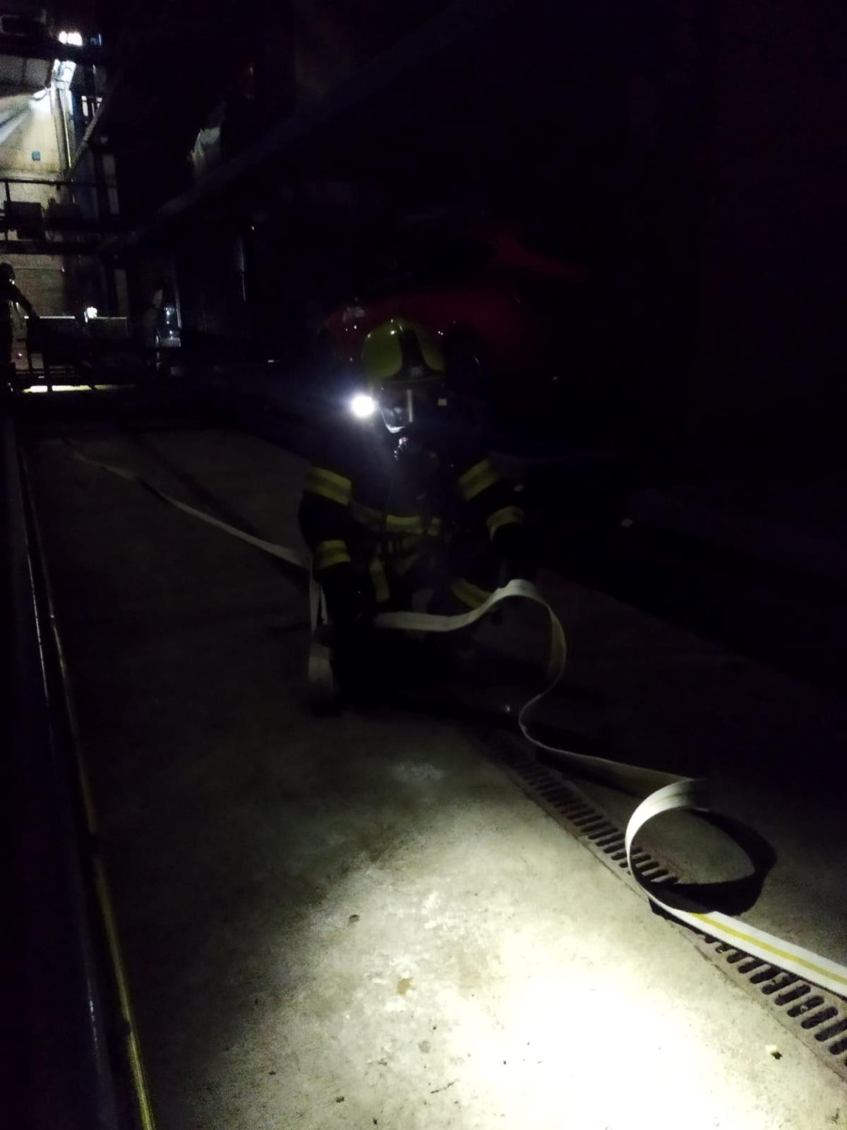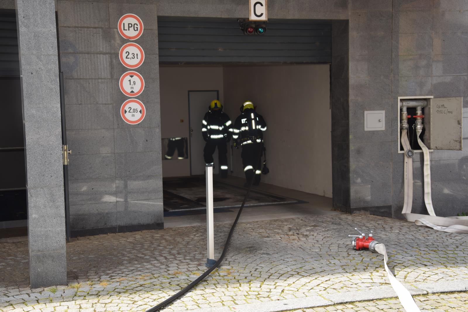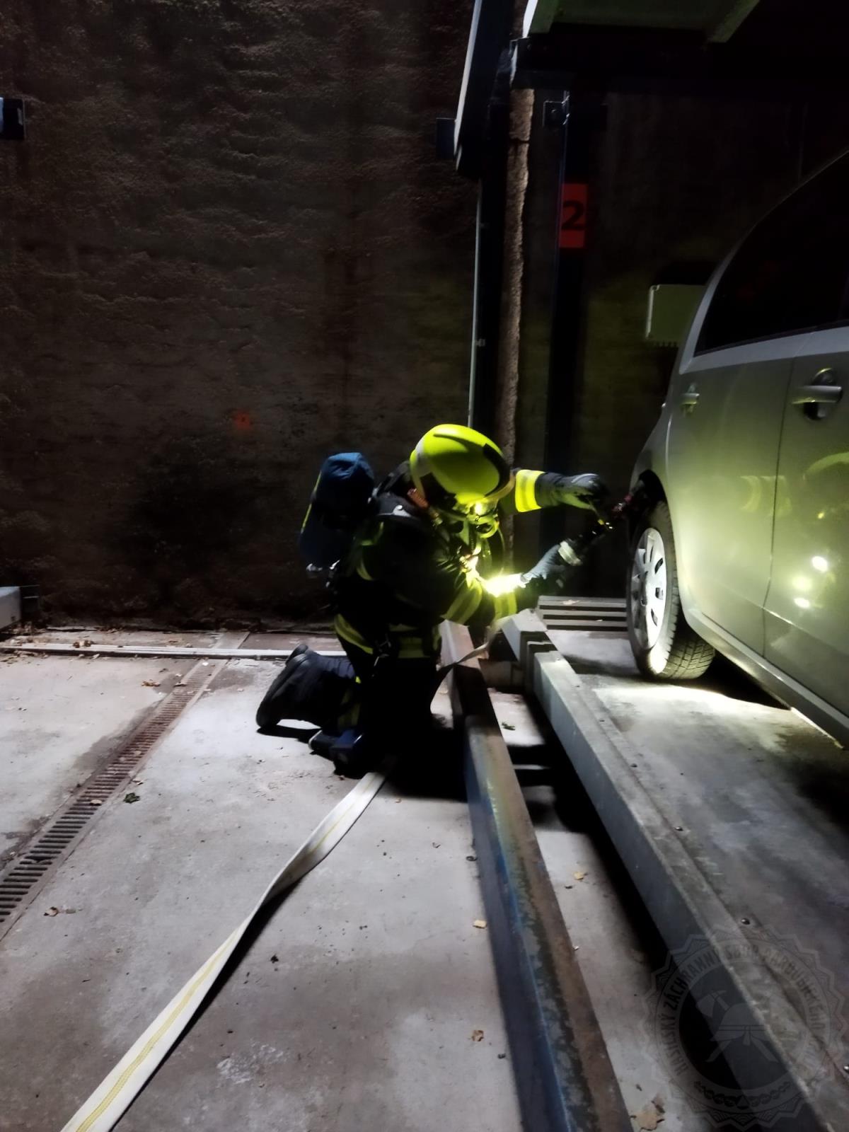 Velitel nechal vytvořit dvě skupiny, které vyrazily na průzkum bytového domu nad objektem garáží kvůli možnému zakouření, informování, aby obyvatelé či nájemci domu nevětrali okny. Další hasiči likvidovali plameny. Požár hasiči dostali pod kontrolu a postupně uhasili všechna ohniska.