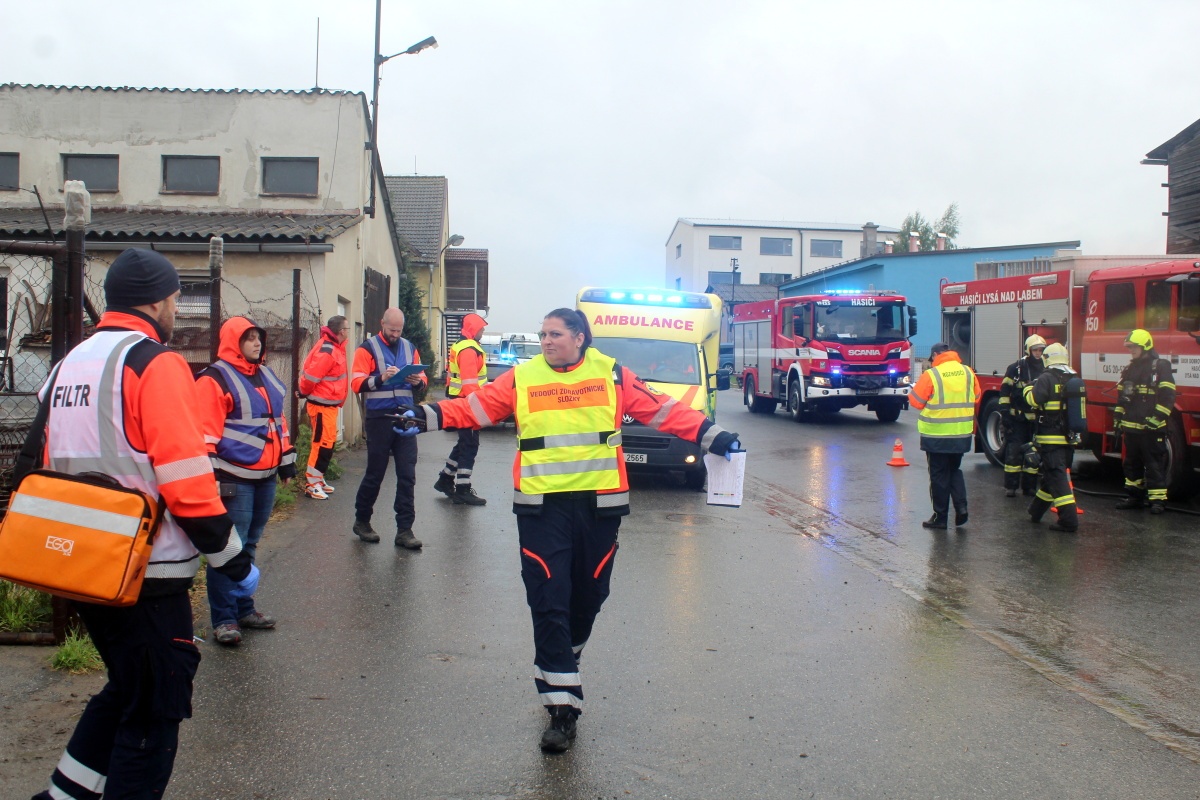 Na místo byly povolány jednotky z hasebního obvodu územního odboru Nymburk. Poplach se rozezněl na stanicích v Milovicích a Nymburce. K události byla povolána také místní dobrovolná jednotka Lysá nad Labem. Po příjezdu hasičů na místo zásahu bylo provedeným průzkumem zjištěno, že se jedná o výbuch bez následného požáru. V objektu a okolí se nacházejí různě zraněné osoby a spousta neznámých látek různých fyzikálních a chemických vlastností, které jsou umístěny neroztříděné, v neodpovídajících, neoriginálních, neoznačených a poškozených obalech různé velikosti (kontejnery, sudy, lahve, různé nádoby apod.). Velitel zásahu vyhodnotil, že jde zřejmě o chemikálie a nástroje potřebné pro výrobu drog a zjištěné skutečnosti upřesnil operačnímu středisku. To, podle typové činnosti STČ 17A/IZS – Nález nelegální drogové laboratoře, povolalo další dotčené složky. Zároveň byla na místo povolána z nymburské centrální stanice posilová jednotka k provedení dekontaminace a Chemická laboratoř Kamenice k měření škodlivin a odběru vzorků.