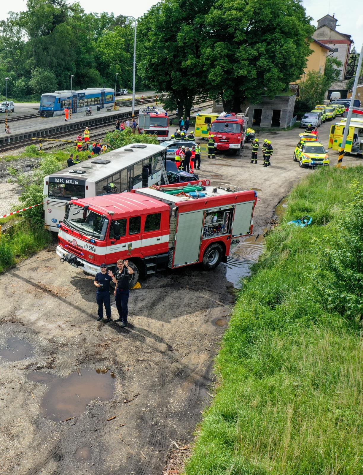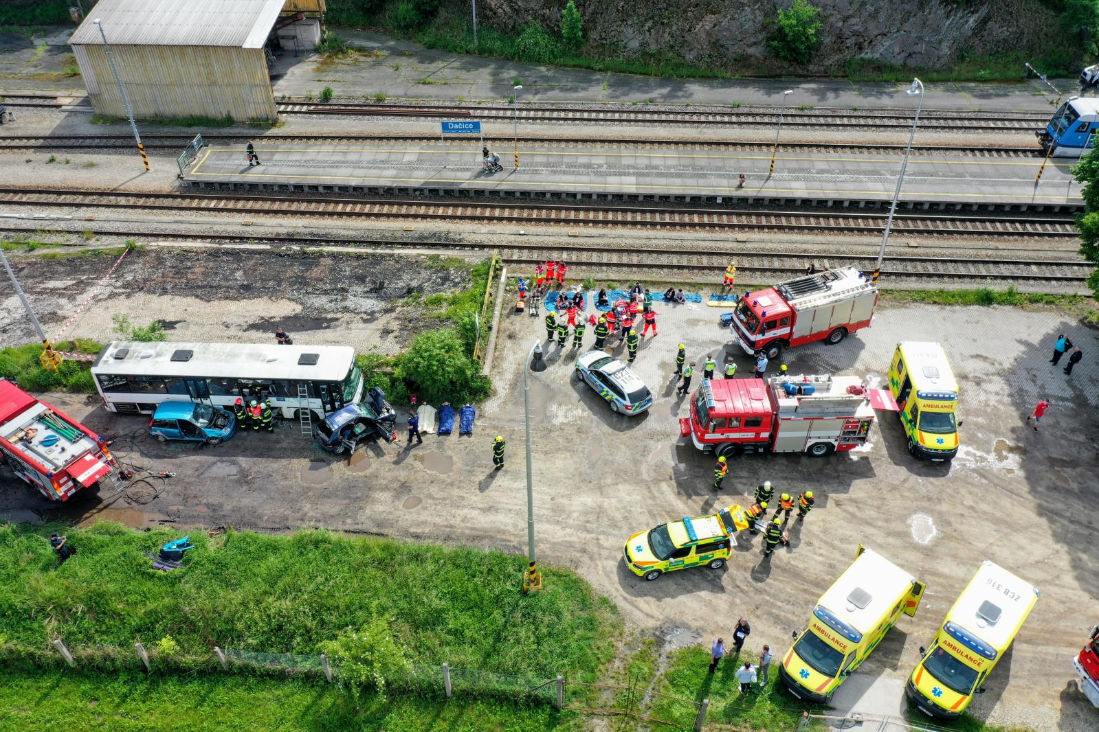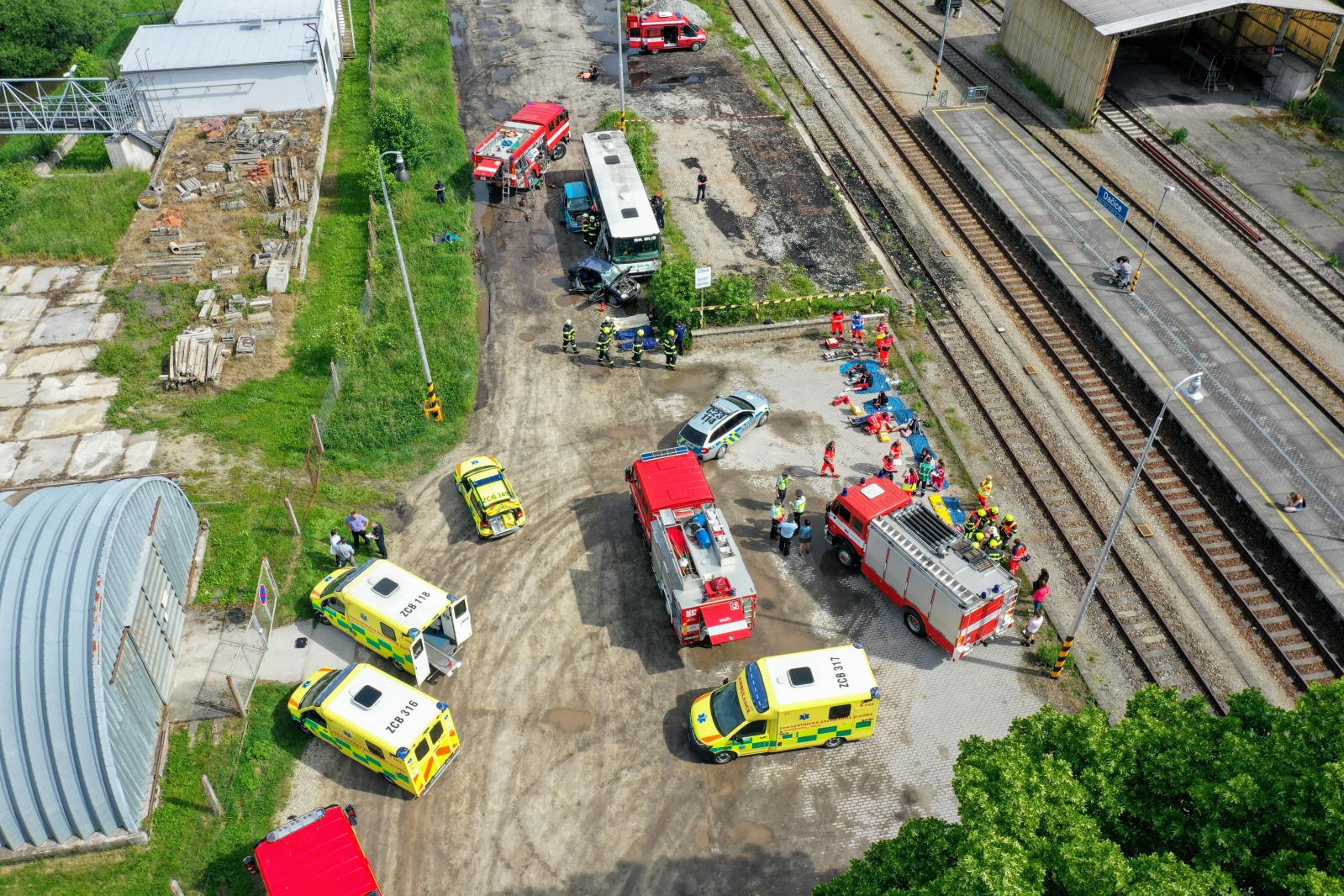 V této situaci začíná taktické cvičení složek IZS, které si klade za cíl prověřit součinnost složek integrovaného záchranného systému na všech úrovních řízení při společném zásahu u dopravní nehody s velkým počtem zraněných. Při cvičení se také ověřovaly stanovené postupy a činnosti jednotlivých složek podle pravidel, která jsou pro podobné mimořádné události určena – soubory typové činnosti složek IZS při společném zásahu u dopravní nehody a zásah složek IZS u mimořádné události s velkým počtem zraněných.DJI_0135.JPG