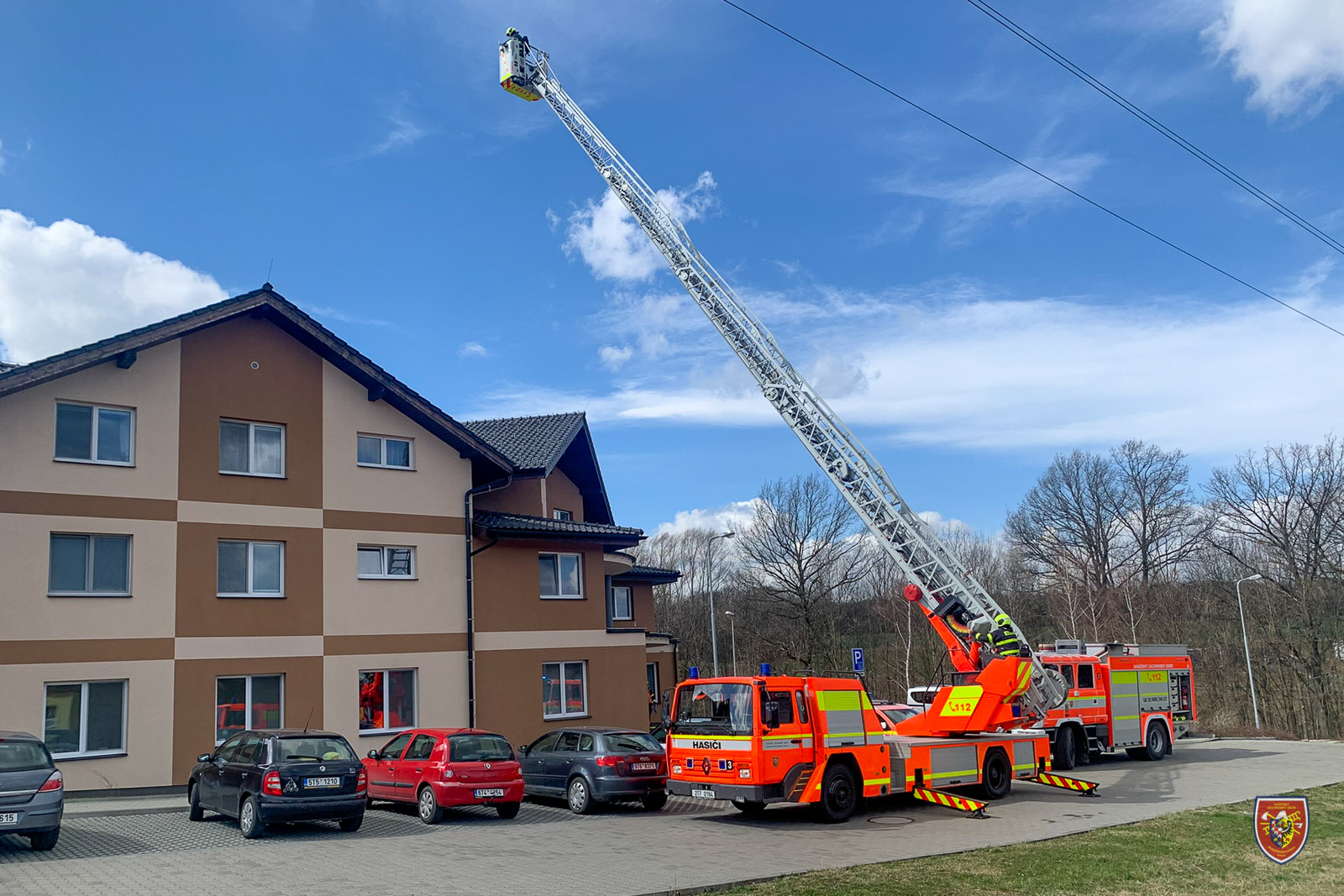 Pro případný zásah z vnějšku byl na místě rovněž ustaven automobilový žebřík.