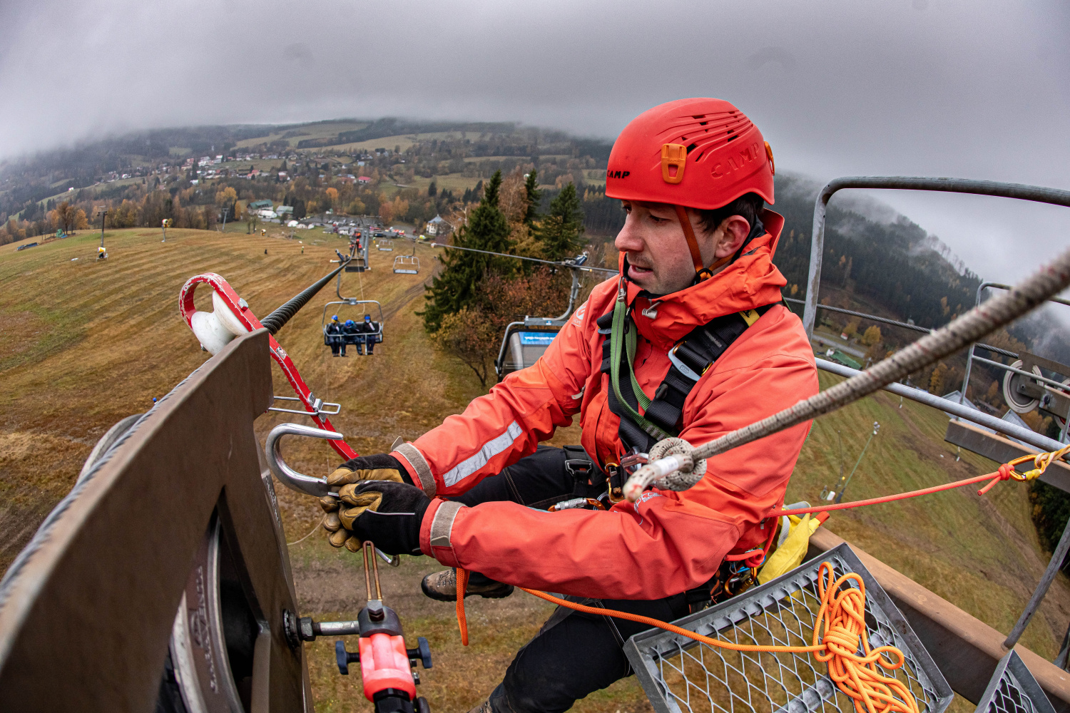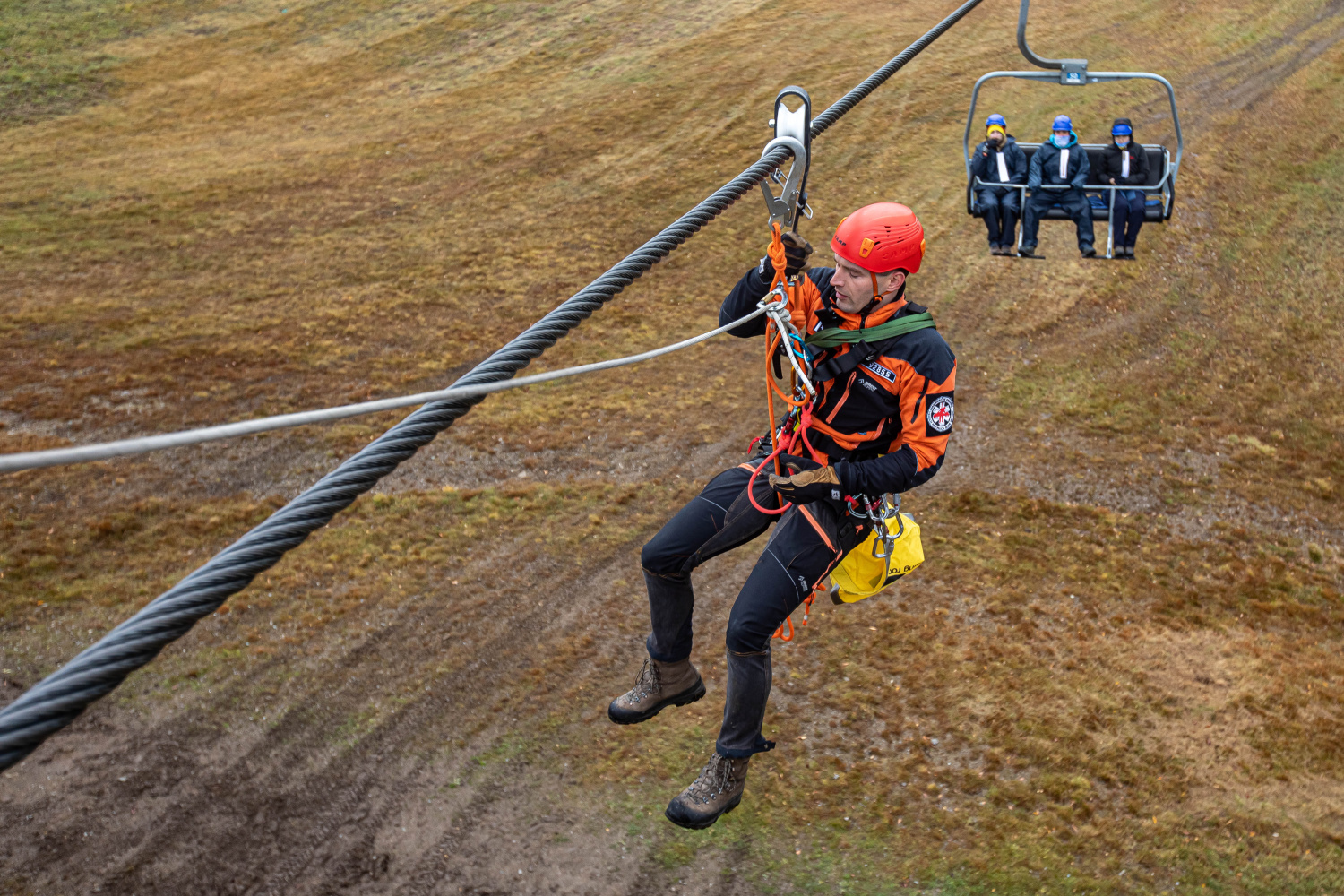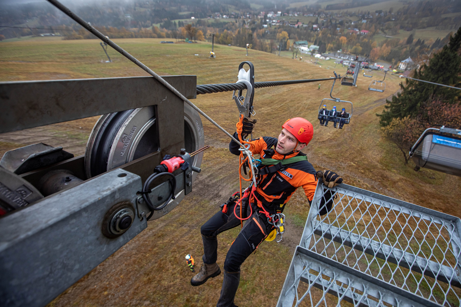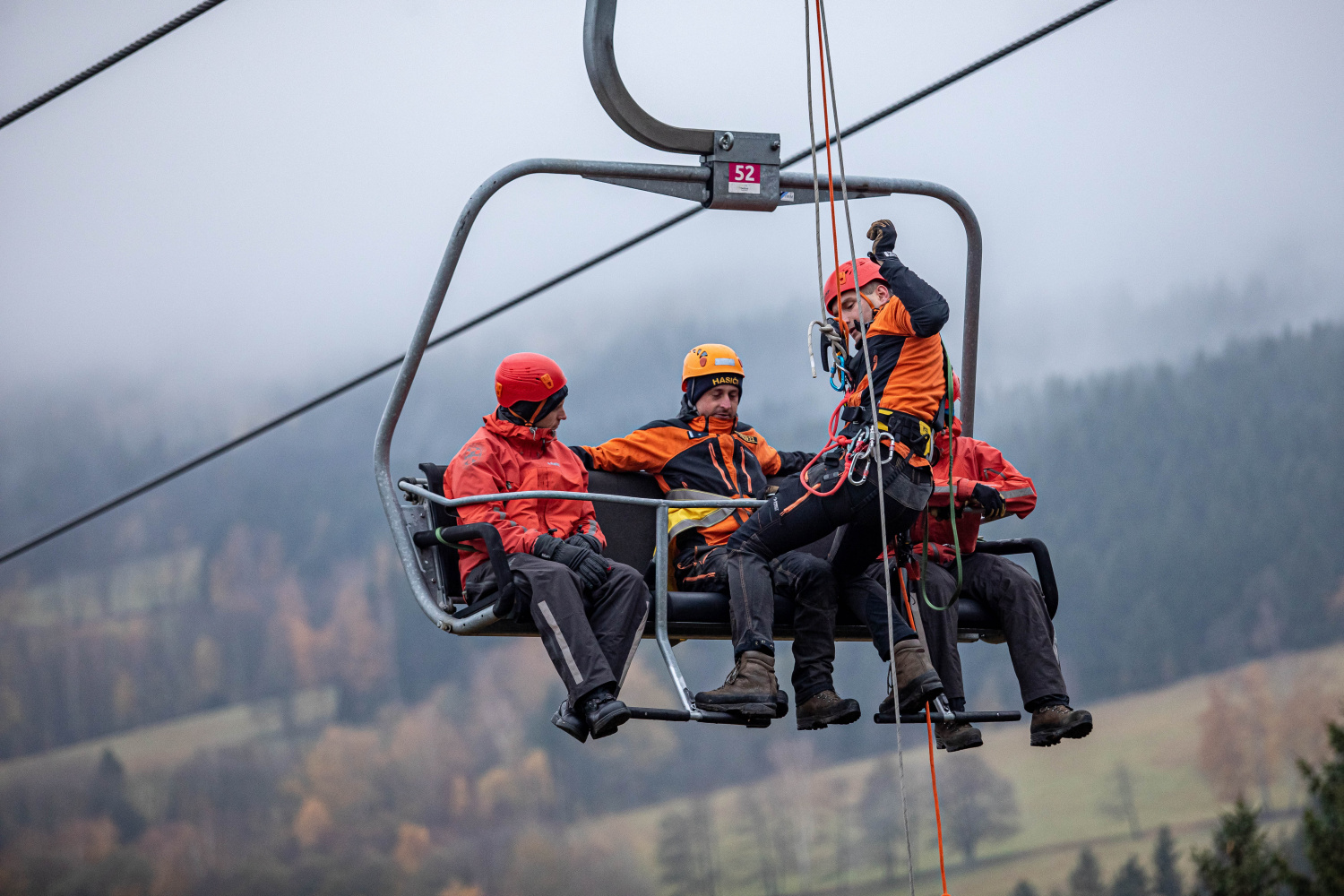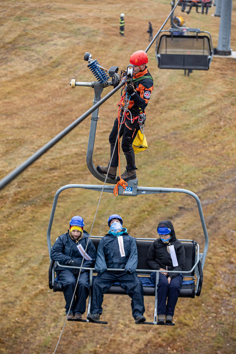 Další část cvičení se zaměřila na záchranu osob z výšky, konkrétně ze sedaček lanové dráhy. Jednotlivé úseky lanovky obsadily lezecké skupiny profesionálních hasičů ze stanic Rychnov nad Kněžnou, Náchod, Hradec Králové a Trutnov. Skupiny se speciálně proškolenými příslušníky pro záchranu z výšky a nad volnou hloubkou vyjížděly na místo na výzvu z operačního střediska ze svých dislokací, tím byly zároveň ověřeny dojezdové časy pro případ reálné mimořádné události. Pomocí lezecké techniky se dostali hasiči k figurantům a postupně je spouštěli zajištěné na svah.