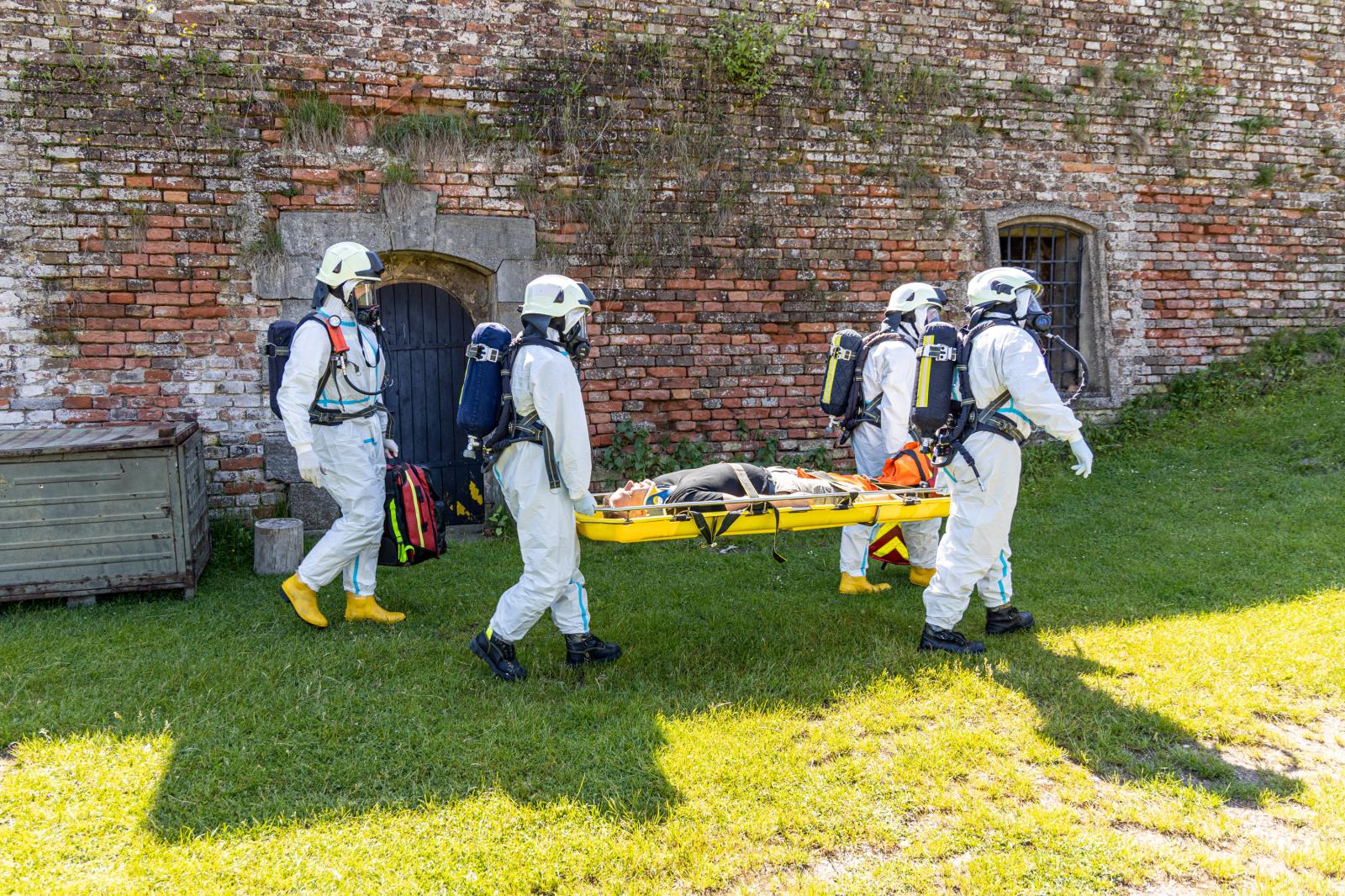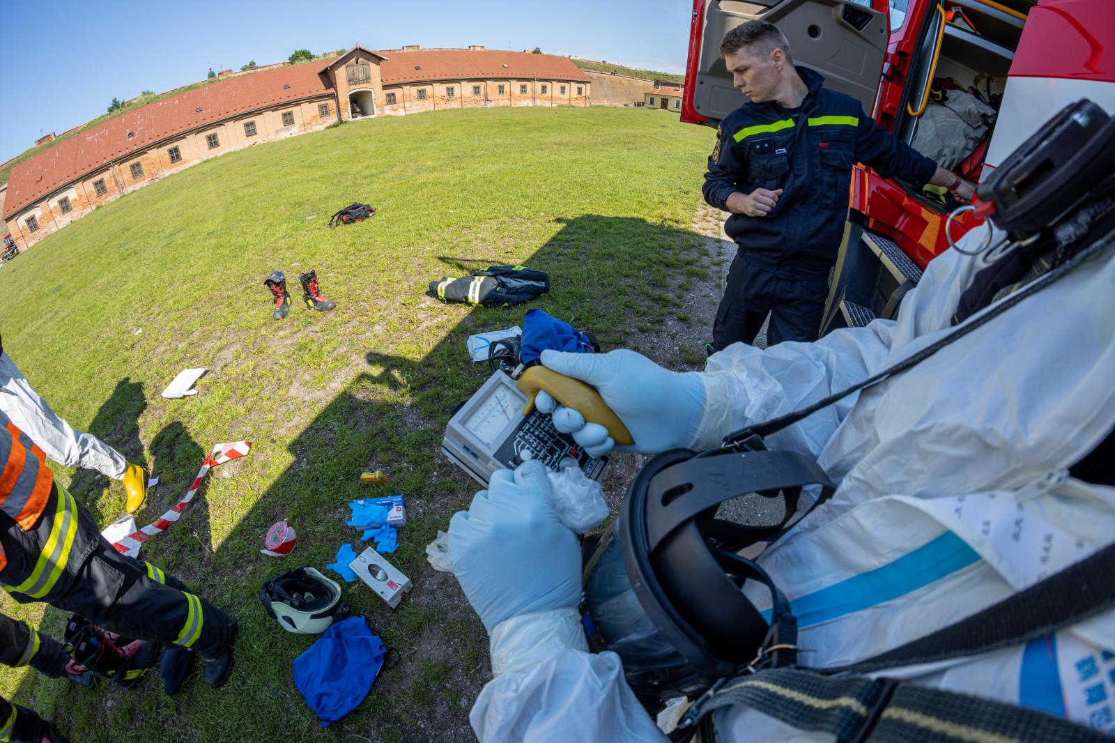 Krajské operační a informační středisko přijalo fiktivní oznámení o zranění osoby v prostorách pevnosti s tím, že v blízkosti ležícího člověka je otevřený kontejner označený symbolem radioaktivity. Přivolaní profesionální hasiči ze stanice Jaroměř z důvodu záchrany člověka v blízkosti možného ZIZ prováděli činnost s použitím dýchacích přístrojů, ochranných oděvů a ochranných rukavic. Hasiči museli transportovat zraněnou osobu, vymezili nebezpečnou a bezpečnostní zónu. Dále provedli kontrolu kontaminace zraněné osoby, průzkumné skupiny, materiálů a techniky.