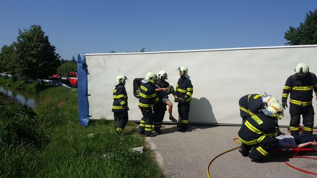 Cestující schopni pohybu sami vylézají rozbitým bočním sklem na levý bok převráceného autobusu. Odtud jim hasiči pomáhají slézt po žebříku na zem. Další zraněné je potřeba vyprostit z útrob havarovaného vozidla. Jsou proto zpřístupněny vylézací střešní otvory, kterými budou na nosítkách vynášeni a předáni k ošetření zdravotníkům. První zraněný je takto vyproštěn po devatenácti minutách od zahájení zásahu, poslední pak po čtyřiceti minutách. Jako poslední je vyprošťován mrtvý řidič.