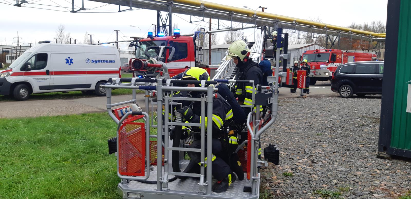 Obsluha oznamuje mimořádnou událost na tísňovou linku č. 5555. Ohlašovna požáru přijímá zprávu o události a vyhlašuje poplach. Vysílá na místo události HZS podniku Synthesia, a.s., poruchovou službu elektro, zásahovou jednotku ostrahy podniku a dispečera podniku. Dispečer oznamuje výjezd jednotky k mimořádné události na Krajské operační a informační středisko HZS Pardubického kraje a žádá o pomoc jednotku HZS Pardubického kraje. Jednotky přijíždí na místo zásahu ze dvou stran a zastavují v dostatečné vzdálenosti tak, aby mohly okamžitě přesunout požární techniku v případě nebezpečí výbuchu. Hasiči zasahují v dýchací technice i v oblecích ISOTEMP 2000.