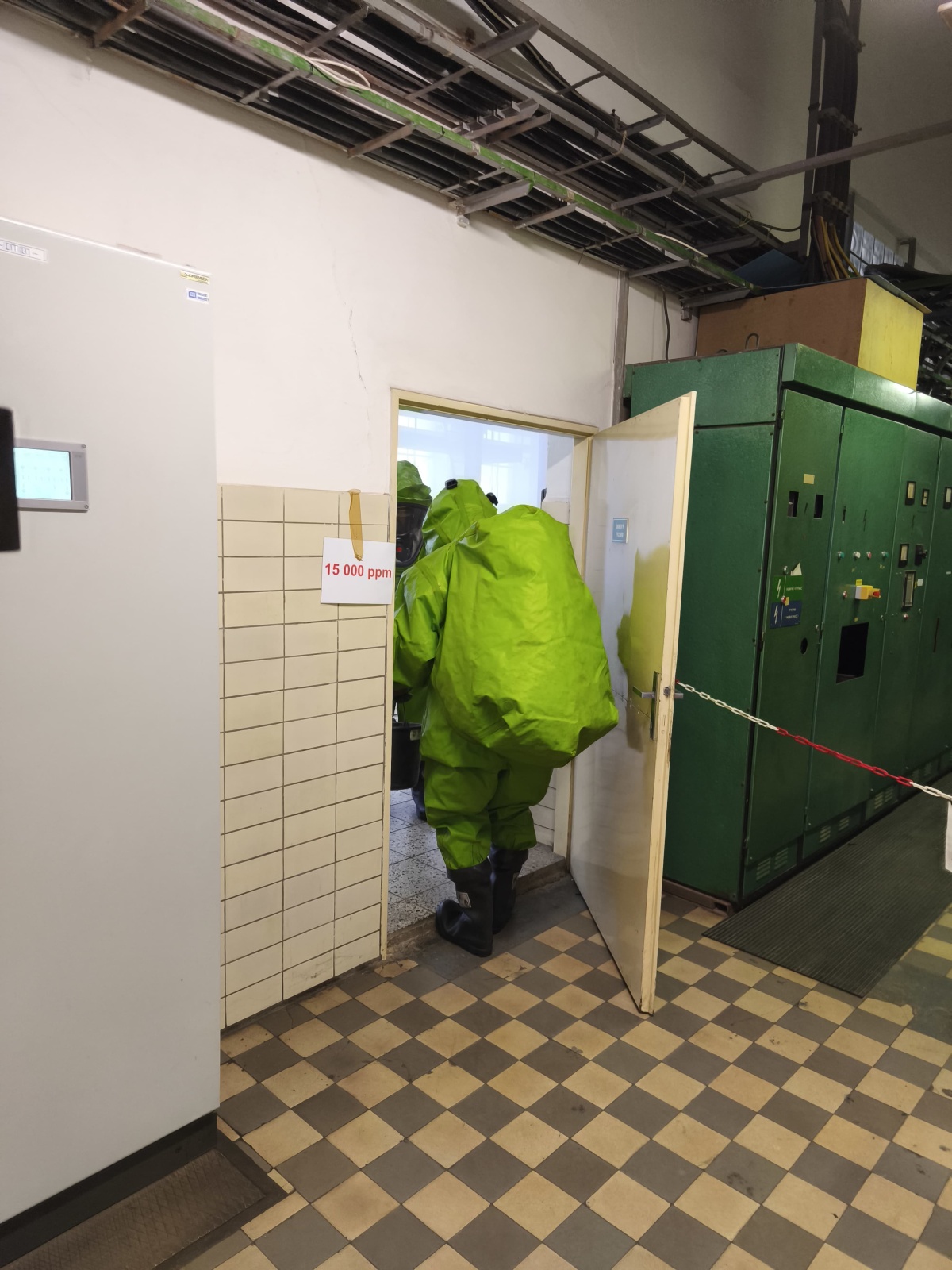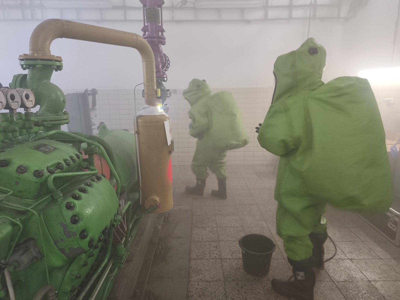 Nejnáročnější část zásahu probíhala uvnitř kompresorovny. Zde panovaly extrémní podmínky – vysoká koncentrace čpavku, stísněné prostory a podezření na uvězněný personál. Hasiči nejprve připravili dekontaminační stanoviště s mobilní sprchou a nástupním prostorem, poté se vydali dovnitř.