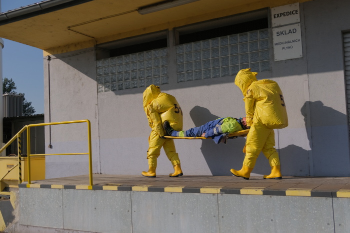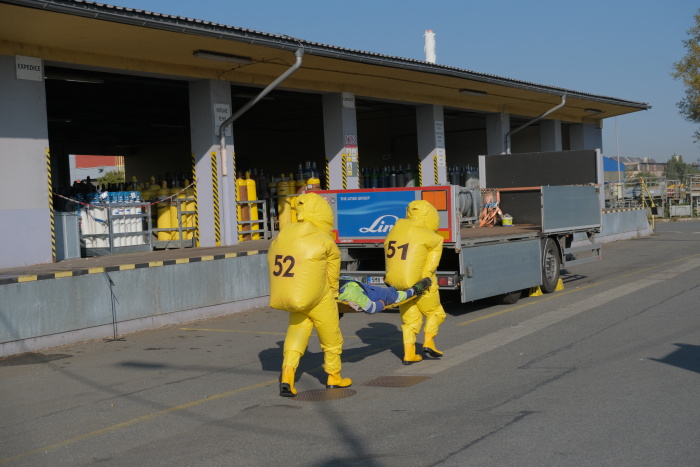 Profesionální hasiči nalezli při průzkumu v přetlakových protichemických oblecích bezprostředně po příjezdu do areálu zaměstnance Linde v bezvědomí, vynesli jej na páteřní desce z nebezpečného prostoru, dekontaminovali tekoucí vodou a předali týmu ZZS MSK.