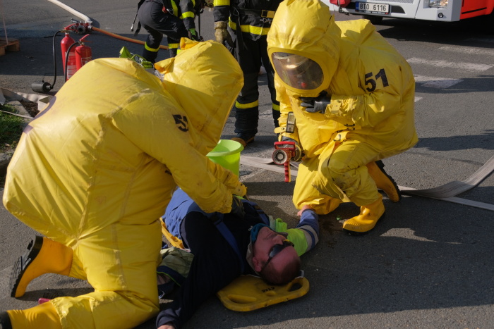 Hasiči museli v protichemických oděvech zachraňovat jednoho zaměstnance v bezvědomí a pak provizorně utěsnit otvor v plášti zásobníku se skrápěním okolí nehody vodou. Z areálu byly evakuovány téměř čtyři desítky osob.