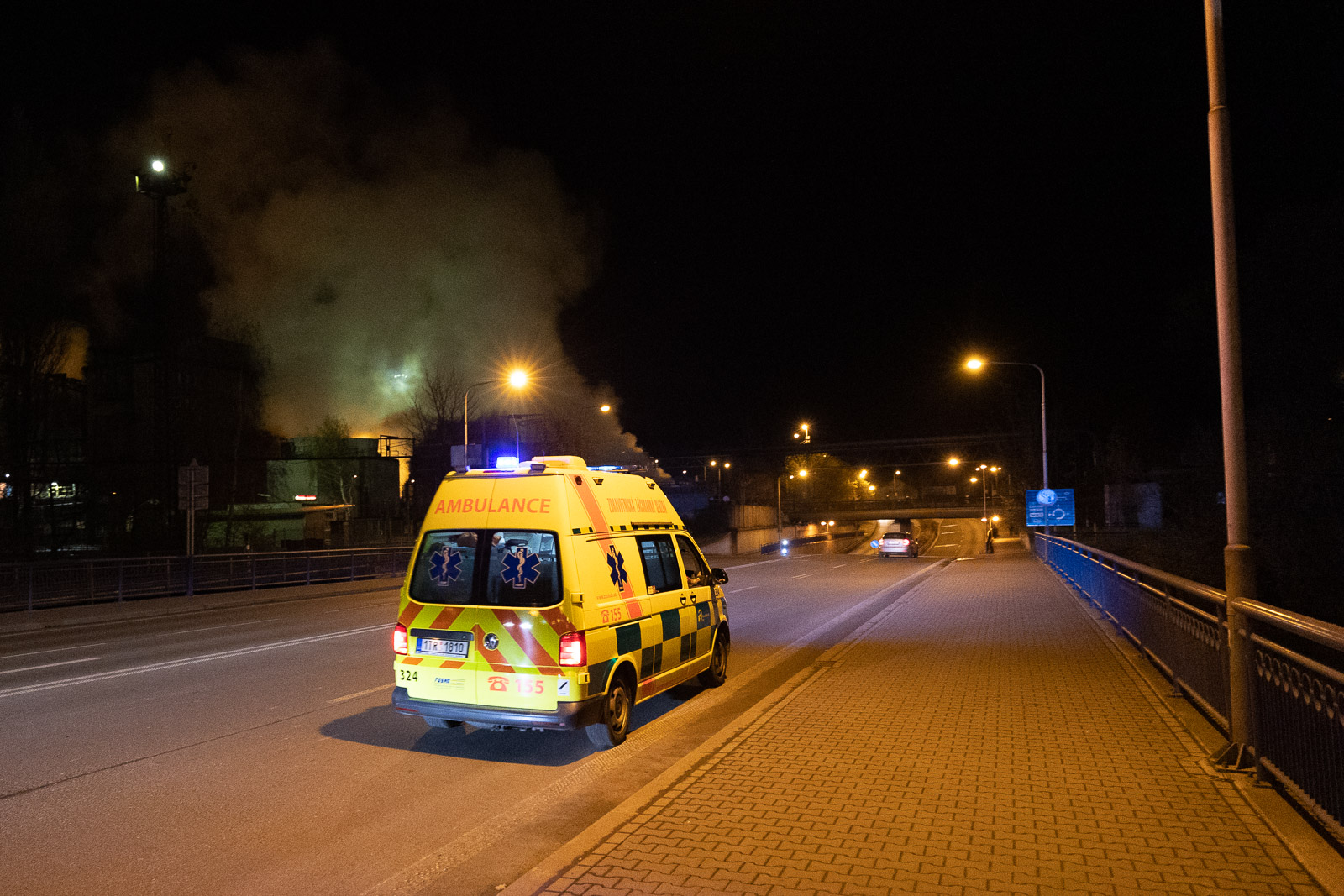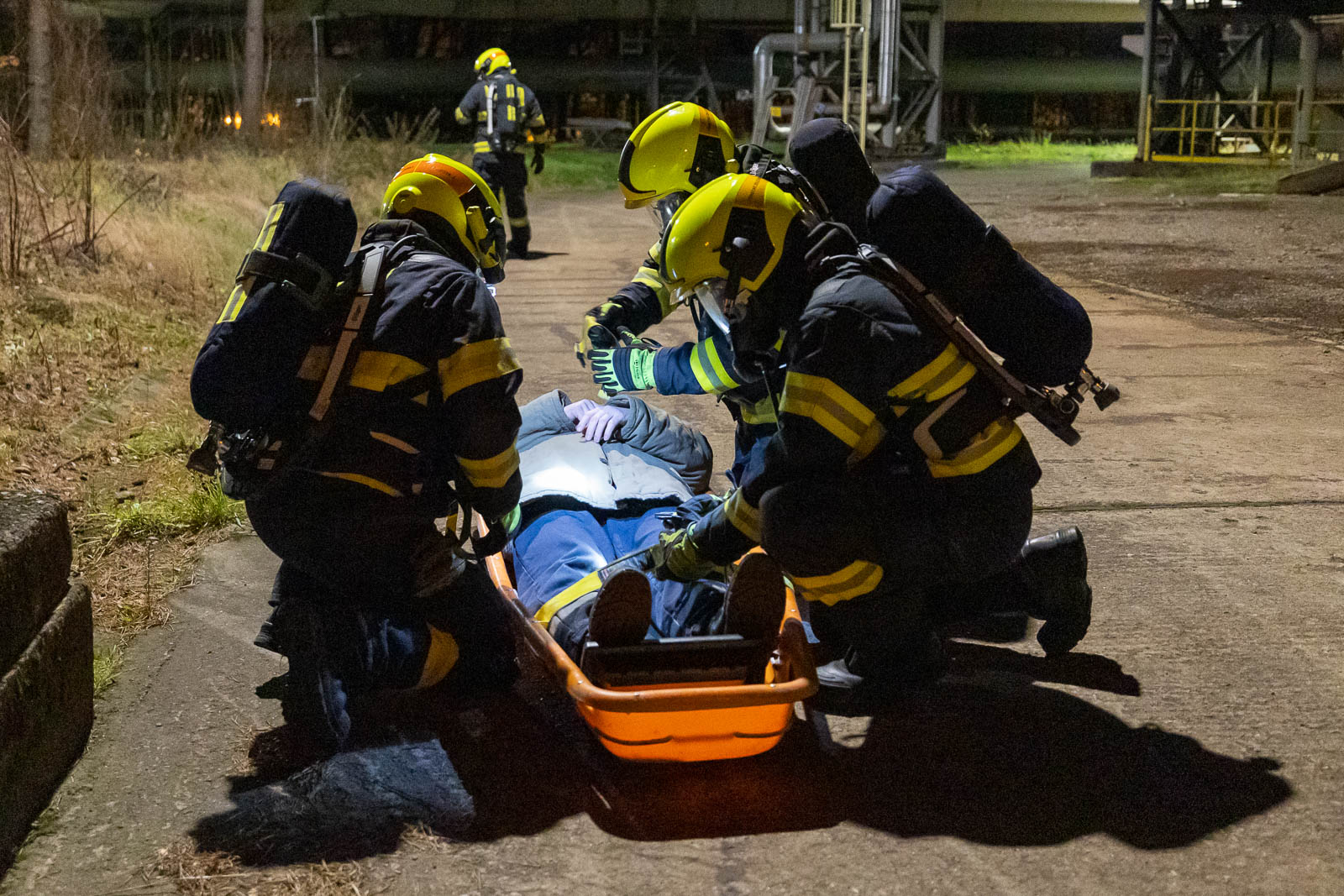 Hasiči vnikli do areálu plynojemu a na nosítkách odnesli nadýchaného pracovníka, kterému v bezpečném prostoru poskytli předlékařskou první pomoc.
