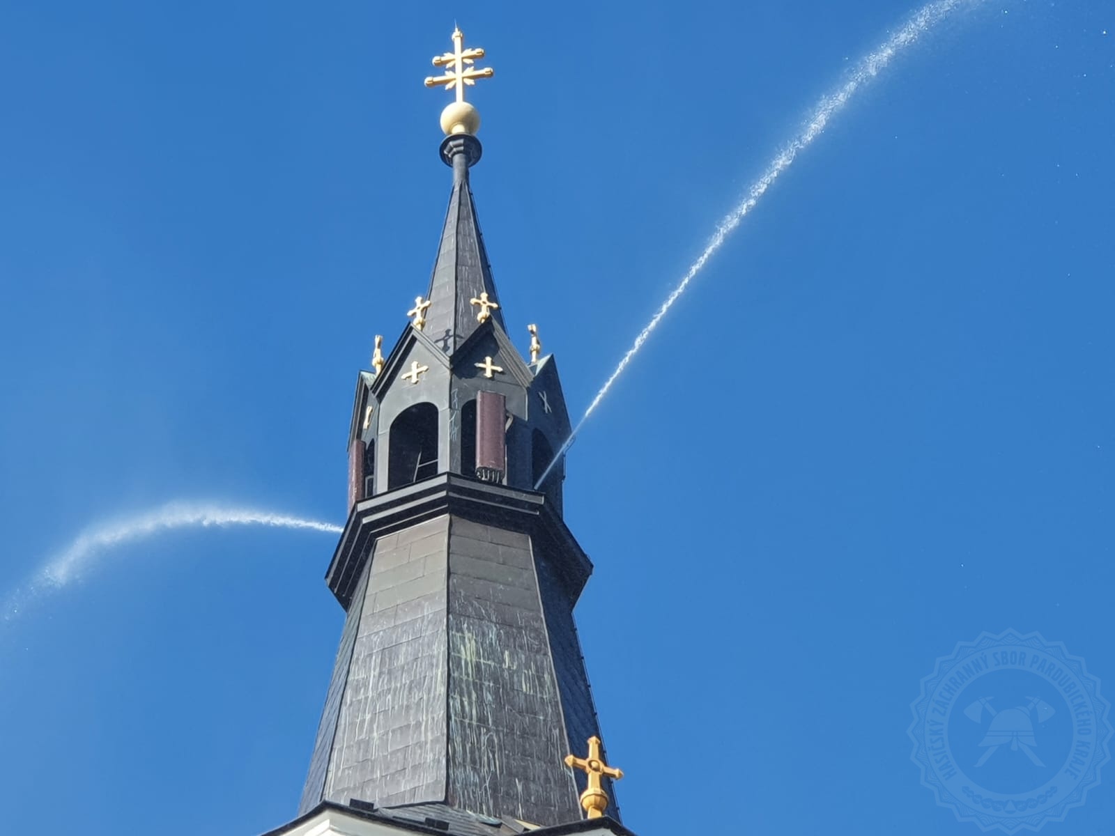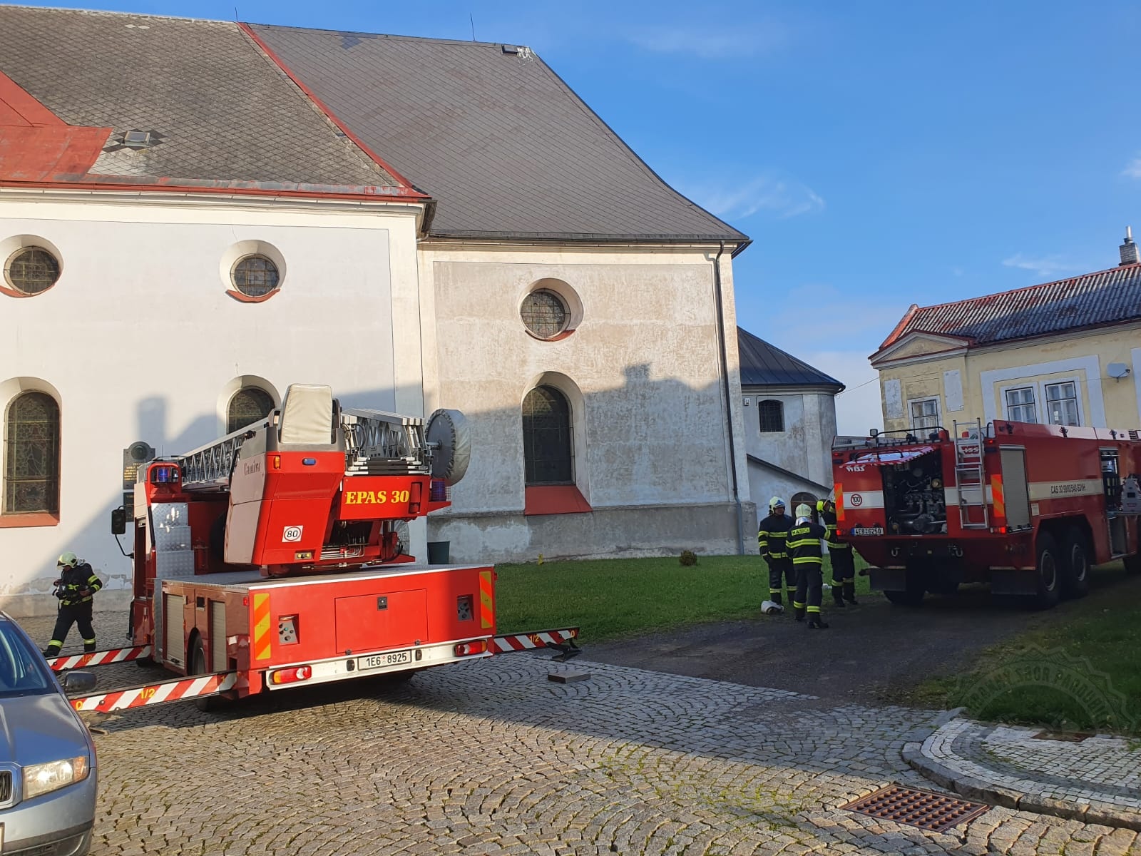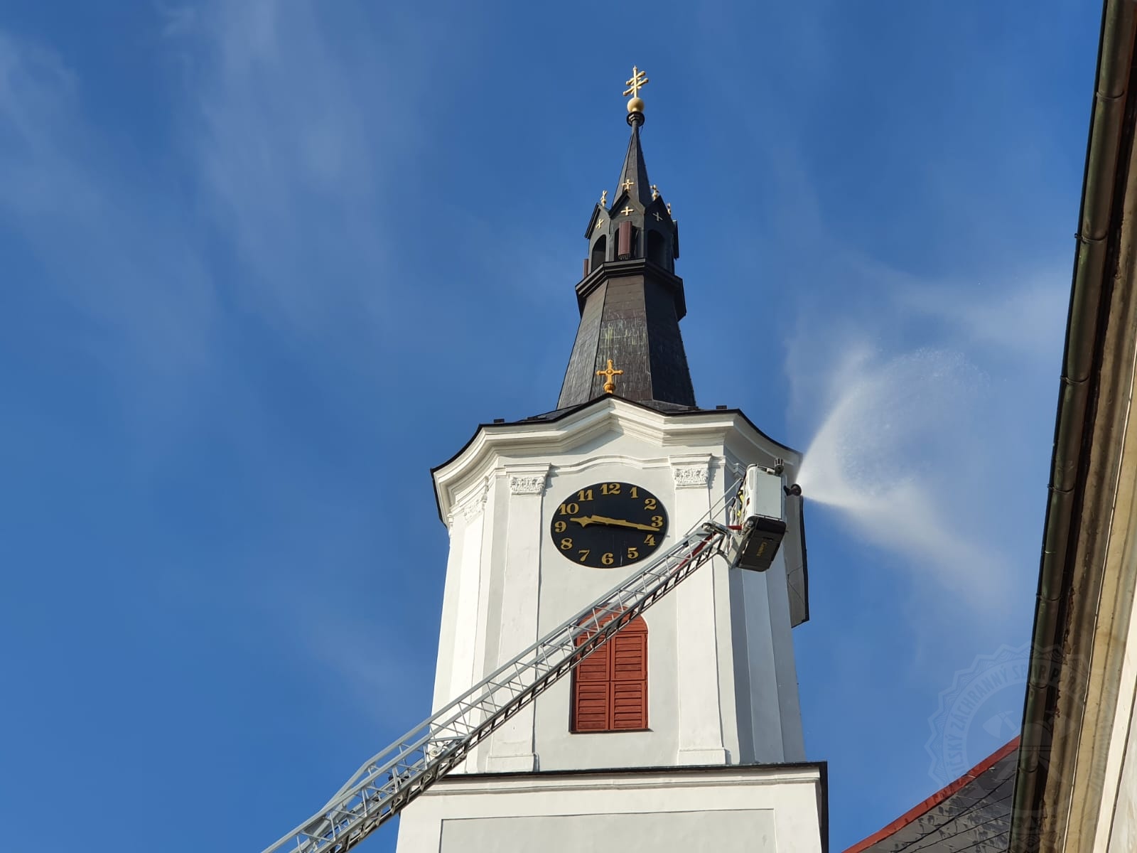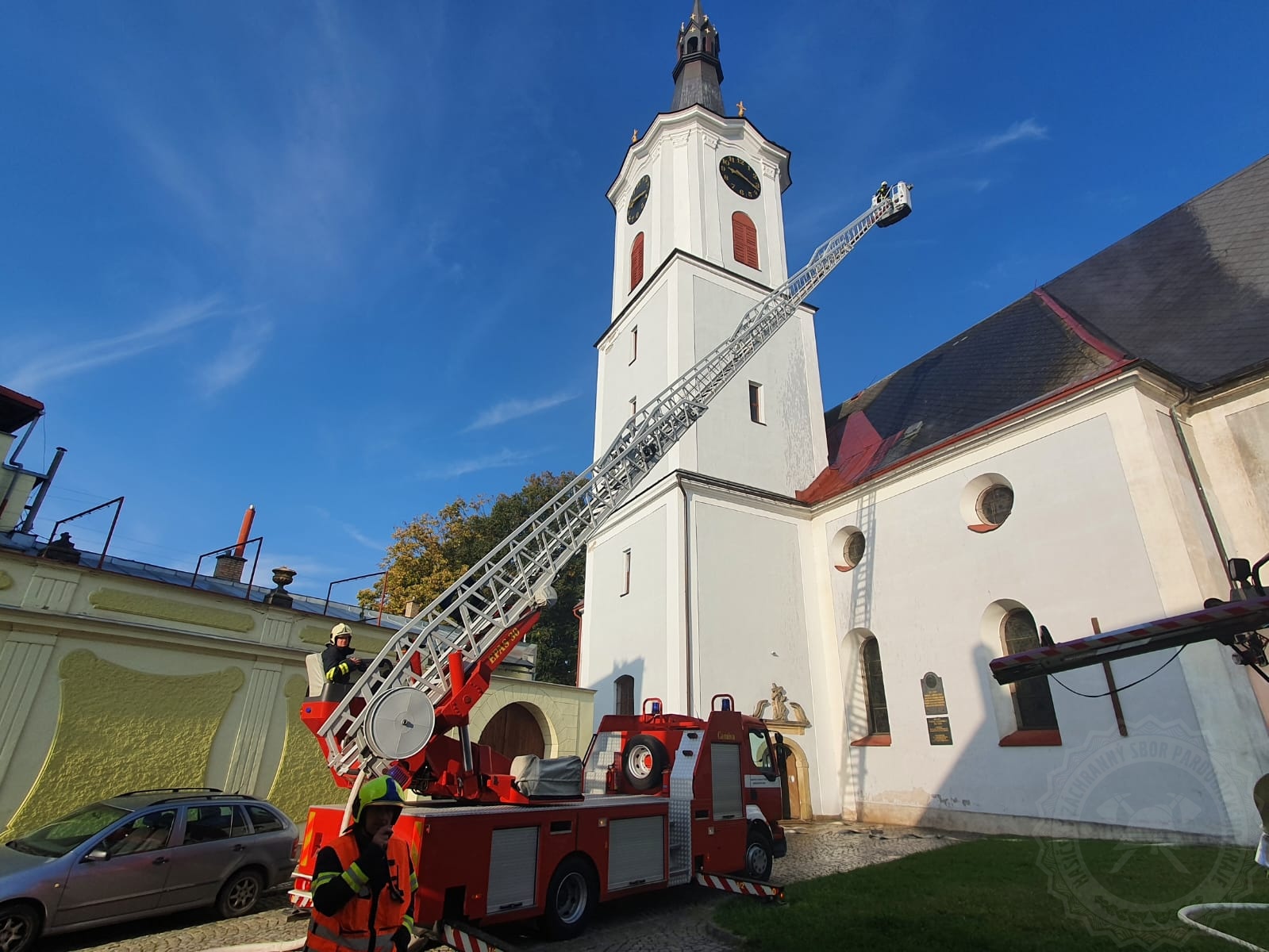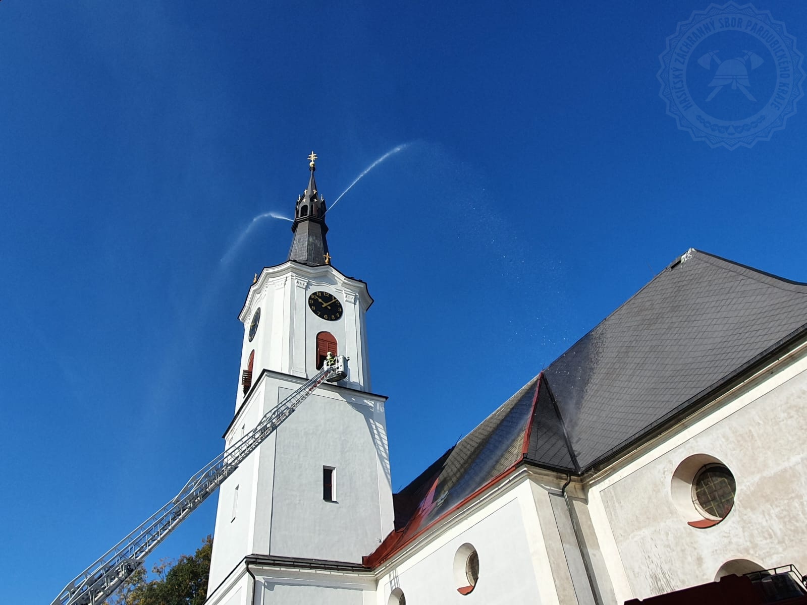 Věž kostela hořela naštěstí jen cvičně
