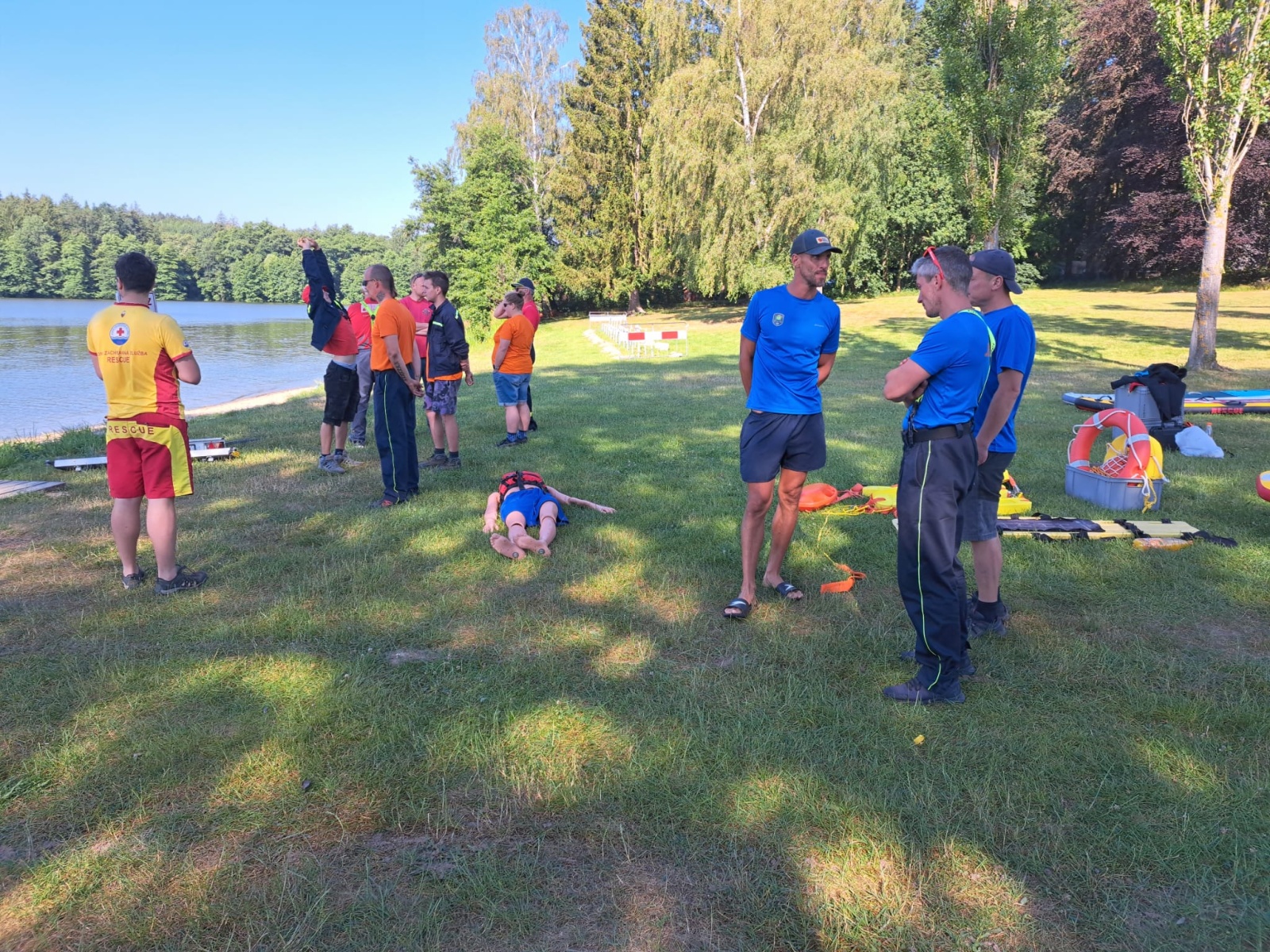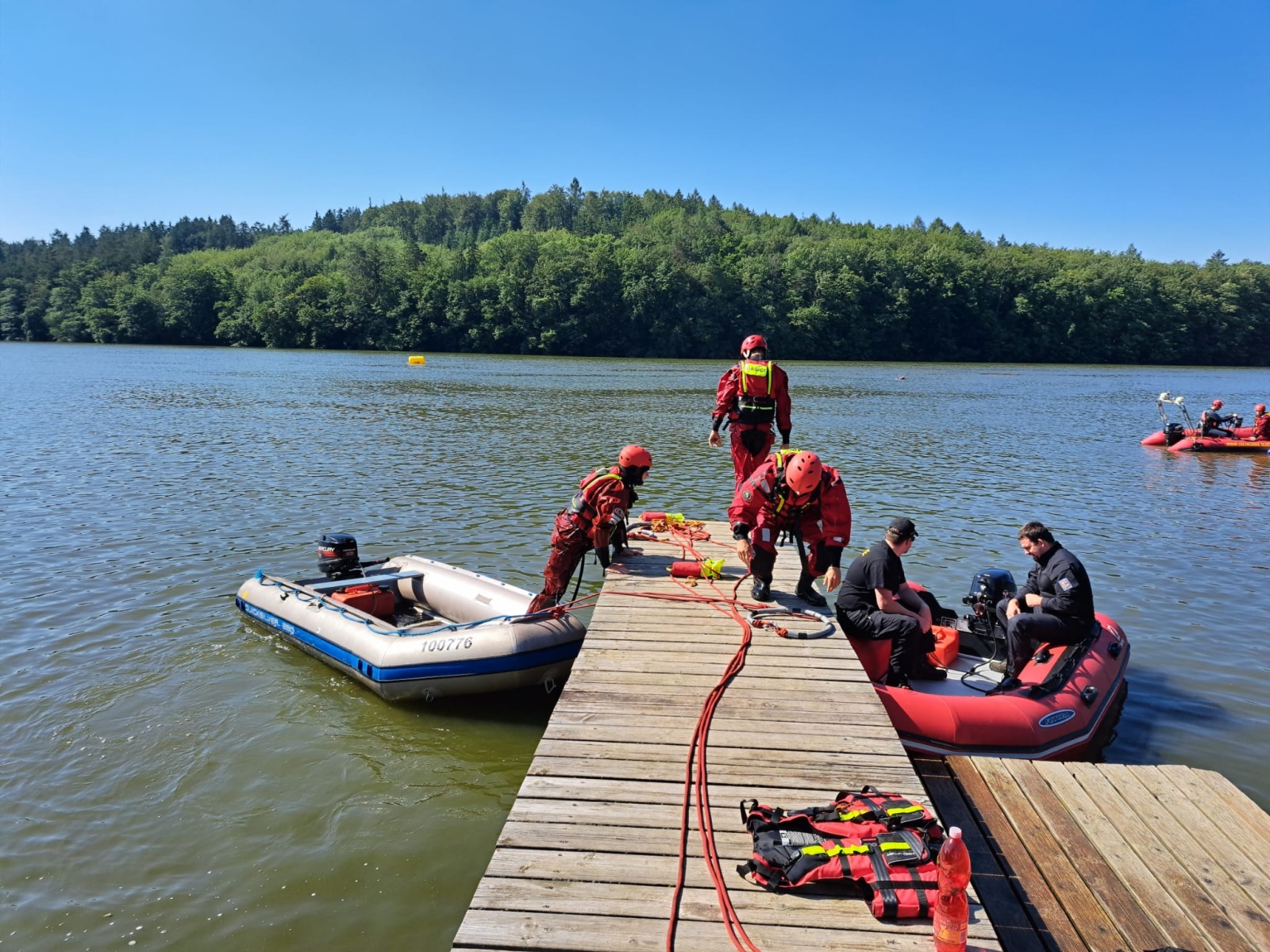 Zaměstnání se účastnili i členové některých JSDHO (Jevany, Kostelec nad Černými lesy, Lensedly a Senohraby), které jsou dislokované blízko vodních ploch a toků a mají podle požárních poplachových plánů rychlejší dojezd na místo události než stanice Říčany. Jejich výcvik probíhal pod dohledem dvou členů Vodní záchranné služby Českého červeného kříže, pobočného spolku Praha 15, kteří se na Vyžlovku dostavili s výjezdovým vozidlem, plavidlem s motorem a dalším záchranářským vybavením. Dobrovolní hasiči si prakticky vyzkoušeli oblékání osobních ochranných prostředků pro práci ve vodě, použití pomůcek pro záchranu tonoucí osoby a zkusili si i záchranu pomocí paddleboardu.