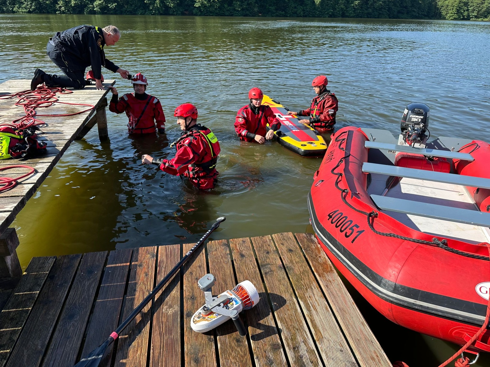 Kromě vlastní manipulace s lodí byla úkolem posádek také záchrana tonoucího a jeho následné vytažení do lodě. Další částí výcviku byla činnost s paddleboardem, který je ideálním záchranným prostředkem pro činnosti na klidné i tekoucí vodě a na zamrzlých vodních hladinách. Pomocí dvou typů paddleboardů (3x AGAMA PADDLEBOARD RESCUE a 1x komerční výrobek) si hasiči prakticky vyzkoušeli ovládání prostředku v kleče a ve stoje a poté záchranu osoby z vodní hladiny. Prakticky bylo ověřeno, že záchrana tonoucí osoby pomocí paddleboardu je rychlá, bezpečná a velice efektivní.