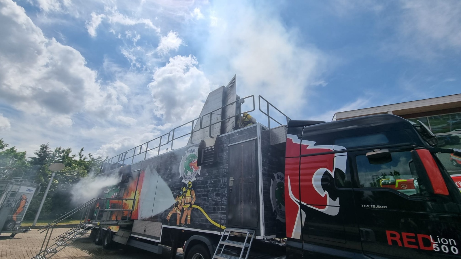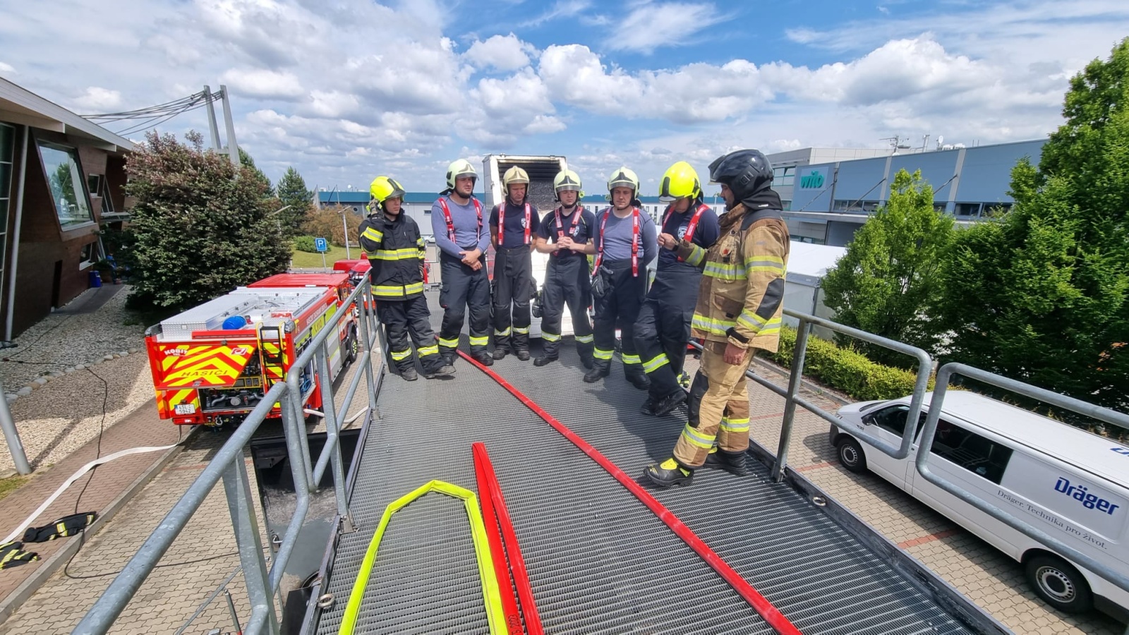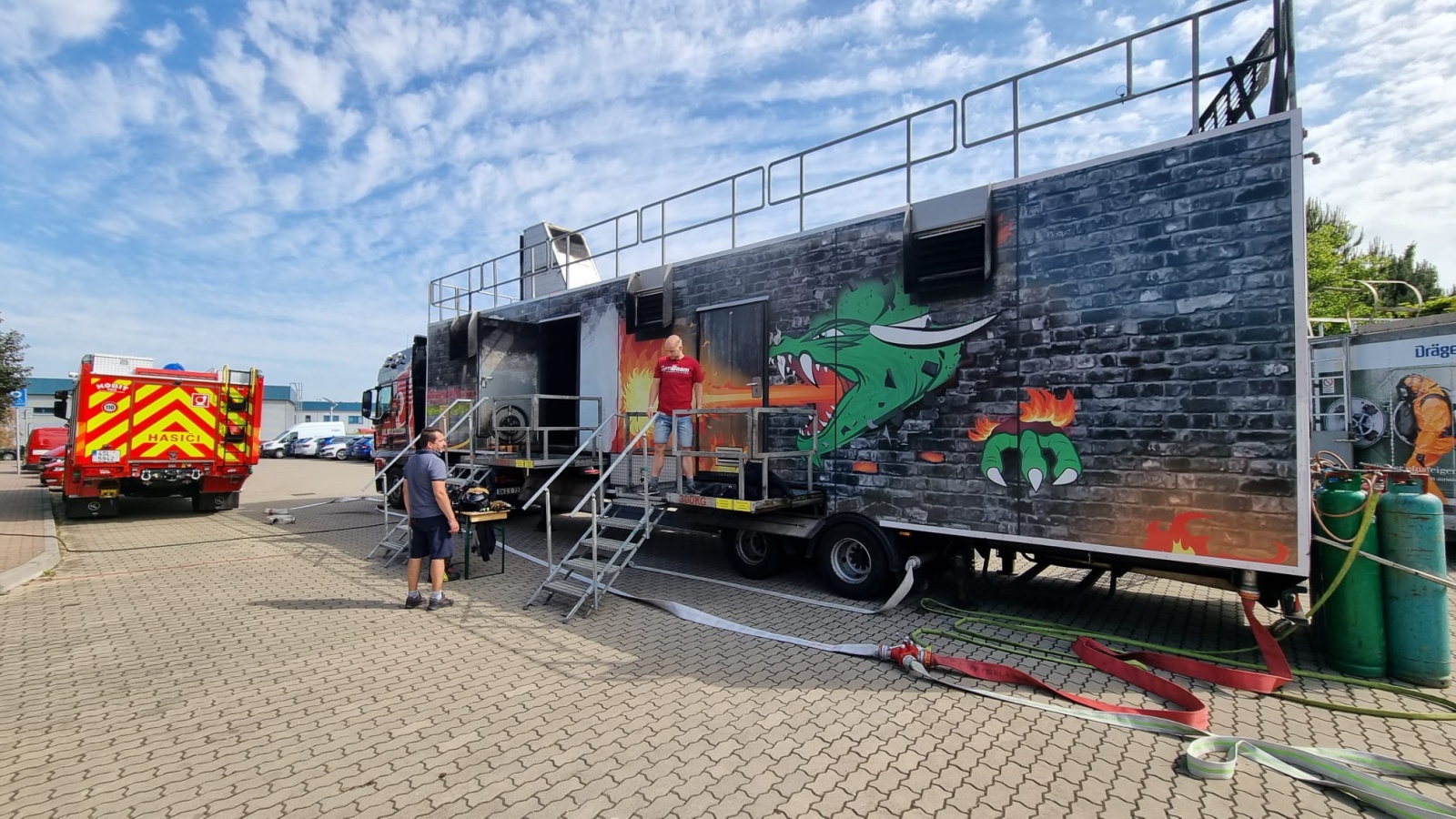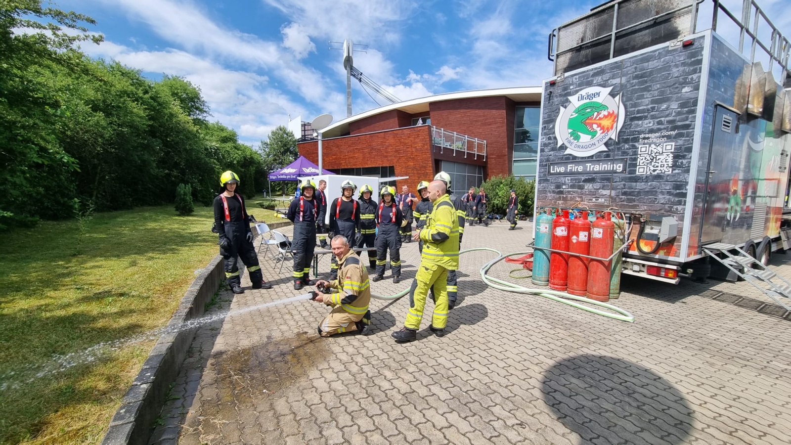 V pondělí 12. června proběhl v areálu společnosti Dräger Safety, s.r.o., která sídlí před vjezdem do Prahy po brněnské dálnici D1 v Čestlicích, výcvik profesionálních hasičů v ohňovém trenažéru Fire Dragon 7000.