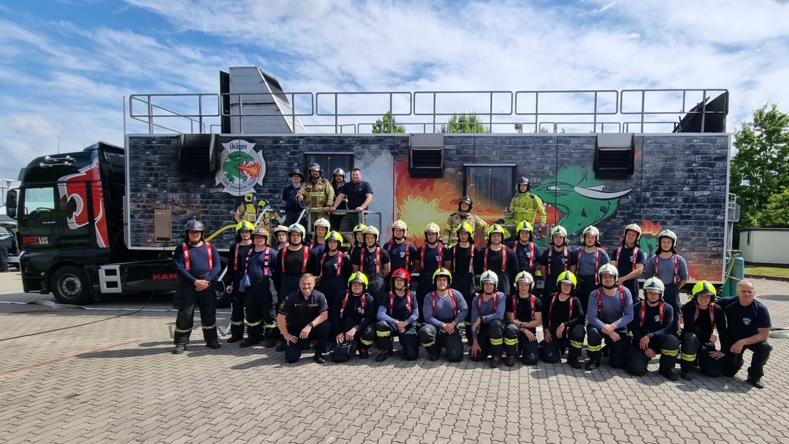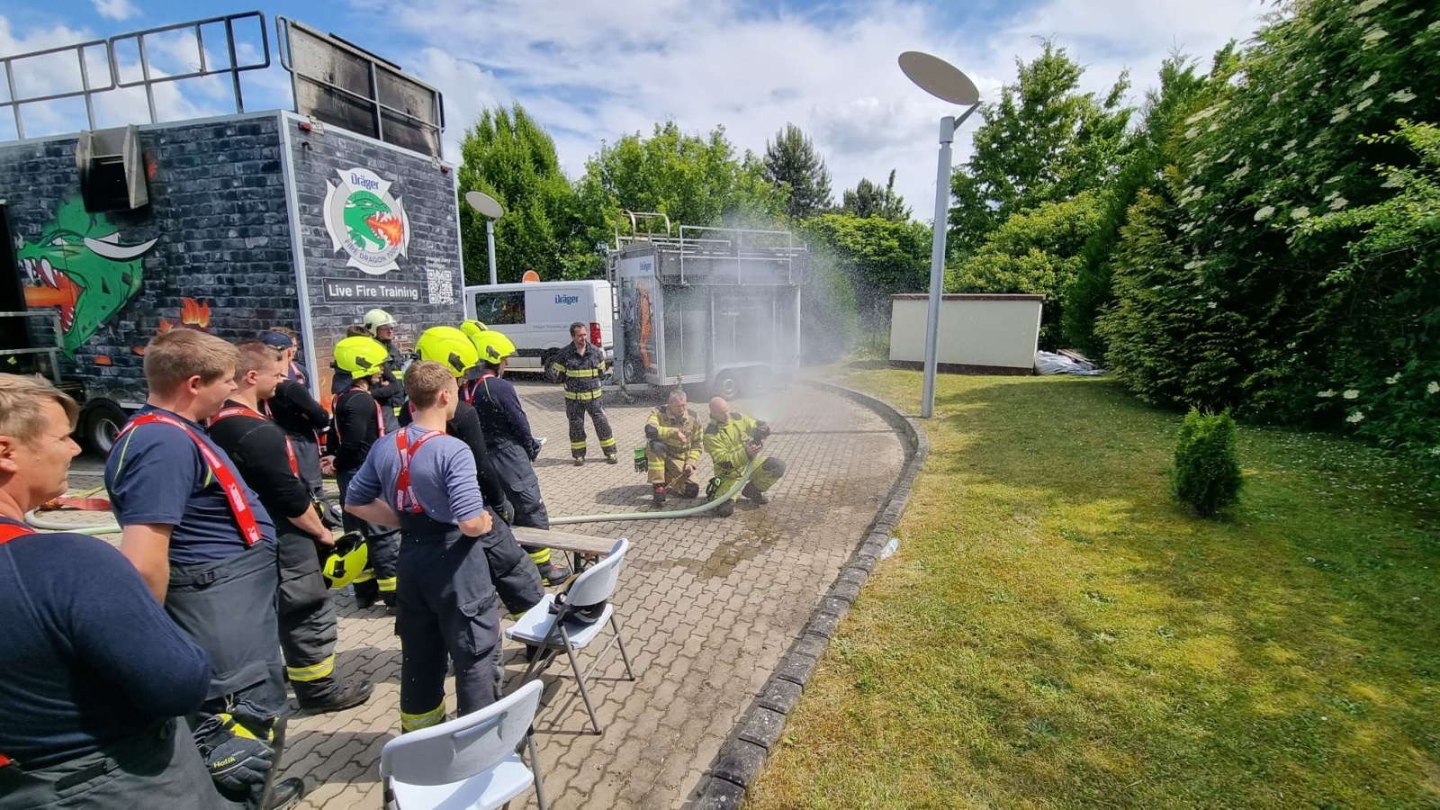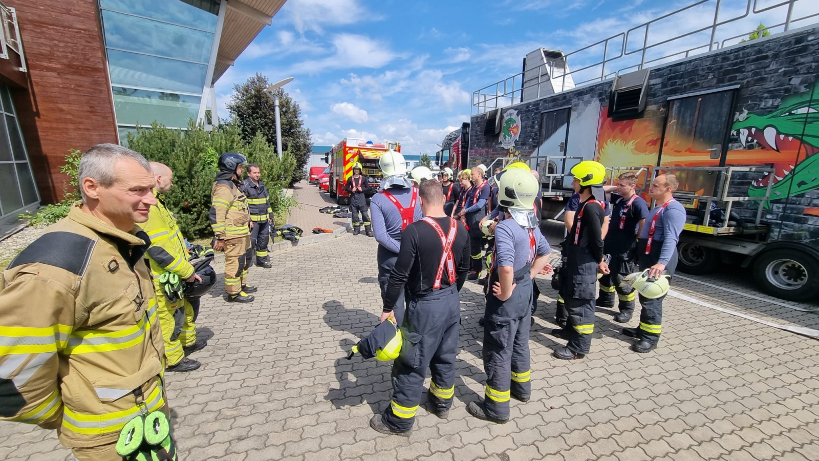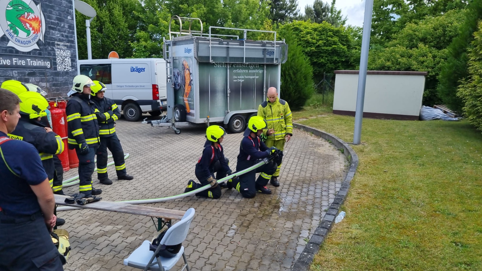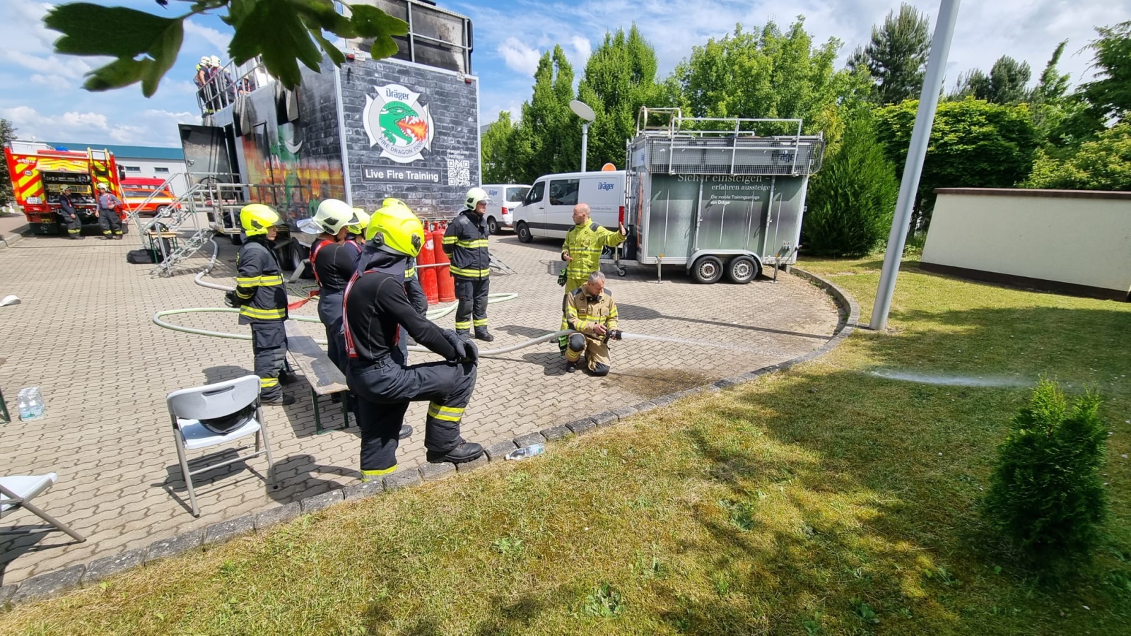 V pondělí 12. června proběhl v areálu společnosti Dräger Safety, s.r.o., která sídlí před vjezdem do Prahy po brněnské dálnici D1 v Čestlicích, výcvik profesionálních hasičů v ohňovém trenažéru Fire Dragon 7000.