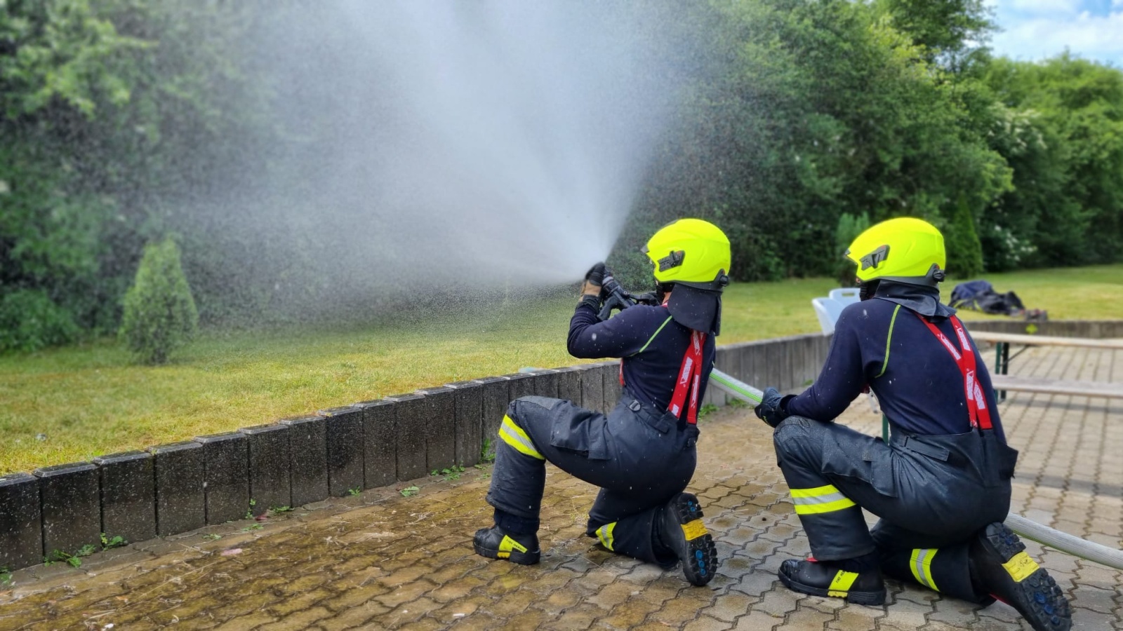 Praktickému výcviku předcházelo potřebné teoretické školení na učebně, kde byli hasiči seznámeni s taktickými postupy zásahu, scénáři jednotlivých modelových situací a s dispozičním uspořádáním trenažéru. Poté si všichni vyzkoušeli a oživili práci s proudnicí na útočném vedení hadice C52, zejména pulzní hašení za pomoci roztříštěného proudu a regulace průtoku.