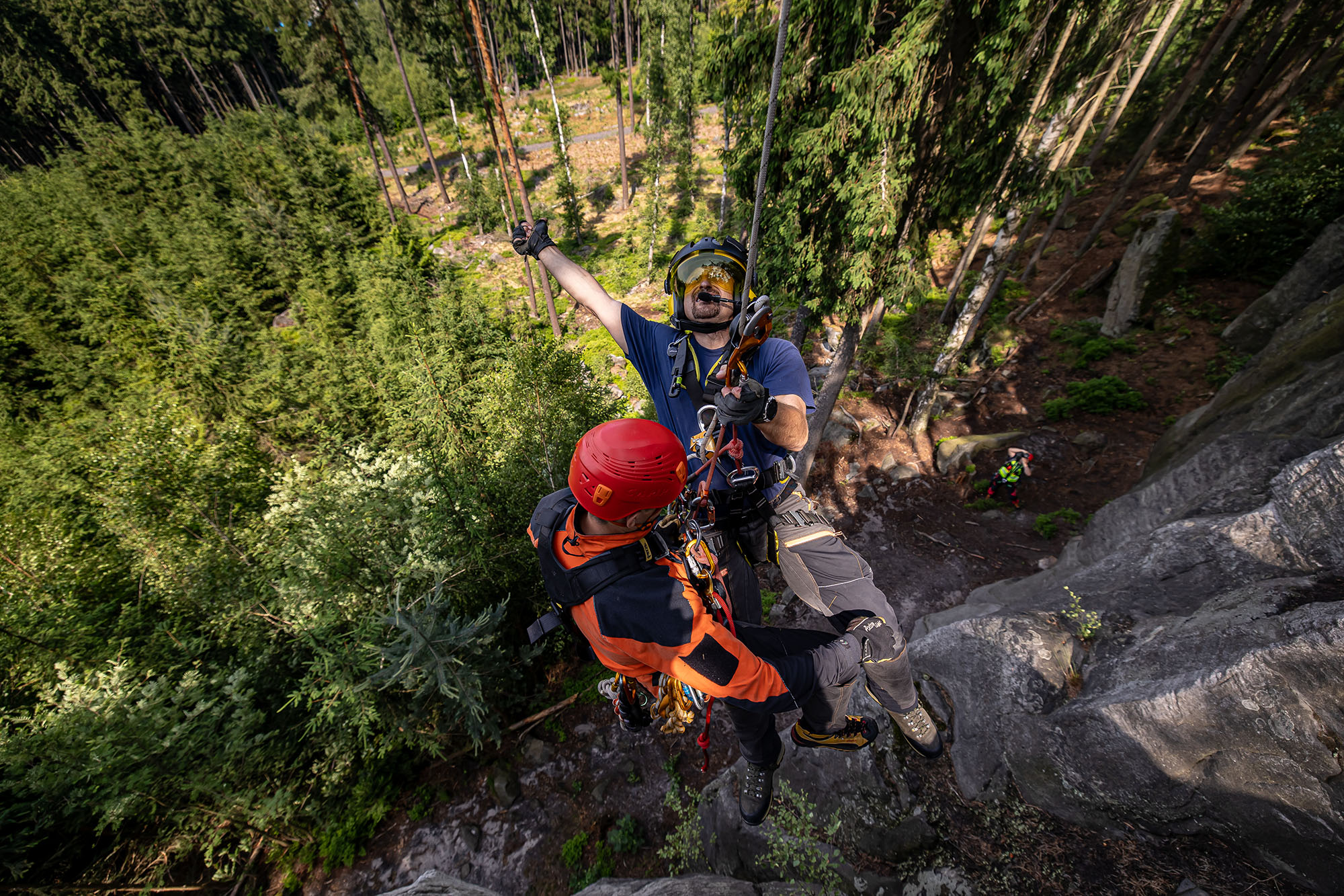 Jedna z disciplín simulovala pád horolezce na vícedélkové cestě. Hasiči tak zpod vrtulníku slanili ke zraněnému, kterého zafixovali, poté odstřihli lano speciálními nůžkami a horolezce transportovali na přístupné místo, kde mu byla poskytnuta potřebná lékařská pomoc. Tato technika se využívá například i při zásazích v oblasti Adršpašsko-teplických skal, které v těchto dnech navštěvuje velké množství horolezců.