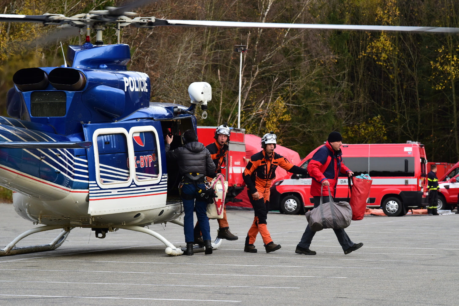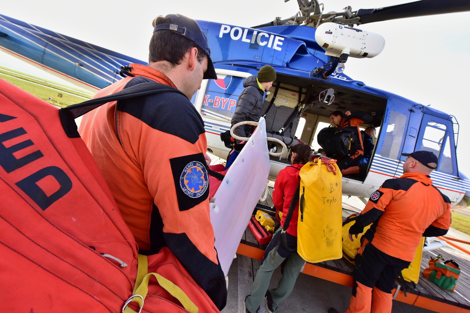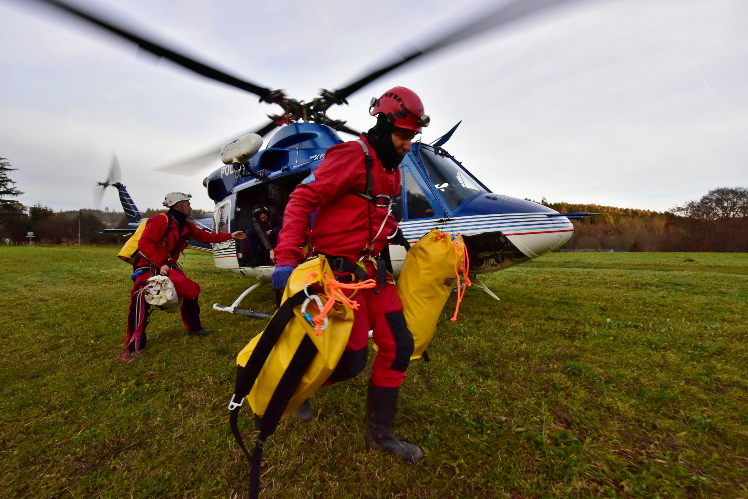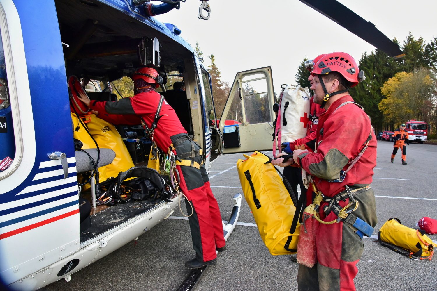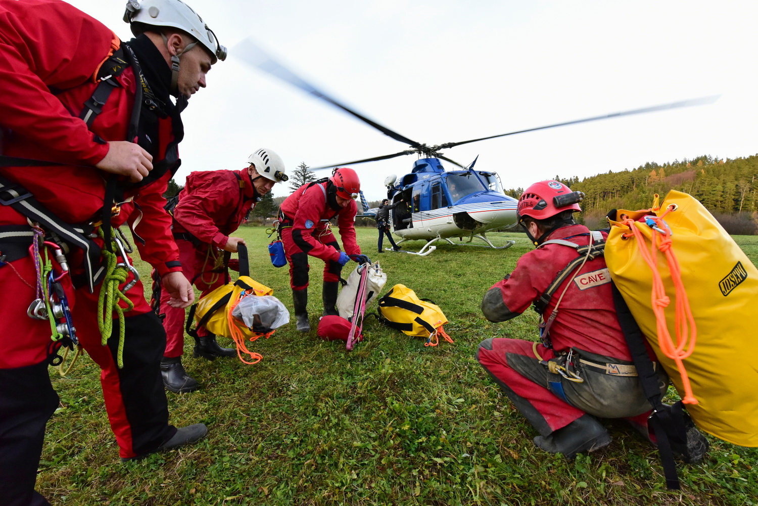 V odpoledních hodinách dopravil vrtulník Policie ČR na místo události speleologa-lékaře, který se po vystrojení s další skupinou vydal do podzemí.