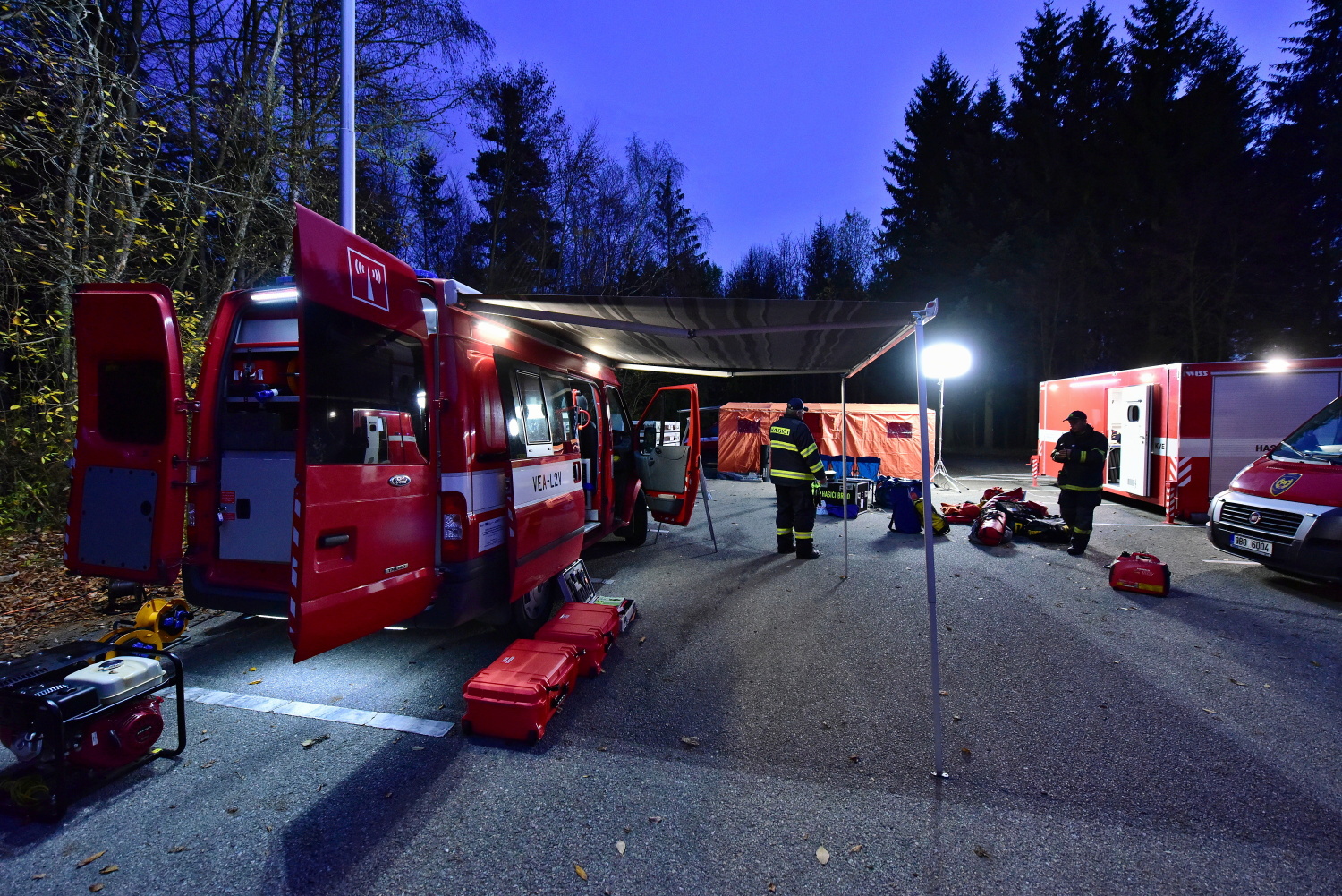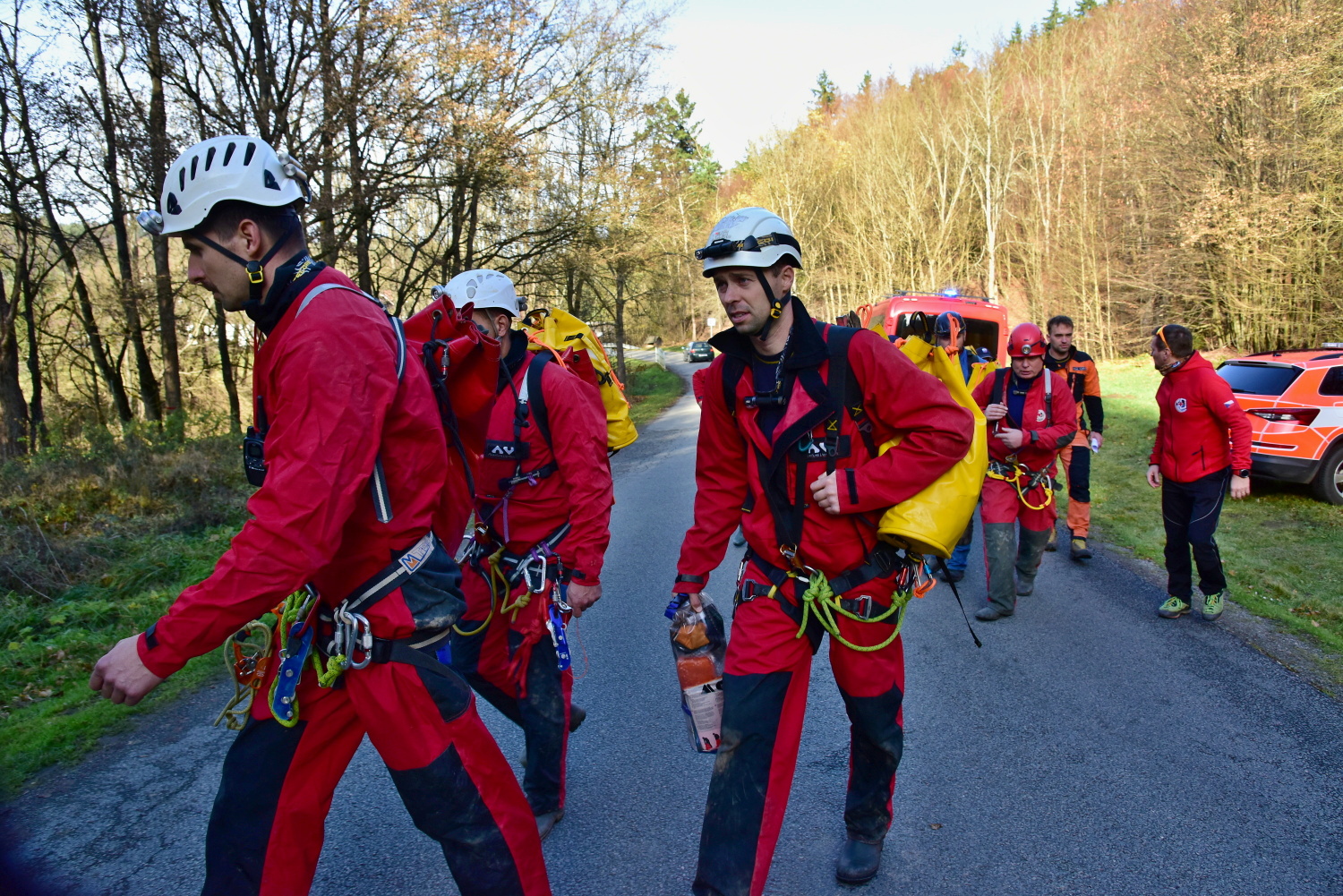Před půl dvanáctou dopoledne vyjíždí ze stanice Brno-Lidická pozemní odřad v počtu devíti vozidel. Na parkovišti v blízkosti propasti Macocha vzniká týlový prostor celé operace. Následně se k jeskyni přesunuje druhý záchranný tým a v počtu 8 záchranářů vstupuje do podzemí. Současně se zprovozňuje komunikační systém Nikola, který umožňuje bezdrátové spojení ve vápencovém masivu.