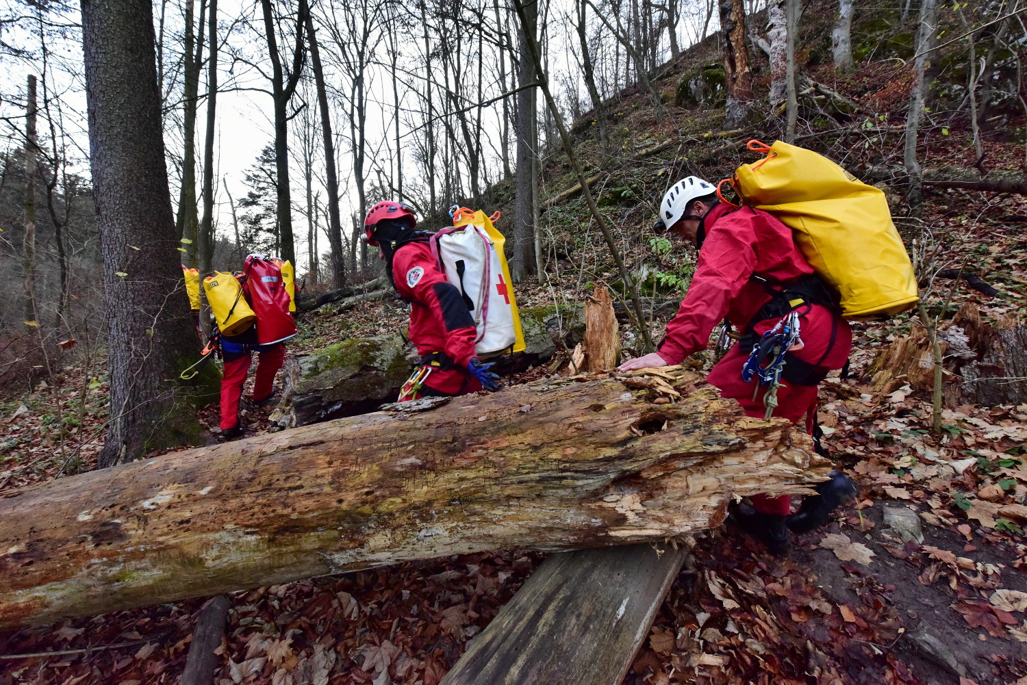 Přibližně za hodinu od ohlášení události vyrazil na letiště Brno-Tuřany první záchranný tým složený ze čtyř profesionálních hasičů a jednoho speleozáchranáře. Vrtulníkem Policie ČR se přesunul k místu události nedaleko obce Holštejn na Blanensku. Po téměř 5 hodinovém náročném postupu jeskyní dorazil ke zraněnému muži.