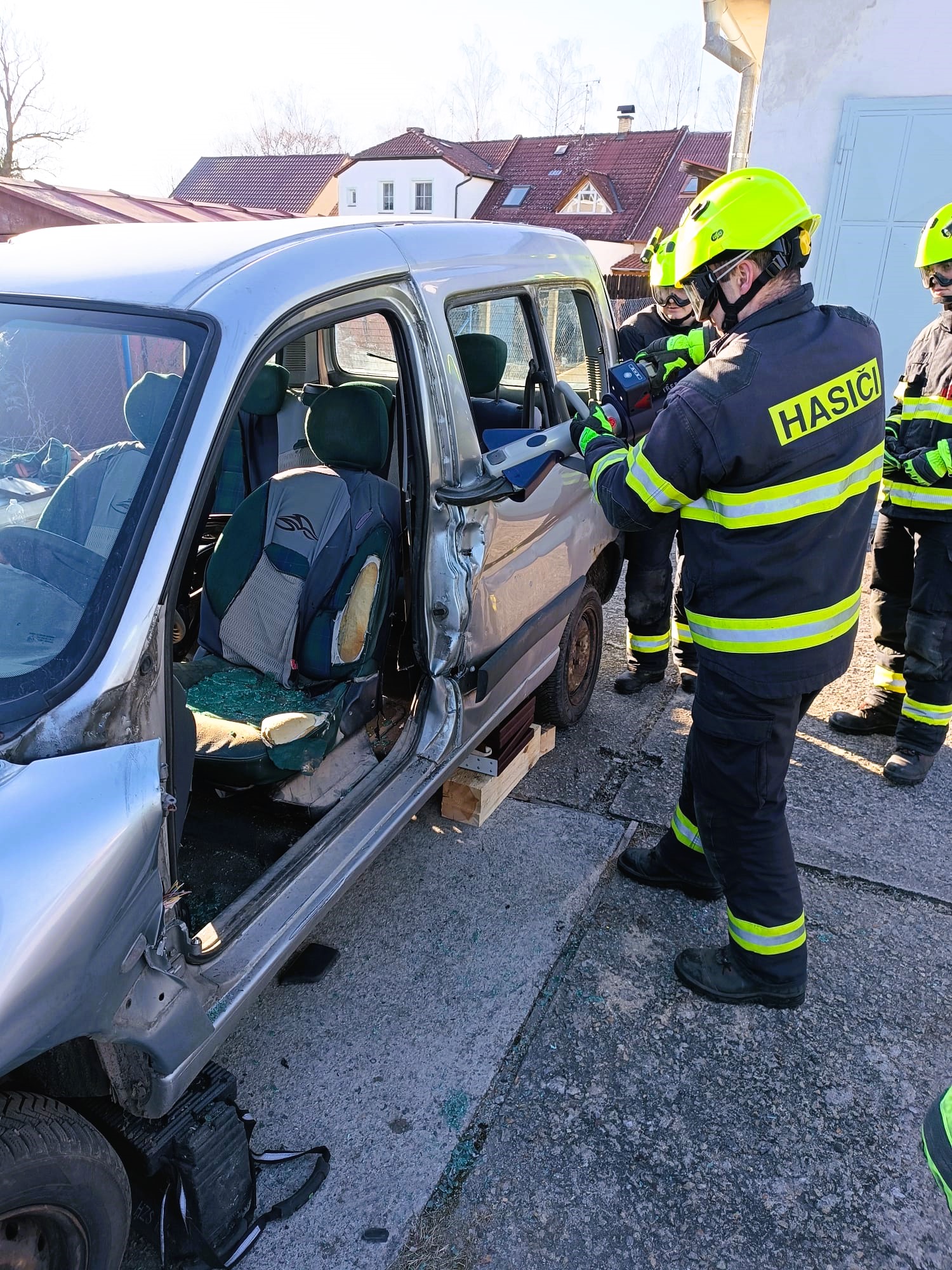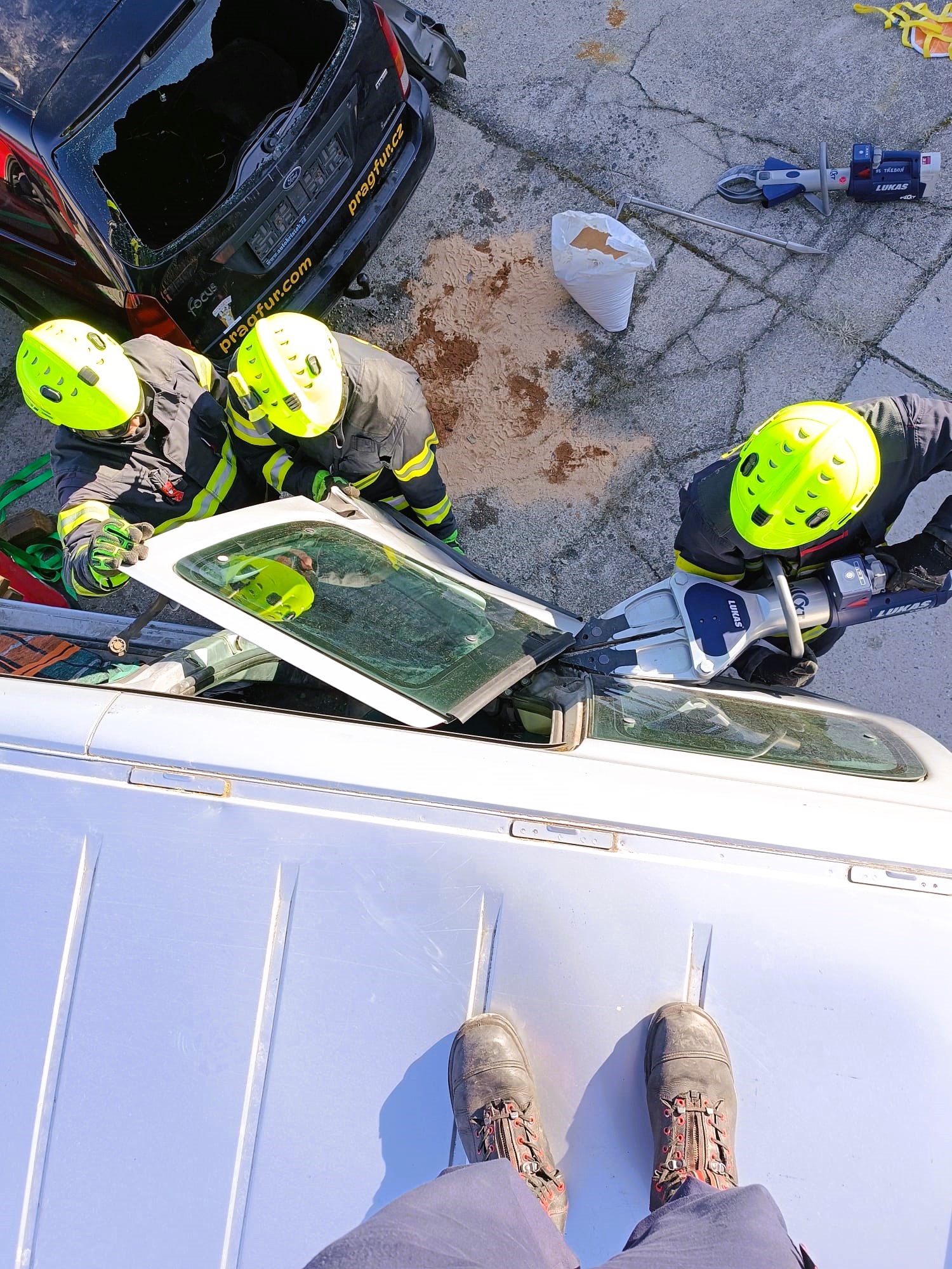 Hned první cvičení ukázalo, jak důležitá je absolutní kontrola nad hydraulickými nástroji. Hasiči totiž nedostali za úkol rozstříhat vrak auta ani ohýbat ocel. Místo toho si každý musel vzít rozpínák, kterým normálně trhá dveře havarovaných aut, a splnit zdánlivě jednoduchý úkol: