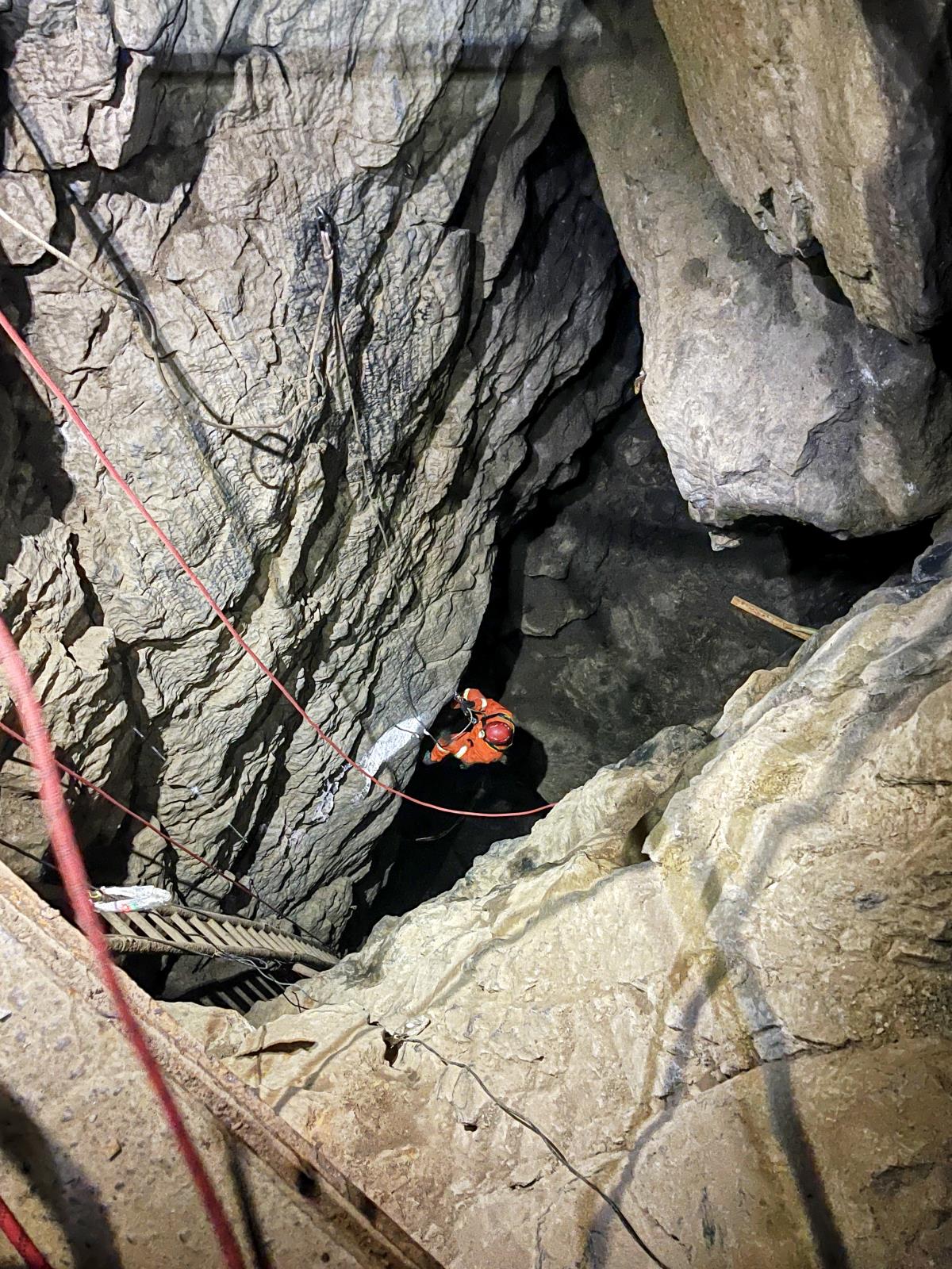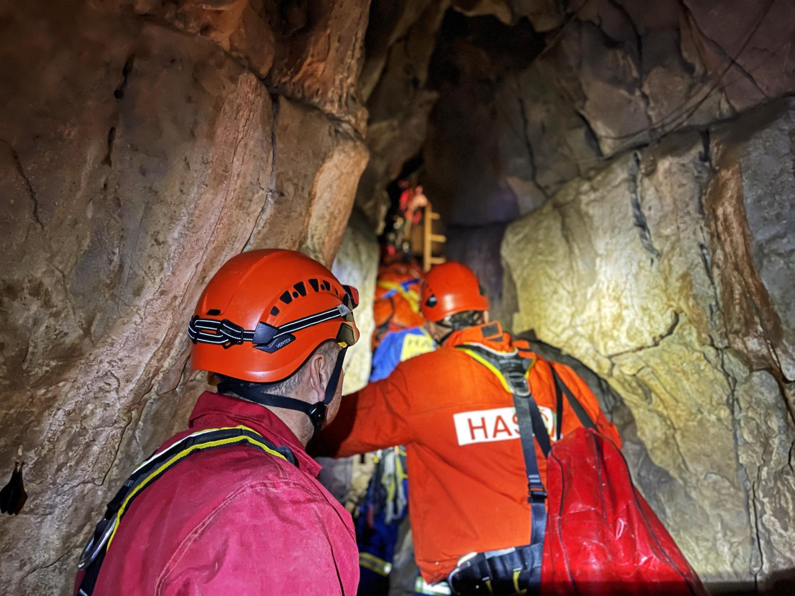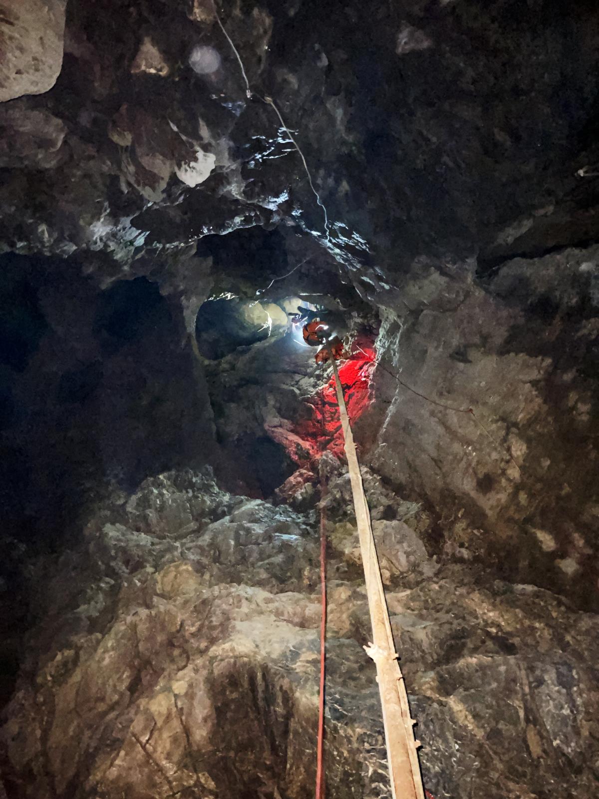 Hasiči v temnotě jeskyně
