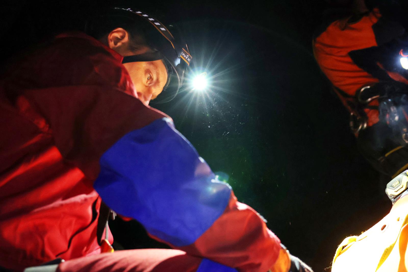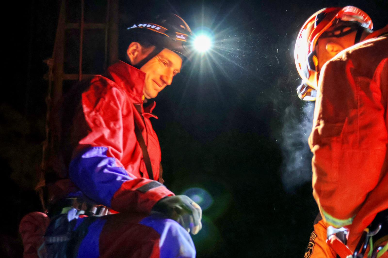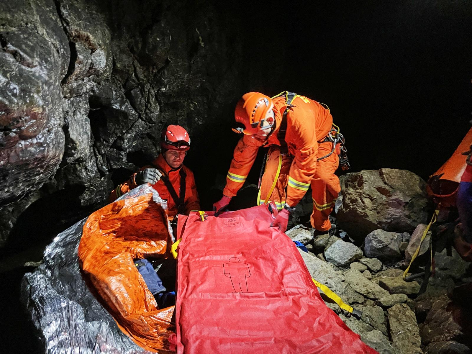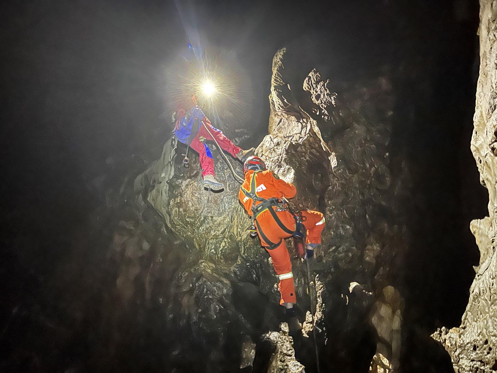 Hasiči v temnotě jeskyně