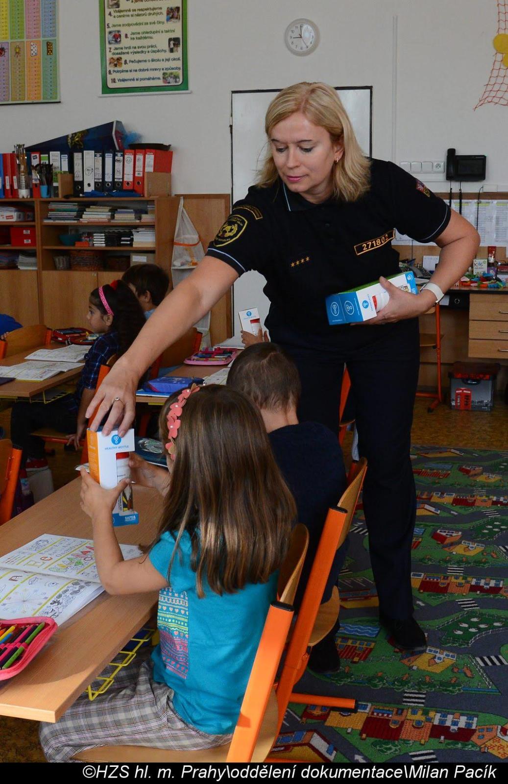 Ředitelka základní školy Bohumila Hrabala, paní Mgr. Irena Trojanová, PhD., při samotném předávání vyzkoušela děti ze znalostí týkající se práce hasičů a pochválila prvňáčky za jejich aktivní přístup.