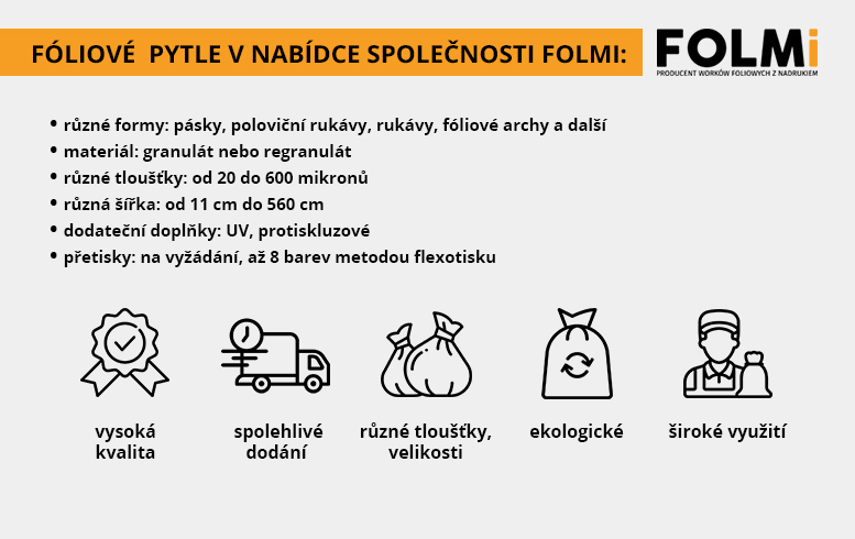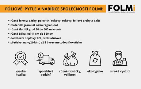 Společnost Folmi je výrobcem vysoce kvalitních sáčků a LDPE fólie. Jedná se o regranuláty i primární plasty, které vynikají vynikající trvanlivostí a jsou také šetrné k životnímu prostředí. Pytle na kůru, uhlí, ekohrášek, přepravní fólie na matrace, rukávy na potraviny nebo poloviční rukávy jsou jen zlomkem rozsáhlého sortimentu, který je určen podnikatelům stavějícím na přístup k životnímu prostředí a bezpečnost zboží.