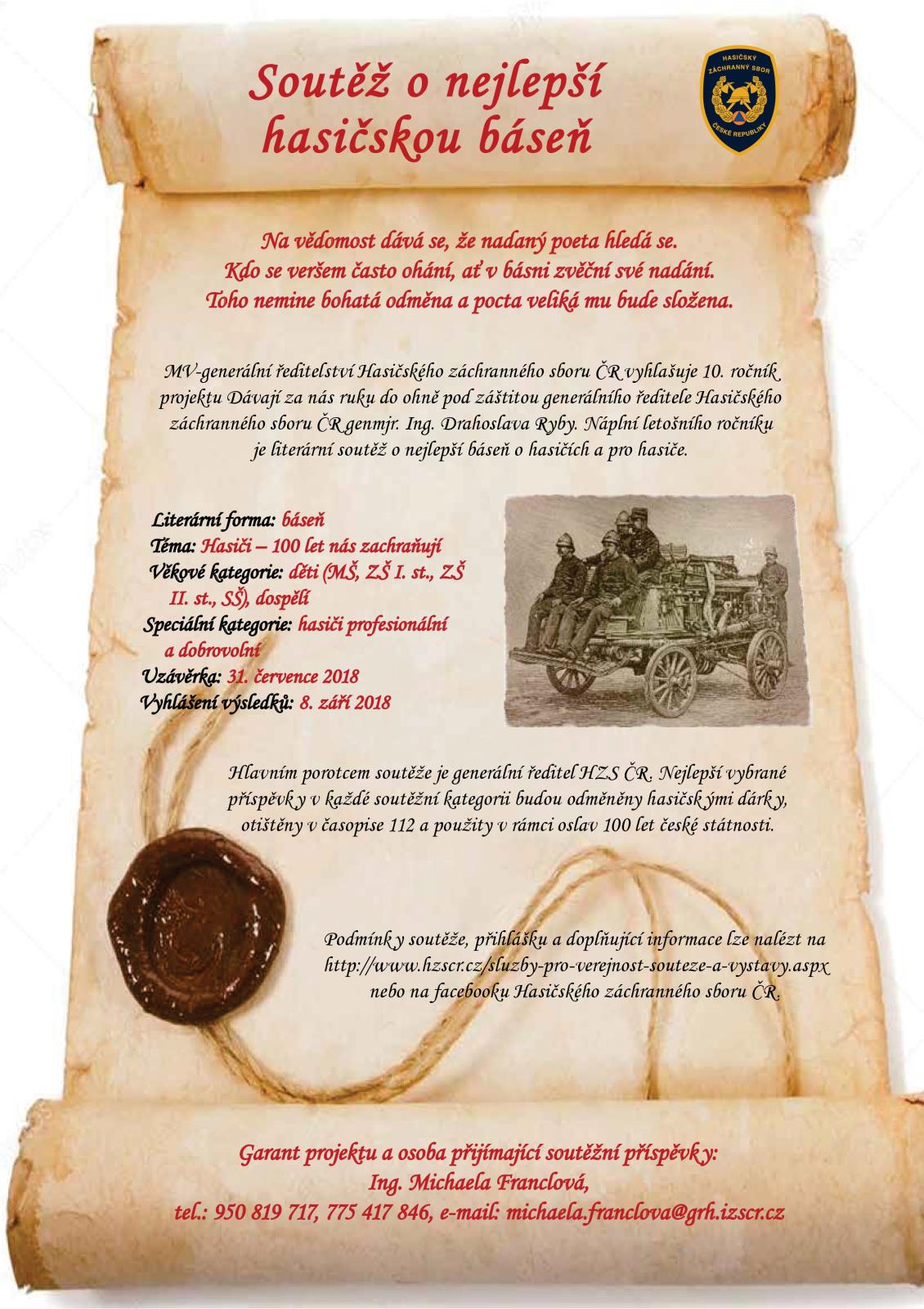 Garant projektu: Ing. Michaela Franclová, michaela.franclova@grh.izscr.cz (předmět e-mailu: Hasičská básnička), tel. 950 819 717, MV-GŘ HZS ČR, Kloknerova 26, Poštovní přihrádka 69,