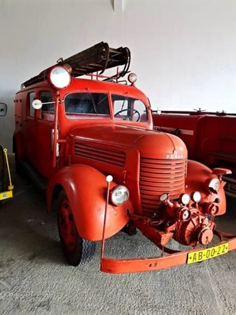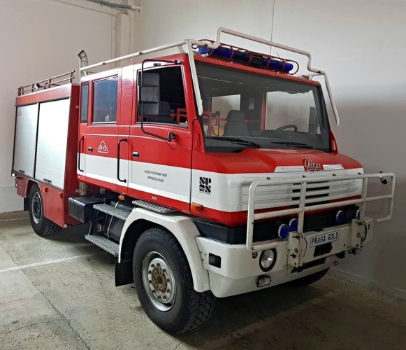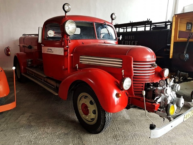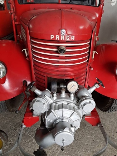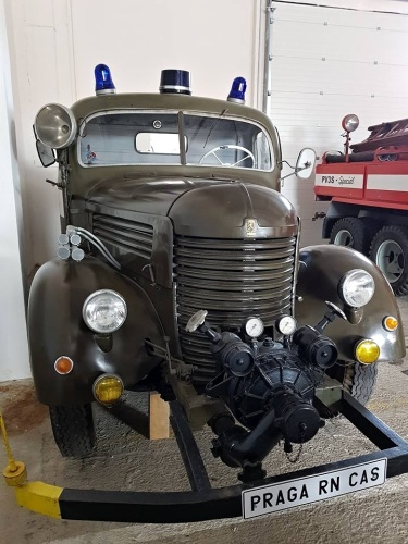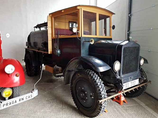 čtyřmi hasičskými Pragovkami zapůjčenými díky laskavosti pana Emila Příhody, majitele Automuzea Praga, pro stálou výstavu "Praga hasičská" v Expozici požární ochrany v areálu Hasičského záchranného sboru ČR ve Zbirohu.
