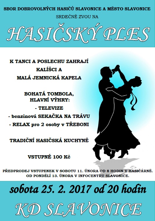 Sbor dobrovolných hasičů Slavonice ve spolupráci s městem Slavonice Vás srdečně zvou na Hasičský ples, který se uskuteční v sobotu 25. února 2017 od 20 hodin v kulturním domě ve Slavonicích.