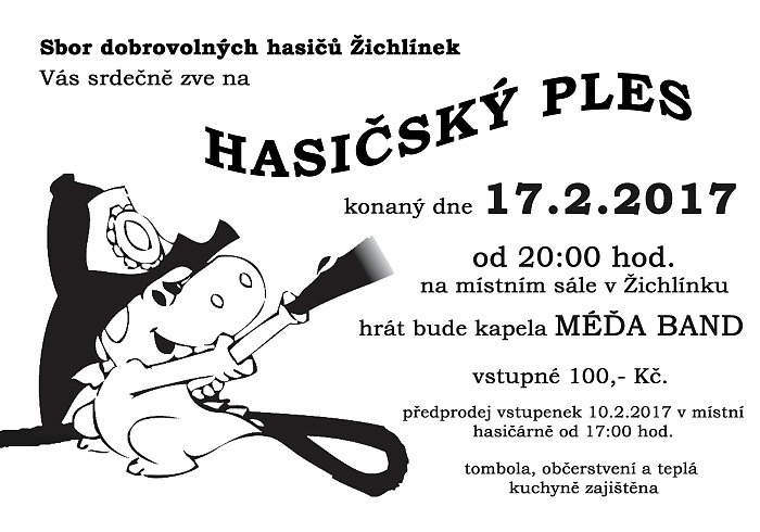 Sbor dobrovolných hasičů Žichlínek vás srdečně zve na HASIČSKÝ PLES konaný 17. února od 20 hodin na místním sále v Žichlínku.