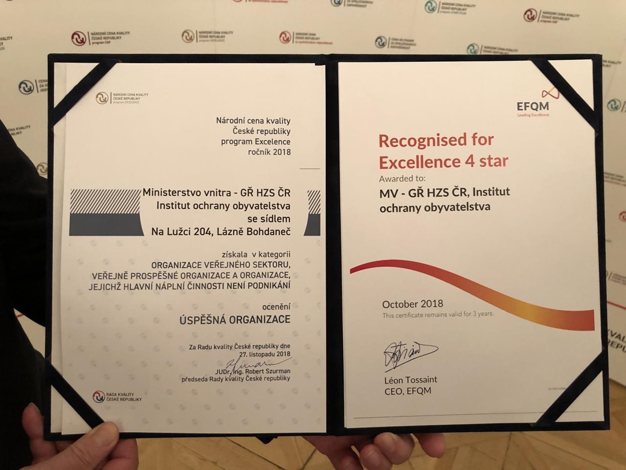 Dne 27.listopadu 2018 Institut ochrany obyvatelstva HZS ČR ve Španělském sále Pražského hradu obdržel Národní cenu kvality České republiky v programu Excelence. Akce se uskutečnila pod záštitou prezidenta České republiky Miloše Zemana a předsedy vlády České republiky Andreje Babiše. Institut získal významné národní i mezinárodní ocenění Excellence 4 star v prestižním hodnocení kvality organizace EFQM - European Foundation for Quality Management a úspěšně tak navázal na rok 2016, kdy byl hodnocen jako úspěšná organizace veřejného sektoru na úrovni Excellence 3 star Národní cena kvality České republiky představuje nejpropracovanější a nejsofistikovanější systém externího hodnocení organizací podnikatelského i veřejného sektoru. Program Excelence je založený na komplexním hodnocení fungování a zlepšování celé organizace. Model EFQM zahrnuje 9 základní části - vedení, lidé, strategie a politiky, partnerství a zdroje, procesy, výsledky pracovníků, výsledky pro zákazníka, výsledky pro společnost, klíčové výsledky organizace. Hodnotí se především úroveň řízení, dále činnost zaměstnanců, posuzují se rozvojové a strategické dokumenty. Důraz je kladen na práci s partnery, například s vysokými školami, jednotlivými HZS krajů apod. Hodnocena je i schopnost organizace kvalitně se propagovat na veřejnosti. Vysoce prestižní cenu převzal na slavnostním večeru plk. Ing. Mgr. Rostislav Richter a plk. Ing. Jarmil Valášek, Ph.D., MBA. Jarmil Valášek Zdroj: kpt. Mgr. Nicole Zaoralová - tisková mluvčí MV- generální ředitelství Hasičského záchranného sboru ČR Foto: generální ředitelství Hasičského záchranného sboru ČR