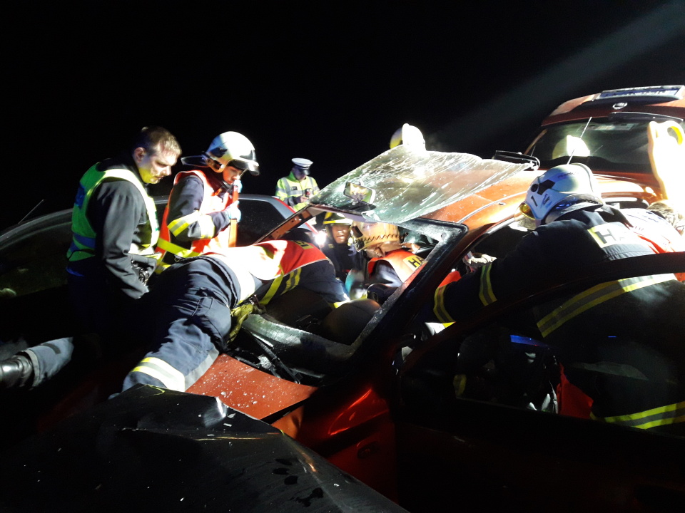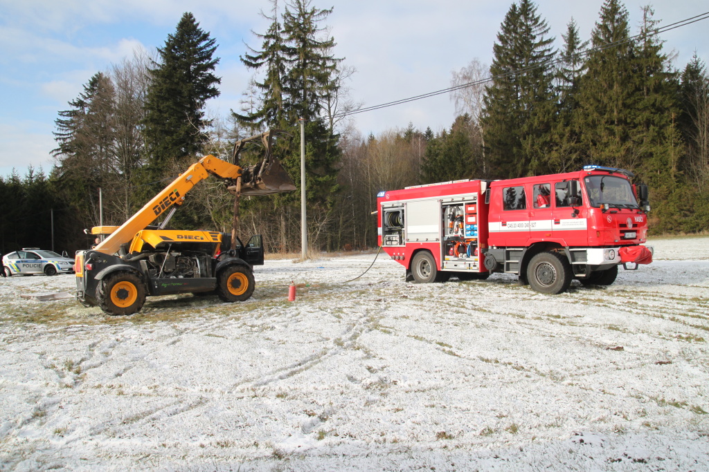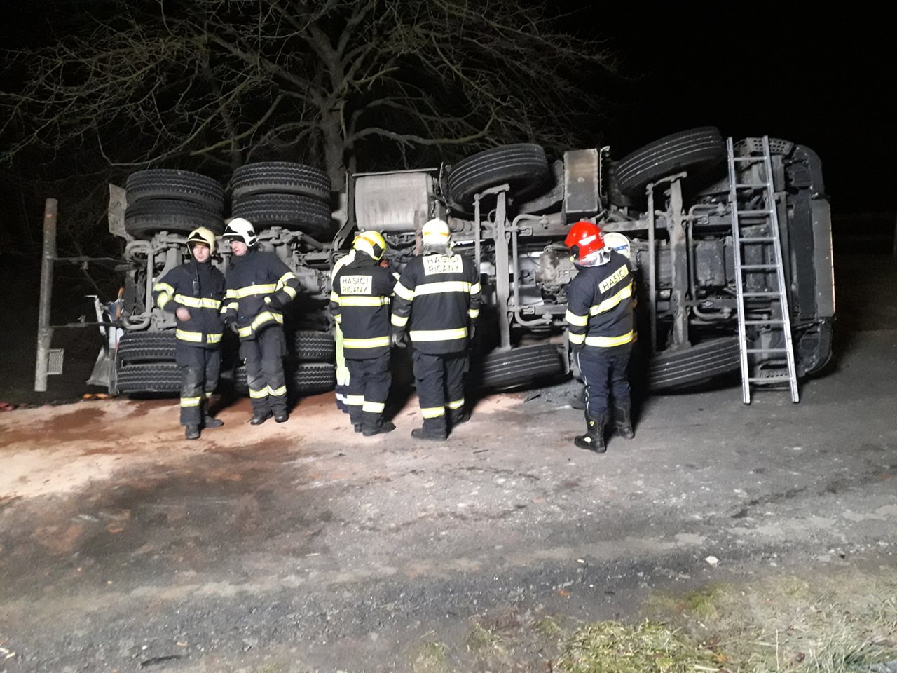 V úterý 27. listopadu 2018 krátce po půl čtvrté odpoledne byla na linku tísňového volání Hasičského záchranného sboru Středočeského kraje oznámena dopravní nehoda domíchávače betonu v katastru obce Petříkov v okrese Praha-východ. Operační důstojník k události vyslal profesionální hasiče ze stanic Jílové a Říčany. Po příjezdu první jednotky bylo zjištěno, že domíchávač je převrácený na boku, unikají z něj pohonné hmoty a z části vytekl i přepravovaný beton. Řidič, který ještě před příjezdem hasičů opustil kabinu, byl nezraněn. Velitel zásahu požádal o vyslání velkého vyprošťovacího automobilu, který následně vyrazil ze stanice Kladno. Kromě toho vyjel také chemický kontejner ze stanice Říčany, s jehož pomocí hasiči zlikvidovali uniklé pohonné hmoty. Vzhledem k tomu, že celková váha vozidla byla kolem 35 tun, bylo nutné nejprve z mixu odsát přepravovaný beton. Na místo tak byl povolán sací bagr ze zbirožské roty Záchranného útvaru HZS ČR a také další vyprošťovací automobil. Současně byl vyhlášen poplach jednotce SDH Říčany, která vlastní čelní kolový nakladač, a také dobrovolné jednotce Velké Popovice. Po soustředění veškeré techniky byl nejprve pomocí nakladače odtěžen vyteklý beton a pak byl postupně odsán beton z domíchávače. Kvůli velkému množství přepravované směsi byly tyto práce rozděleny do čtyř fází, protože se odsátá část betonu musela vždy odvézt do čtyři kilometry vzdálené betonárny k likvidaci. Z důvodu dlouhodobějšího zásahu byl na místo povolán týlový kontejner ze stanice Beroun. Hasičům se podařilo odsát beton krátce po půl jedenácté v noci, pak přišlo na řadu samotné otočení vozidla zpět na kola. To se povedlo ve spolupráci se specializovanou vyprošťovací firmou, které zajistila i odtah vozidla. Hasiči zásah ukončili pár minut po půlnoci s tím, že ve středu ráno odtěží kontaminovanou zeminu společnost Dekonta. Zdroj: nprap. Petr Svoboda, oddělení IZS Tiskový odbor :HZS Středočeského kraje Foto:HZS Středočeského kraje FOTOGALERIE