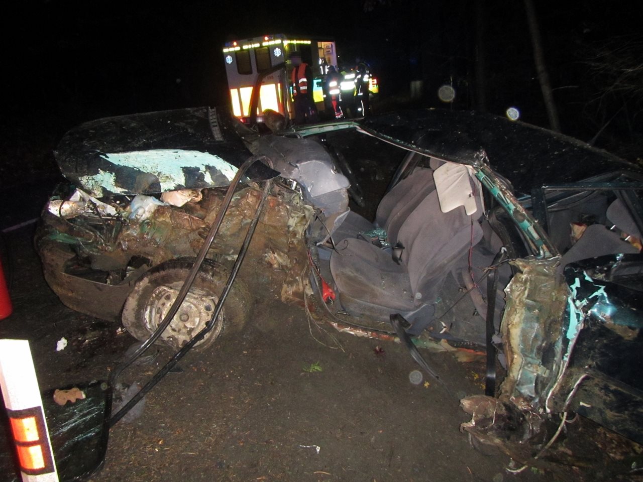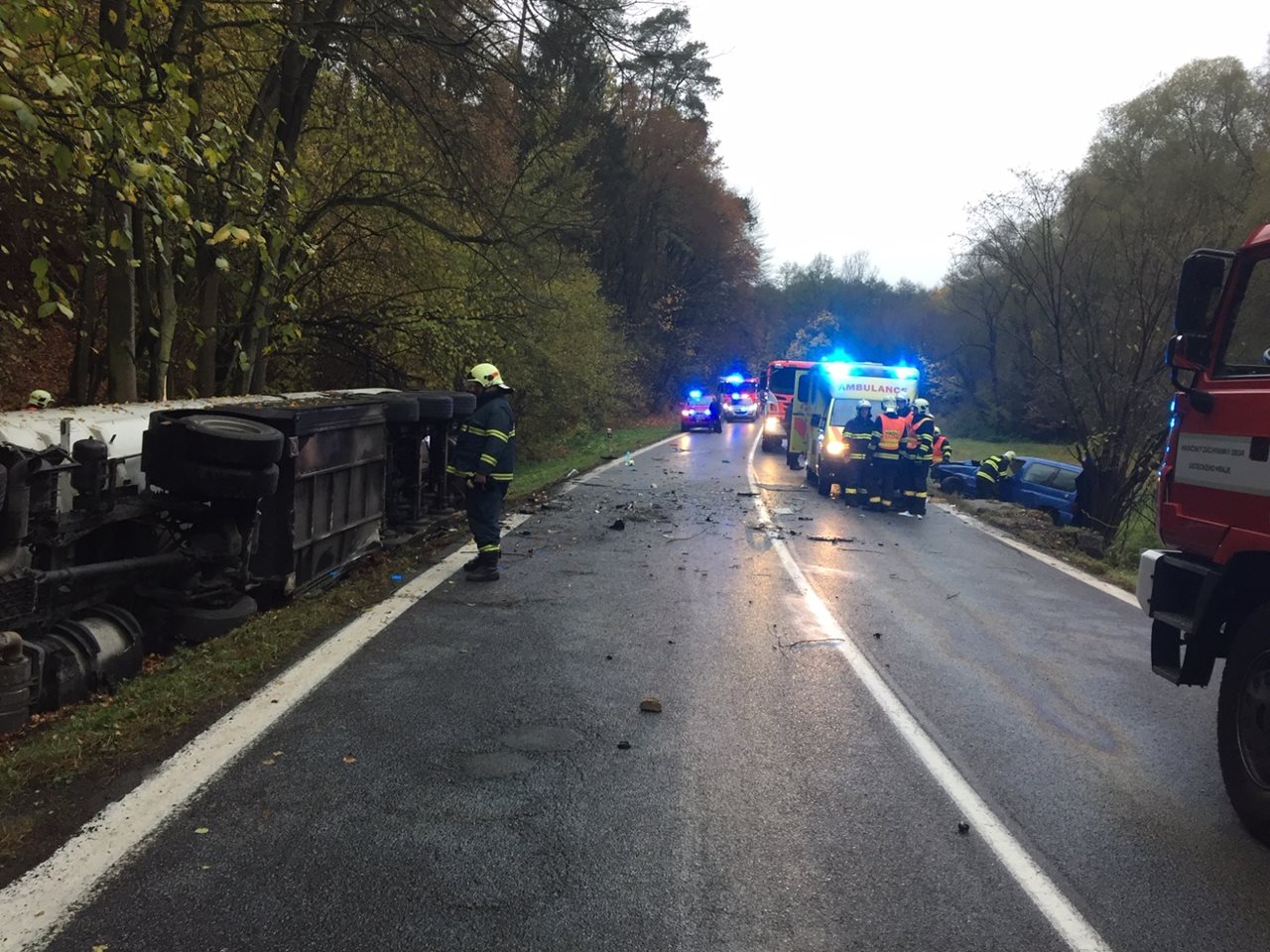 Informaci o dopravní nehodě na silnici číslo 9 v úseku mezi obcemi Želízy a Tupadly na Mělnicku přijala tísňová linka středočeských hasičů v pondělí 29. října v sedm hodin ráno. Krajské operační a informační středisko HZS Středočeského kraje k události vyslalo profesionální hasiče ze stanice Mělník a jednotku sboru dobrovolných hasičů Mělník Vehlovice – Chloumek. V rámci mezikrajské výpomoci k nehodě vyjela také profesionální jednotka HZS Ústeckého kraje ze stanice Štětí. Po příjezdu první jednotky na místo bylo zjištěno, že v jedné ze zatáček se čelně střetlo osobní auto s cisternou a obě vozidla skončila mimo vozovku na opačných stranách silnice. Cisterna se převrátila na bok, osobní vozidlo bylo na kolech, ale v kabině zůstal zaklíněný těžce zraněný řidič. Hasiči vyprostili zraněného řidiče a předali ho do další péče posádce zdravotnické záchranné služby. Kvůli špatnému počasí nemohl přiletět vrtulník, proto byl pacient převezen do vinohradské nemocnice v Praze pozemní cestou. Z převrácené cisterny, která převážela pohonné hmoty, unikal přes plnící víko benzin. Ten hasiči zachycovali do jímacích van a zároveň se snažili zatmelit místo úniku, aby zabránili ekologické havárii. O situaci byli informováni pracovníci životního prostředí z Mělníka, kteří vyrazili na místo. Vzhledem k naměřeným hodnotám koncentrace vzduchu nad nejnižší hladinu výbušnosti zajistily jednotky trojnásobnou ochranu natažením vodního proudu s pěnou a vysokotlaku a také ručními hasicími přístroji. Majitel přepravní firmy poslal k nehodě náhradní cisternu, do které pak byly postupně přečerpány převážené pohonné hmoty, což trvalo do půl čtvrté odpoledne. Teprve pak mohla specializovaná firma začít s vyprošťováním nákladního vozidla. Na likvidaci zeminy kontaminované benzinem byla následně povolána společnost Dekonta. Silnice číslo 9 byla po celou dobu likvidace následků nehody uzavřena a policie odkláněla dopravu v obou směrech po objízdných trasách. Obnovit provoz se podařilo až po odstranění dvou přeražených stromů a závěrečném úklidu vozovky ve večerních hodinách. Zdroj: por. Ing. Ladislav Holomčík, tiskový odbor HZS Středočeského kraje Foto:HZS Středočeského kraje FOTOGALERIE