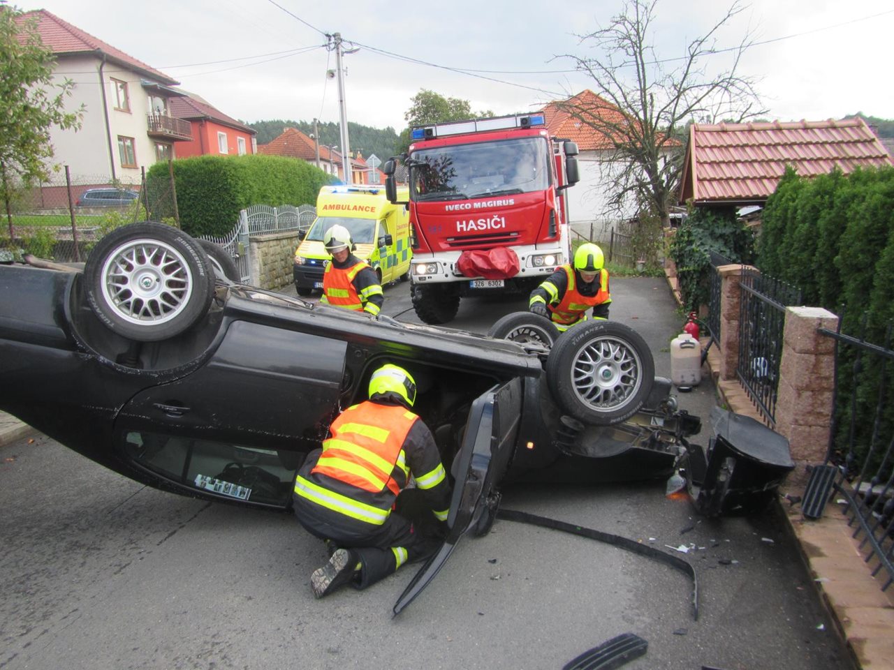 V úterý , 2. 10. 2018, patnáct minut po druhé hodině odpolední vyslal operační důstojník jednotku z Valašských Klobouk do obce Drnovice na Zlínsku k hlášené havárii osobního vozidla.  Jednotka po svém příjezdu provedla průzkum místa události, přičemž zjistila, že zde havaroval řidič, jedoucí ve vozidle sám, jehož vozidlo narazilo do plotu rodinného domu a po nehodě skončilo na střeše. Z vozidla unikaly provozní kapaliny, které hasiči zasypali sorbentem. Taktéž u vozidla provedli protipožární opatření. Řidič při nehodě utrpěl zranění a skončil v péči záchranářů, kteří jej odvezli do nemocnice k podrobnému vyšetření. Taktéž se na místo dostavili dopravní policisté, kteří si převzali šetření příčiny nehody. Po jejich zadokumentování události hasiči pomocí navijáku převrátili vozidlo zpět na kola. Opět zasypali komunikaci sorbentem, neboť z vozidla unikaly další provozní kapaliny a odpojili autobaterii. Ze strany příbuzného zraněného řidiči byl zajištěn odtah vraku vozidla. Poté hasiči uklidili vozovku od střepů a úlomků z vozidla a odklidili použitý sorbent. Krátce po páté hodině odpolední se vrátili zpět na svou stanici. Po celou dobu zásahu složek integrovaného záchranného systému byla komunikace obousměrně uzavřena a policisté odkláněli dopravu po objízdné trase. Zdroj : por. Mgr. Lucie Javoříková, tisková mluvčí HZS Zlínského kraje Foto: HZS Zlínského kraje FOTOGALERIE
