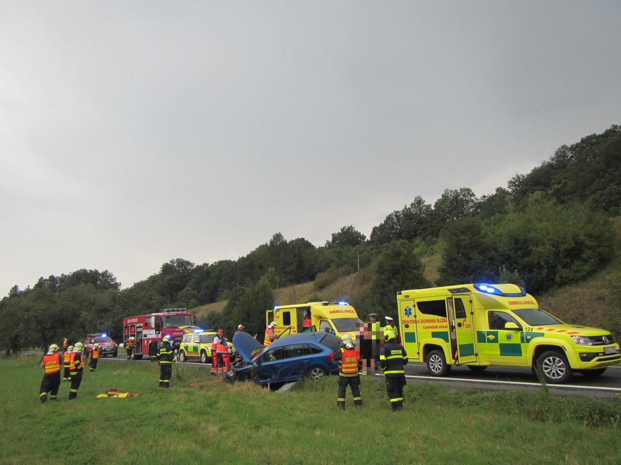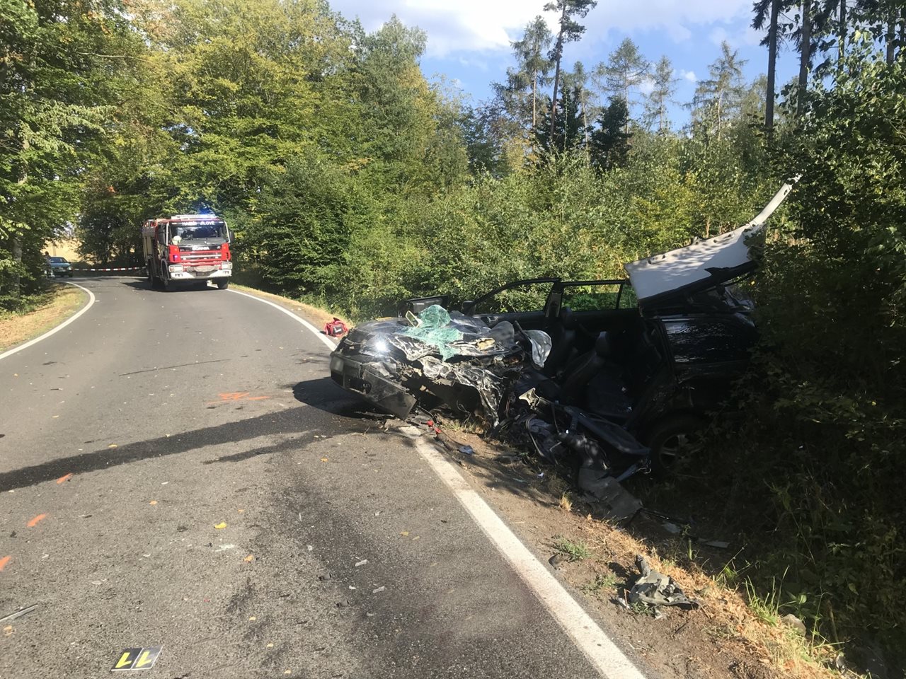 V neděli 29. července 2018 několik minut před patnáctou hodinou byla na linku tísňového volání HZS Středočeského kraje oznámena vážná dopravní nehoda dvou osobních vozidel na silnici číslo 104 za vjezdem do lesního úseku ve směru od Jílového u Prahy směrem k obci Petrov. Operační důstojník k události vyslal profesionální hasiče ze stanice HZS Jílové, kteří byli na místě za šest minut od ohlášení. V době jejich příjezdu se v jednom z havarovaných automobilů nacházel zaklíněný řidič, kterému několik lidí z kolem projíždějících vozidel už poskytovalo první pomoc i nepřímou masáž srdce. Hasiči ihned začali zaklíněného řidiče vyprošťovat pomocí hydraulického vyprošťovacího zařízení. Po vyproštění a předání do péče posádky zdravotnické záchranné služby jeho resuscitace pokračovala. Asi po čtyřiceti minutách byla resuscitace ukončena a lékař konstatoval exitus. Další dvě zraněné osoby byly transportovány pozemní cestou do nemocnice. Hasiči dále zajistili místo nehody, provedli protipožární opatření na vozidlech a po zadokumentování nehody kriminální a dopravní polici bylo provedeno vyproštění vozidel a následný úklid vozovky. Po celou dobu zásahu byla silnice zcela uzavřena, alespoň kyvadlový provoz byl obnoven až po devatenácté hodině. Zdroj: nprap. Petr Svoboda, oddělení IZS Tiskový odbor :HZS Středočeského kraje Foto:HZS Středočeského kraje FOTOGALERIE