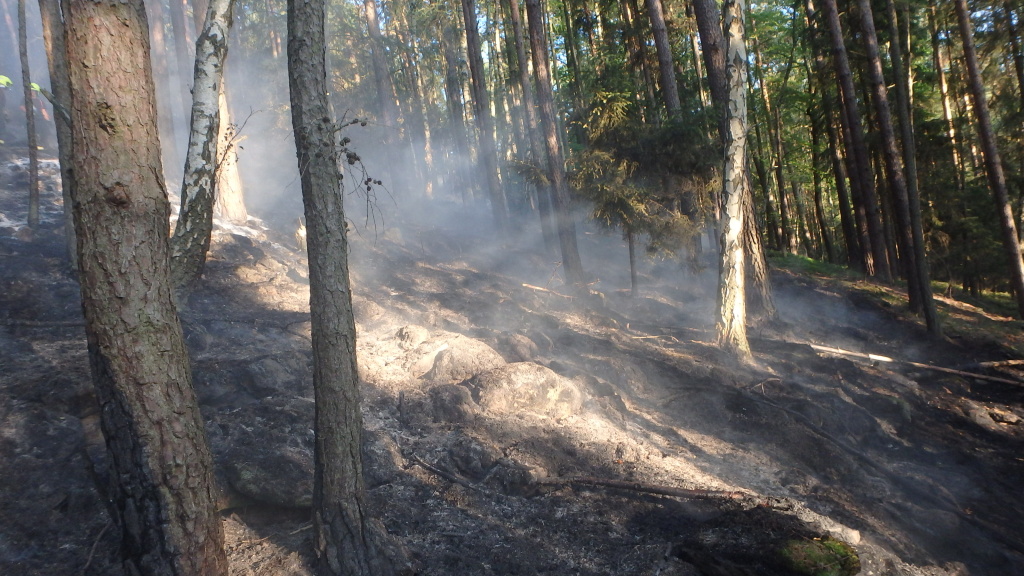 Na katastrálním území části obce Hájemství došlo ve čtvrtek 26.7. 2018, k požáru lesního porostu na ploše asi 1,5 hektaru. Na místo bylo povoláno celkem osm jednotek požární ochrany a na základě toho byl vyhlášen druhý poplachový stupeň. Oznamovatel měl vidět kouř vycházející z lesa. Hasiči nejprve provedli průzkum, aby zjistili, odkud kouř vychází a jaká je příčina. Místo požáru bylo obtížné nalézt a terén pro příjezd hasičské techniky byl náročný. Po příjezdu na místo bylo zjištěno, že hoří suchá tráva, lesní hrabanka a jehličnaté podúrovňové stromy ve vysokokmenném lese. Požárem byly zasaženy též spodní části kmenů jehličnatých stromů (borovice, modříny, smrky atd.). Jednotkám se podařilo požářiště obehnat a začaly postupně okopávat okolní půdu, aby se nemohl oheň rozšířit dál. Požár se podařilo zlikvidovat až po více než šesti hodinách zásahu. Hasební zásah byl složitý v tom, že hasiči zasahovali ve stráni, která byla pokrytá kameny a spadlými větvemi. Požár byl uhašen nasazením několika proudů C a vysokotlakou vodou. Voda na místo požáru byla dopravována kyvadlovou dopravou z přehrady Les Království, kde bylo zřízeno čerpací stanoviště. Na místě události bylo nalezeno ohniště ohraničené kameny. Příčinou požáru bylo nedbalostní jednání nezjištěné osoby, která manipulací s otevřeným ohněm způsobila požár. Přímá škoda způsobená požárem byla předběžně vyčíslena na částku cca 6 tisíc korun, uchráněné hodnoty byly odhadnuty na 70tisíc korun. Při požáru nebyl nikdo zraněn. Zdroj: por. Mgr. Martina Götzová Foto: HZS Královéhradeckého kraje FOTOGALERIE