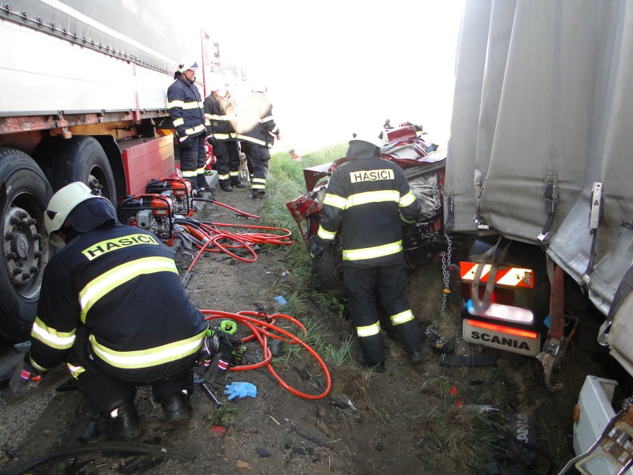 Po vážné nehodě dvou osobních a dvou nákladních vozidel museli hasiči vyprostit pět osob