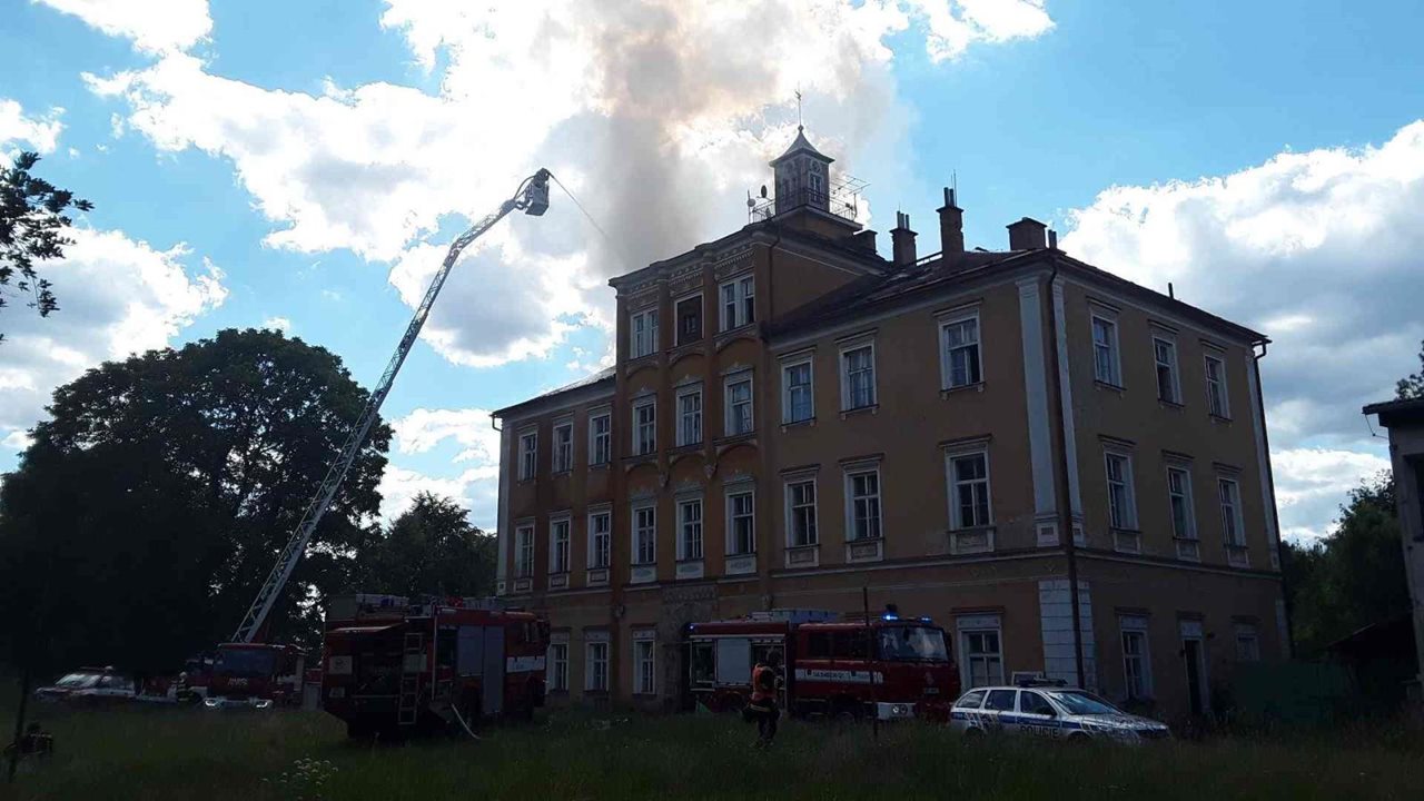 V pondělí 2. července 2018 byl v 15:15 hodin oznámen na operační středisko HZS Olomouckého kraje požár bývalého zámku v obci Dolní Studénky - Třemešek na Šumpersku. Na místo vyjeli profesionální hasiči ze Šumperku a ze Zábřehu a dobrovolní hasiči ze Šumperku - Temenice, Bludova a Nového Malína. Již v době jízdy k zásahu bylo vidět šlehající plameny a hustý černý dým valící se ze střechy zámku. Hasiči po příjezdu zjistili, že požárem je zasažena asi polovina střechy a půdní prostor bývalého zámečku. Hasební zásah hasiči prováděli jak pomocí výškové techniky z vnější strany budovy, tak také z půdních prostor. Silný hustý dým si vyžádal zásah hasičů v dýchací technice, proto velitel zásahu povolal na místo protiplynový automobil ze stanice v Olomouci, který hasičům doplňoval dýchací přístroje. V 17:16 hodin hlásil velitel zásahu lokalizaci, v průběhu likvidačních prací hasiči vynášeli ohořelý materiál z půdního prostoru a dohašovali ho, vyhledávali skrytá ohniska, která prolévali vodou a po 20. hodině se začaly jednotky postupně vracet zpět na své základny. Na místě požáru byli zástupci obce a památkového úřadu. Při požáru nebyl nikdo zraněn, evakuována byla jedna osoba. Na místě požáru pracoval také vyšetřovatel, který bude zjišťovat, co stojí za příčinou vzniku požáru. Výše škody byla upřesněna na 1,5 milionu korun, hasiči svým zásahem uchránili majetek v hodnotě 7 milionů korun. Zdroj: por. Bc. Ing. Vladimíra Hacsiková, tisková mluvčí - HZS Olomouckého kraje Foto: HZS Olomouckého kraje FOTOGALERIE