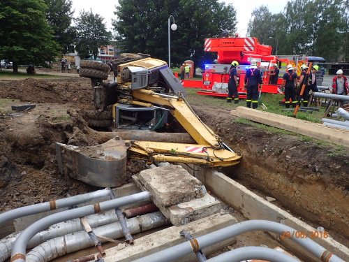 Dvě jednotky profesionálních hasičů (HZS MSK) zasahovaly v pátek 29.6.2018 odpoledne v Karviné-Hranicích, kde se na měkkém podloží převrátil bagr na bok do výkopu s plynovým a teplovodním potrubím a při nešetrném vyprošťování hrozilo poškození inženýrských sítí. Téměř po třech hodinách cizelérské činnosti hasičů byl stavební stroj vytáhnut mimo výkop pomocí těžké hasičské techniky - bez porušení potrubí. Operační středisko hasičů bylo o nehodě, která se obešla bez zranění, informováno v pátek po 13. hodině. Do ulice Rudé armády vyjely dvě jednotky Hasičského záchranného sboru Moravskoslezského kraje (HZS MSK) - ze stanic Karviná a Havířov, včetně vyprošťovacího speciálu na podvozku Tatra 815 (KI) a automobilového jeřábu AJ AC40 Demag/Terex (HAV). Bagr se vyvrátil ve výkopu na bok a nad funkčním potrubím jej držela pouze jeho vlastní hydraulická ruka lžíce. Ze stavebního vozidla unikalo přes víčko nádrže minimální množství nafty, která byla zachytávána do vědra (asi 3 litry). Proto byl povolán na místo nehody zástupce odboru životního prostředí karvinského magistrátu. Byli zde i zástupce stavební firmy a majitel bagru. Automobilový jeřáb hasičů bagr zajistil a pomalu vyzvedl kousek nad potrubí. Z boku jej jistila i vyprošťovací Tatra. Hasiči pod hydraulický systém lžíce bagru podložili - jako ochranu před případným pádem stroje – dlouhé a pevné dřevěné hranoly. Ve druhé fázi vyproštění šlo o opatrnou a pomalou součinnost mezi hasičskou Tatrou a jeřábem, který stavební stroj zvedal, když byl bagr nakonec postaven na pevnou plochu na kola a strojník obsluhy jej nastartoval. Na posyp drobného úniku provozních kapalin hasiči použili nasákavý sorbent. Zdroj: Petr Kůdela, tiskový mluvčí - HZS Moravskoslezského kraje Foto: HZS Moravskoslezského kraje FOTOGALERIE