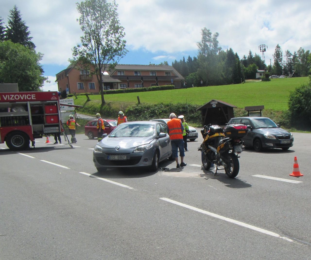 V neděli 1. července 2018 v 00:34 hodin byl na tísňovou linku HZS Středočeského kraje ohlášen požár dřevníku u motorestu v Jílovišti před vjezdem do Prahy po strakonické dálnici. Operační důstojník k události nedaleko vysílače Cukrák vyslal profesionální hasiče ze stanice HZS Řevnice a jednotky sboru dobrovolných hasičů obcí Jíloviště a Dobřichovice. Protože další volající vzápětí uvedl, že na místě došlo k nějaké explozi a požár se rychle rozšiřuje, byl vyhlášen poplach také jednotkám sboru dobrovolných hasičů Mníšek pod Brdy a Jinočany. V rámci mezikrajské pomoci vyjela i jednotka HZS hlavního města Prahy ze stanice Radotín. V době příjezdu první jednotky byla část třípatrové budovy zcela v plamenech a požár rychle nabíral na intenzitě. Hasičům se podařilo požár pomocí čtyř C proudů z vnější části budovy a jedním C proudem uvnitř objektu lokalizovat v 01:23 hodin. V průběhu zásahu byly z budovy vyneseny tři propanbutanové tlakové láhve. V další fázi následovalo vyhledávání skrytých ohnisek pomocí termokamery a jejich dohašování, tyto práce trvaly až ranních hodin. V průběhu dopoledne přizval vyšetřovatel HZS Středočeského kraje na místo experty z Technického ústavu požární ochrany a také policejního kynologa se psem vycvičeným na vyhledávání akcelerantů hoření. Příčina vzniku požáru je předmětem dalšího vyšetřování, ale vše nasvědčuje tomu, že byl objekt zapálen úmyslně. Škoda vzniklá požárem byla původně vyčíslena na 12 milionů korun, ale po prohlídce požářiště byla snížena na 4 miliony. Včasným zásahem a nasazením potřebného počtu sil a prostředků se hasičům podařilo uchránit hodnoty za přibližně 8 milionů korun. V době požáru nebyly v motorestu ubytované žádné osoby a celá událost se obešla bez zranění. Zdroj: nprap. Petr Svoboda, oddělení IZS Tiskový odbor :HZS Středočeského kraje Foto:HZS Středočeského kraje FOTOGALERIE