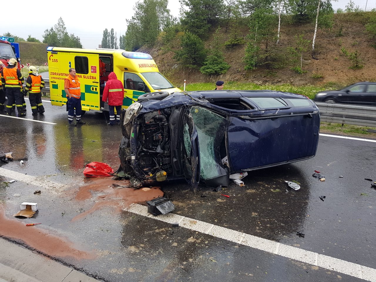 Ve středu 13. června 2018, osm minut po osmé hodině ranní přijalo Krajské operační a informační středisko HZS Středočeského kraje informaci o vážné nehodě osobního vozidla na dálnici D4 nedaleko Příbrami ve směru z Prahy do Strakonic. K události vyjela jednotka profesionálních hasičů ze stanice HZS Příbram s cisternovou automobilovou stříkačkou a vyprošťovacím automobilem. Místo nehody bylo v prostoru dálniční křižovatky Skalka na 41. kilometru kousek za nájezdem od Příbrami. Havarované osobní vozidlo se po smyku na mokré vozovce převrátilo přes střechu a zůstalo ležet na boku mezi oběma jízdními pruhy. Při příjezdu hasičů byl těžce zraněný řidič, který z auta při nehodě vypadl rozbitým oknem, už v péči posádky zdravotnické záchranné služby. Vzhledem k charakteru poranění byl na místo přivolán vrtulník Letecké záchranné služby Policie ČR. Dálnice ve směru do Strakonic byla uzavřena. Hasiči vyndali z vozidla baterii, zasypali rozlité provozní kapaliny sorbentem a zamezili jejich úniku do kanalizace. Následně asistovali při naložení pacienta do vrtulníku, který s ním odletěl do motolské nemocnice. Po došetření a zadokumentování nehody dopravní policií jednotka pomohla s naložením havarovaného vozidla na odtahovou službu a pak uklidila vozovku. V 10.40 hodin byl zásah ukončen a hasiči odjeli na svou základnu. Zdroj: por. Ing. Ladislav Holomčík, tiskový odbor HZS Středočeského kraje Foto:HZS Středočeského kraje Video: FOTOGALERIE