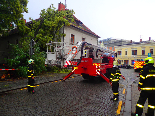 Celkem k 16 pádům stromů a nebezpečných větví vyjely jednotky profesionálních a dobrovolných hasičů v Moravskoslezském kraji od brzkého úterního rána, 12.6.2018, do 11 hodin. Tyto události se obešly bez zranění i větších škod, pouze ve Frýdlantu nad Ostravicí (okres Frýdek-Místek) spadla část jedle o průměru kmene 8 cm na dva zaparkované automobily a v centru Opavy velká lípa poškodila střechu církevní budovy. Po čtyřech výjezdech mají na kontě hasiči v okresech Opava a Nový Jičín, po dvou v Ostravě, na Karvinsku, Bruntálsku i Frýdecko-Místecku. Je to zřejmě následek nočních a hlavně ranních bouřek s vydatnými srážkami a poryvy větru. Před úterním polednem už nebyl zaznamenán ani jeden takový výjezd. Dvě jednotky hasičů (HZS MSK Bílovec a JSDHO Studénka) odstraňovaly v úterý ráno ve Studénce (okres Nový Jičín) v Nádražní ulici 25 metrů vysoký jasan, který spadl na hospodářskou budovu.   V centru Opavy v ulici Rybí trh spadla v úterý ráno 15 metrů vysoká lípa, v dolní části uhnilá, na objekt římskokatolické diecéze a poškodila jeho střechu. Přijela ji odstranit jednotka HZS MSK ze stanice Opava – i s pomocí automobilové plošiny AP 27 Tatra 148 a jeřábu Demag/Terex Zdroj: Petr Kůdela, tiskový mluvčí - HZS Moravskoslezského kraje Foto: HZS Moravskoslezského kraje FOTOGALERIE