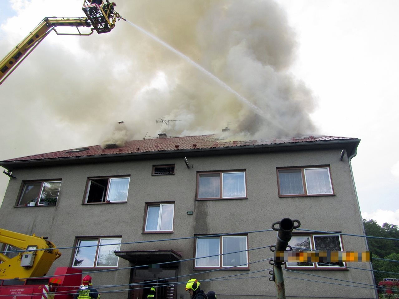 1. 6. 2018, krátce před půl třetí odpoledne přijali hasiči žádost o pomoc při požáru několikapatrového bytového domu v obci Vigantice na Vsetínsku. Na místo byla okamžitě vyslána jednotka profesionálních hasičů ze stanice Valašské Meziříčí, jednotka města Rožnov pod Radhoštěm a jednotky dobrovolných hasičů obcí Hutisko-Solanec a Vigantice. Po příjezdu na místo a provedení prvotního průzkumu bylo velitelem potvrzeno, že požár zasáhl podkrovní bytové prostory a střechu několikapatrového domu. Všechny osoby se již naštěstí nacházely mimo zasažené prostory. Okamžitě byl vyhlášen 2. stupeň poplachu a byly povolány další posilové jednotky z Prostřední Bečvy, Zubří, Zašové a Valašské Bystřice. K události vyjel také velící důstojník směny ze Zlína. Postupně se tak na místo dostavilo celkem 8 cisternových vozů a dva kusy výškové techniky. Ihned po příjezdu byly zahájeny hasební práce. Do budovy pronikli hasiči v dýchací technice vnitřním prostorem přes schodiště a nasazena byla také výšková technika. Dva obyvatelé domu se nadýchali zplodin hoření, a na místo byla proto povolána zdravotnická záchranná služba, která si je převzala do své péče. Po lokalizaci požáru byly prostory zkontrolovány termokamerou a byla dohašena veškerá skrytá ohniska. V 18:31 hodin ohlásil velitel zásahu celkovou likvidaci požáru. K události se dostavil také vyšetřovatel hasičů, který bude nyní ve spolupráci s policií zjišťovat přesné příčiny vzniku události a výši způsobené škody. Zdroj: kpt. Ing. Pavel Řezníček – HZS Zlínského kraje, Foto: HZS Zlínského kraje FOTOGALERIE