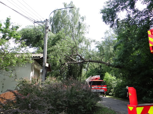 Ostravští hasiči odstranili strom na drátech v Proskovicích jeřábem a plošinou