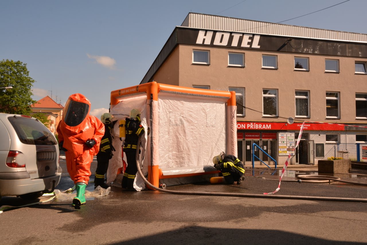 Ve středu 9. května 2018 krátce před osmou hodinou byl na tísňovou linku středočeských hasičů nahlášen únik čpavku ze strojovny chlazení na zimním stadionu v Příbrami. Na místo byly vyslány jednotky profesionálních hasičů z Příbrami a Dobříše s pěti vozidly, včetně speciálního protiplynového automobilu a dekontaminačního přívěsu. Současně byla k události vyžádána Policie ČR a zdravotnická záchranná služba. Po příjezdu na zimní stadion naměřil velitel zásahu u vchodu do areálu zvýšenou koncentraci čpavku. Proto vyhlásil druhý stupeň poplachu a povolal posily. Zároveň nechal dokončit evakuaci osob a stanovil režimová opatření s ohledem na pohyb osob uvnitř a v okolí objektu. Na místo postupně vyrazily jednotky sboru dobrovolných hasičů Příbram VI-Březové Hory, Trhové Dušníky, Rožmitál pod Třemšínem, Ohrazenice, Dolní Hbity, Obecnice a Milín. Skupina hasičů v maximální protichemické ochraně, tzn. v dýchací technice a přetlakovém protichemickém obleku, vstoupila do kontaminované místnosti s vysokou koncentrací plynného čpavku. Zde za extrémně špatné viditelnosti způsobené uniklým amoniakem hasiči prováděli zkrápění vodní mlhou a následně i uzavření armatur. Vodní mlhu vytvářely jednotky i vně zimního stadionu, aby se zamezilo úniku štiplavého plynu dál do okolí. Na místo se dostavila výjezdová skupina chemické laboratoře HZS Středočeského kraje z Kamenice, která krátce před jedenáctou hodinou potvrdila úspěšnost zvolené taktiky a zastavení úniku nebezpečné látky. Velitel zásahu spolupracoval také s vodoprávním úřadem a provozovatelem zimního stadionu. O události byl informován i příbramský starosta, který se dostavil na místo. Na odčerpání čpavkové vody z havarijní jímky byla přizvána odborná firma se speciálním cisternovým automobilem. Následně proběhlo ve všech částech stadionu kontrolní měření, které výskyt čpavku uvnitř objektu nepotvrdilo. V pět hodin odpoledne bylo místo zásahu předáno zástupci provozovatele a jednotky se začaly vracet na své základny. Ve čtvrtek v dopoledních hodinách bude celý objekt opět zkontrolován. Zdroj: kpt. Ing. Jaroslav Gabriel – tiskový odbor HZS Středočeského kraje Foto:HZS Středočeského kraje