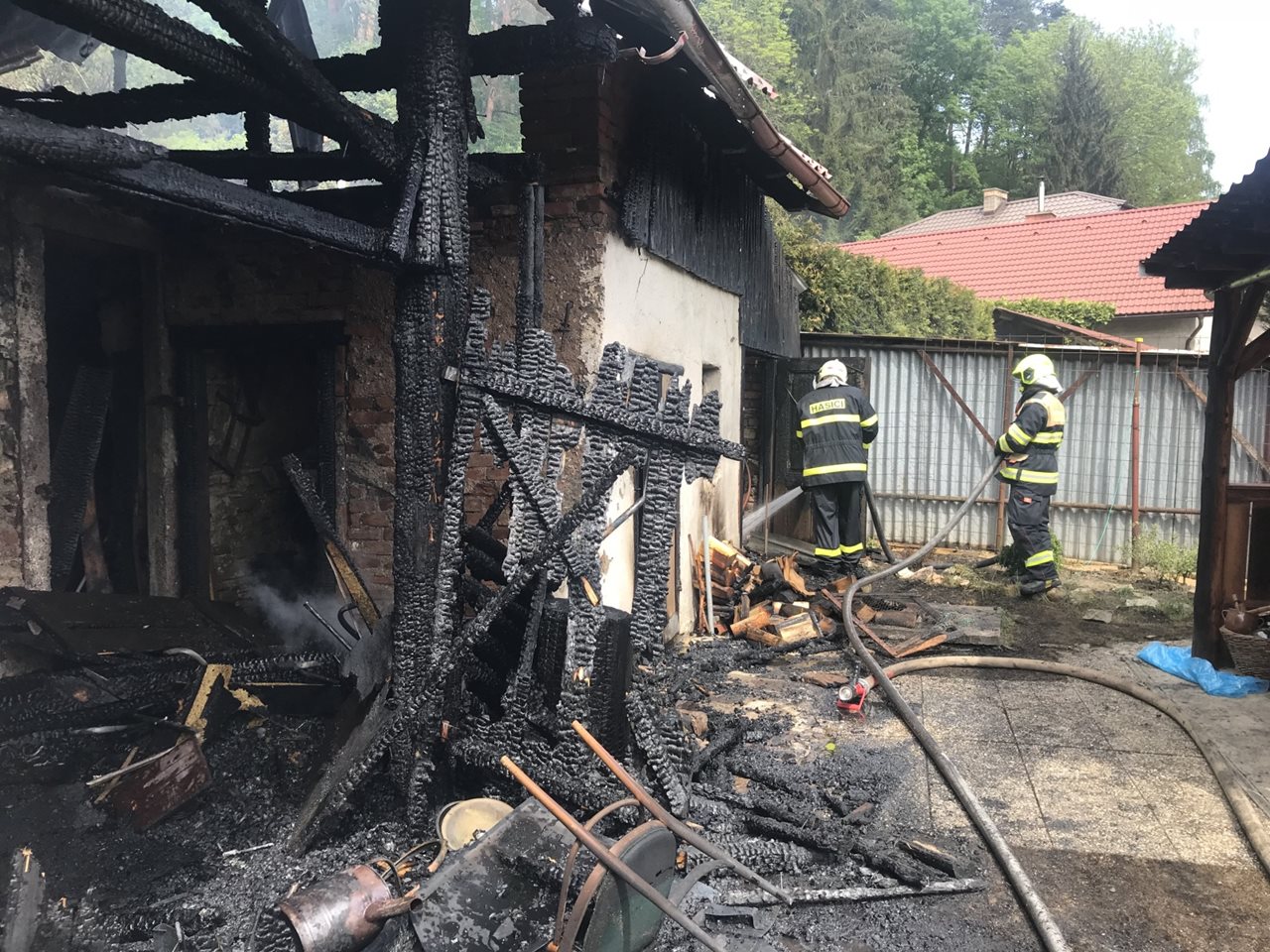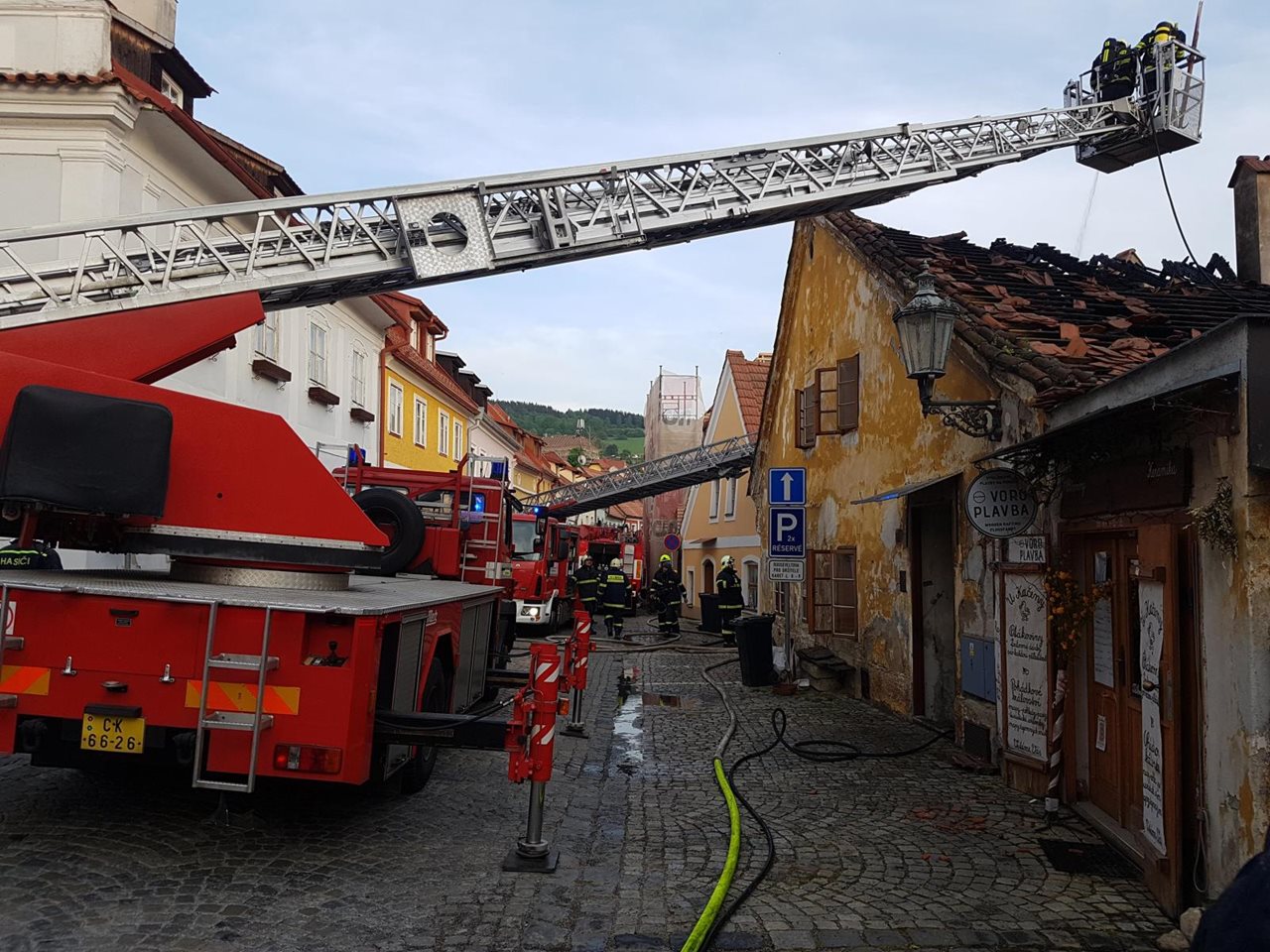 Jako požár kůlny byl 2. května 2018 ohlášen požár v Rooseveltově ulici v Českém Krumlově. K požáru v 16:30 hodin vyjeli včetně výškové techniky profesionální hasiči z českokrumlovské stanice, svolána byla českokrumlovská dobrovolná jednotka. Mezitím policisté upřesnili informaci, že hoří kolna, ale požár se rozšířil i na další dva domy. Pak společně s městskými strážníky uzavřeli silnici, aby tam mohly najíždět další vozy hasičů. Jako posilové jednotky do Rooseveltovy ulice vyjeli dobrovolní hasiči obce Velešín a Chvalšiny a další cisterny profesionálních hasičů ze stanice Český Krumlova a také stanic České Budějovice, Kaplice a Křemže. Na pomoc vyjela se svými cisternami také Vojenská hasičská jednotka z Boletic. V 17:46 hodin operační středisko hasičů vzhledem k rozsahu události a množství povolané techniky vyhlásil druhý stupeň požárního poplachu. Ohnisko požáru bylo skutečně v kolně. Ta stála v těsné blízkosti hotelu a rodinného domu. Požár se z kolny rozšířil na oba směry a po fasádách domů se dostal až do střech. Ničil jak podkroví domů, tak celé střechy včetně krovů. Hasiči ihned zahájili hasební práce. V rámci průzkumu zjistili, že ani v jednom z domů nikdo není. Všichni se stihli samoevakuovat ještě před příjezdem jednotek. Nikdo nebyl zraněn. Zásadním úkolem hasičů bylo zabránit šíření požáru na další domy. Následně po lokalizaci požáru, kdy požár likvidovalo dostatečné množství jednotek a požár byl zcela pod jejich kontrolou, hasiči pokračovali v dohašování. Kompletně zničené krovy museli hasiči postupně zbavit střešní krytiny a následně strhnout. Další ohniska, která hasiči prolévali vodou, se našla pomocí termokamery. Úplnou likvidaci požáru velitel zásahu nahlásil v 21:03 hodin. Extrémně náročný zásah z důvodu dlouhé doby trvání, náročnosti na pohyb techniky v úzkých uličkách či dopravy vody čerpáním z Vltavy, hasiči vedli v dýchací technice. Vytvořili několik vodních proudů, které vedli jak vnitřkem obou domů, tak z vnějšku z automobilového žebříku. Co bylo příčinou vzniku požáru bude předmětem šetření v následujících dnech, stejně tak jako vyčíslení vzniklých škod. Zdroj: Vendula Matějů –tisková mluvčí Jihočeský kraj Foto: HZS Jihočeský kraj FOTOGALERIE